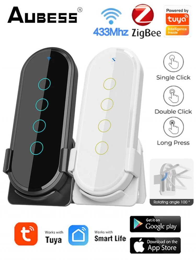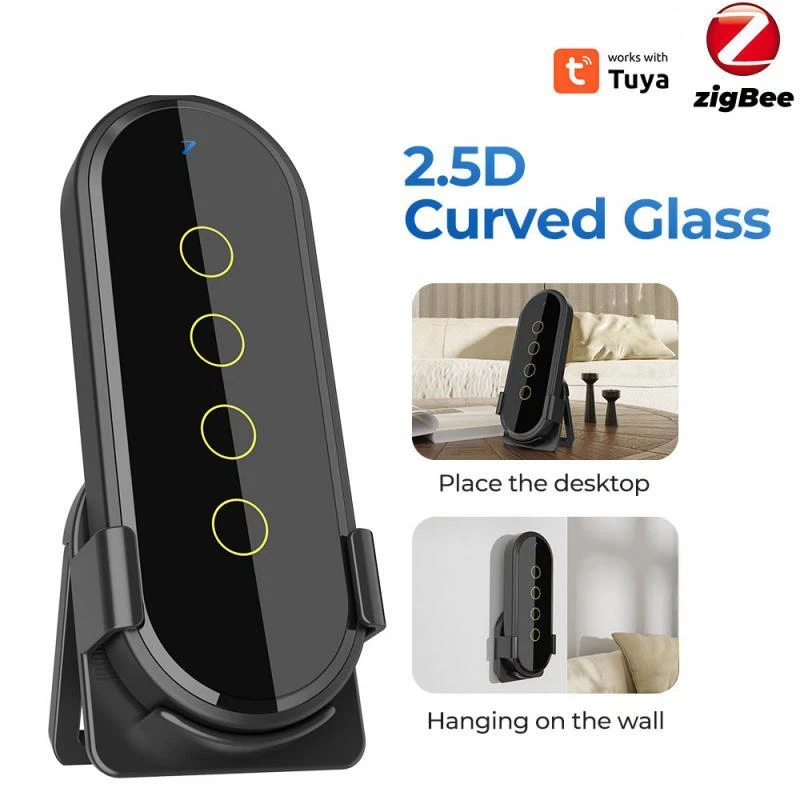 Tuya ZigBee Wireless Smart Switch 4 Gang Wireless Remote Control Touch Glass Panel Smart Home Suitable For Mulity RF433 Deveics Description: RF433 Switch: Modulation method: ASK Transmission frequency: 433,92 MHz Encoding method: Learning code EV 1527 Product size (per piece): 11.8 * 4.5cm Remote control battery: Cr2032 battery (including battery) Transmission distance: 30-50m (in open areas) Working voltage: DC 12V/27 ZigBee Switch: Battery: CR2032 battery (battery not included) Fluorescent: support Type: tuya zigbee Panel material: 2.5D tempered glass Remote control size:118*45*13.5mm Stand size: 62.5 * 50 * 23.2mm Specification: Features: RF433 Switch: DIY: The combination of remote control and wireless switch makes it more convenient and reasonable, with simple pairing and easy operation. It can turn various devices in the home into wireless remote control devices 2.5D high-definition tempered glass: In order to have a better feel, we have adopted higher cost curved tempered glass, which is more high-end. Fluorescent Function: The button will emit a faint light at night, indicating the position of each button. The faint light will not disturb the rest of family members Two fixation methods: It can be placed on the desktop freely or fixed to the wall with the built-in screws. Suitable for various application scenarios Long battery life: According to theoretical calculations, the CR2032 battery can be used for about 3 months (depending on the frequency of use) Control distance: 30~100M long distance (in open areas) Angle Adjustment: The bracket can be adjusted from 0 to 100 °, suitable for your optimal forehead angle 433MHz: Learning code (1527), with a transmission distance of 30-50m (in open spaces), brings you a new remote control experience and more convenience to your daily life. RF Pairing: Supports remote wireless control of your garage doors, electronic doors, appliances, and other remote control devices. (Only products with the same RF frequency are supported) Compact and Convenient: With a lightweight and compact design, the password key is very convenient for you to carry when going out. ZigBee Switch: 【Support zigbee wifi products】By APP setting, you can control zigbee or wifi products, including smart sockets, smart switches, smart bulbs, door magnets, temperature and humidity, etc. 【Three types of operation】Each button can be set to click, double click, long press function. 【Support a variety of function settings】Take the light bulb for example: you can set on or off, you can also set to adjust the brightness, you can also set to adjust the color. More functional operation, you can go to the APP settings 【2.5D HD Tempered Glass】 For better feel, we use the more expensive curved tempered glass, more high-end. 【Fluorescent function】The button will emit a faint bright light at night to indicate the location of each button, while the faint bright light will not disturb the rest of the family 【 Two fixing methods】Can be placed on the desktop at will or fixed on the wall using the screws that come with it. Suitable for various application scenarios 【Long battery life] using CR2032 batteries, after theoretical calculations can be used for about 3 months (specific and frequency of use has a relationship) 【Lanyard hole design】In order to prevent the remote control from being lost, it can be used with our Bluetooth anti-loss device to find the remote control more quickly (note that the anti-loss device needs to be purchased separately) 【Angle adjustment】The bracket can be adjusted from 0-100° to suit your best angle 【Share function】 share with family to control together 【Group function】 can close or open the group of devices together, more convenient Package Included: 1 set * (1 switch, 1 stand, 2 screws, 2 spiral tubes)