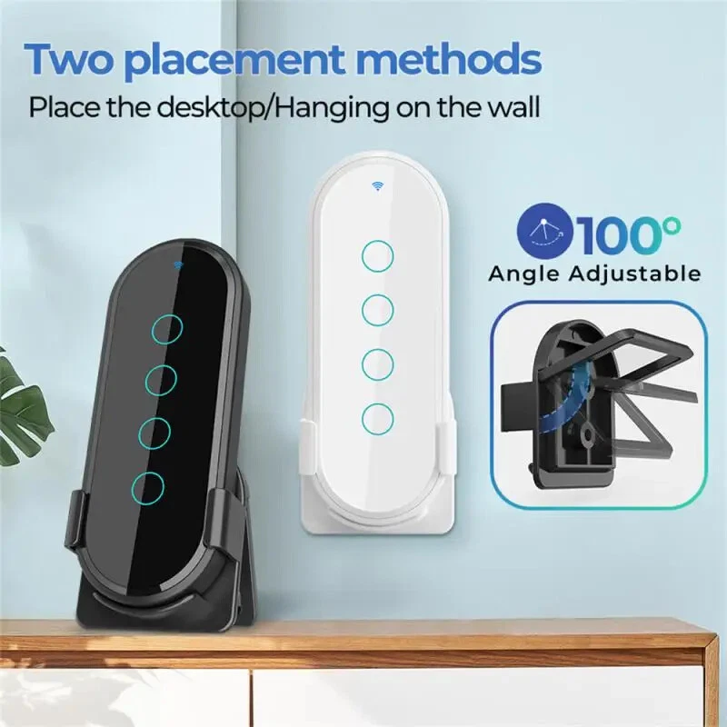 Tuya ZigBee Wireless Smart Switch 4 Gang Wireless Remote Control Touch Glass Panel Smart Home Suitable For Mulity RF433 Deveics Description: RF433 Switch: Modulation method: ASK Transmission frequency: 433,92 MHz Encoding method: Learning code EV 1527 Product size (per piece): 11.8 * 4.5cm Remote control battery: Cr2032 battery (including battery) Transmission distance: 30-50m (in open areas) Working voltage: DC 12V/27 ZigBee Switch: Battery: CR2032 battery (battery not included) Fluorescent: support Type: tuya zigbee Panel material: 2.5D tempered glass Remote control size:118*45*13.5mm Stand size: 62.5 * 50 * 23.2mm Specification: Features: RF433 Switch: DIY: The combination of remote control and wireless switch makes it more convenient and reasonable, with simple pairing and easy operation. It can turn various devices in the home into wireless remote control devices 2.5D high-definition tempered glass: In order to have a better feel, we have adopted higher cost curved tempered glass, which is more high-end. Fluorescent Function: The button will emit a faint light at night, indicating the position of each button. The faint light will not disturb the rest of family members Two fixation methods: It can be placed on the desktop freely or fixed to the wall with the built-in screws. Suitable for various application scenarios Long battery life: According to theoretical calculations, the CR2032 battery can be used for about 3 months (depending on the frequency of use) Control distance: 30~100M long distance (in open areas) Angle Adjustment: The bracket can be adjusted from 0 to 100 °, suitable for your optimal forehead angle 433MHz: Learning code (1527), with a transmission distance of 30-50m (in open spaces), brings you a new remote control experience and more convenience to your daily life. RF Pairing: Supports remote wireless control of your garage doors, electronic doors, appliances, and other remote control devices. (Only products with the same RF frequency are supported) Compact and Convenient: With a lightweight and compact design, the password key is very convenient for you to carry when going out. ZigBee Switch: 【Support zigbee wifi products】By APP setting, you can control zigbee or wifi products, including smart sockets, smart switches, smart bulbs, door magnets, temperature and humidity, etc. 【Three types of operation】Each button can be set to click, double click, long press function. 【Support a variety of function settings】Take the light bulb for example: you can set on or off, you can also set to adjust the brightness, you can also set to adjust the color. More functional operation, you can go to the APP settings 【2.5D HD Tempered Glass】 For better feel, we use the more expensive curved tempered glass, more high-end. 【Fluorescent function】The button will emit a faint bright light at night to indicate the location of each button, while the faint bright light will not disturb the rest of the family 【 Two fixing methods】Can be placed on the desktop at will or fixed on the wall using the screws that come with it. Suitable for various application scenarios 【Long battery life] using CR2032 batteries, after theoretical calculations can be used for about 3 months (specific and frequency of use has a relationship) 【Lanyard hole design】In order to prevent the remote control from being lost, it can be used with our Bluetooth anti-loss device to find the remote control more quickly (note that the anti-loss device needs to be purchased separately) 【Angle adjustment】The bracket can be adjusted from 0-100° to suit your best angle 【Share function】 share with family to control together 【Group function】 can close or open the group of devices together, more convenient Package Included: 1 set * (1 switch, 1 stand, 2 screws, 2 spiral tubes)