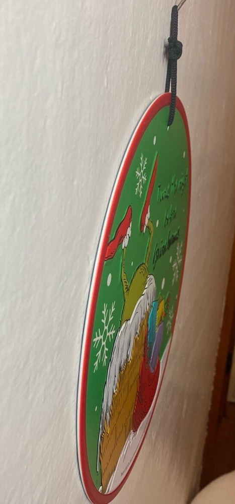 Excellent condition! 12x12 round This medium-sized round tin wall hanging features the Grinch character from Dr. Seuss Enterprises. The multicolor design depicts a scene ‘Twas the Night Before Grinchmas" and is perfect for Christmas decor. It can be hung on a wall, door, or any room. The item measures 12 inches in length and height, and weighs 9.2 ounces. Care instructions include cleaning with a damp cloth. It is ready to hang and adds a festive touch to your space.