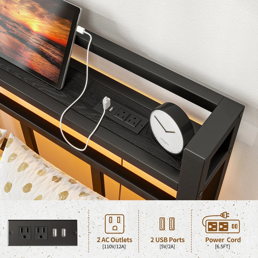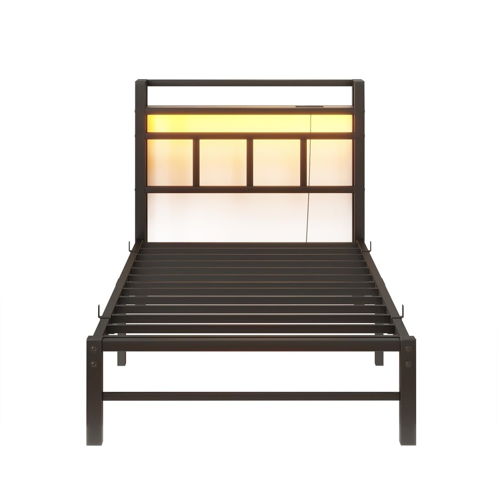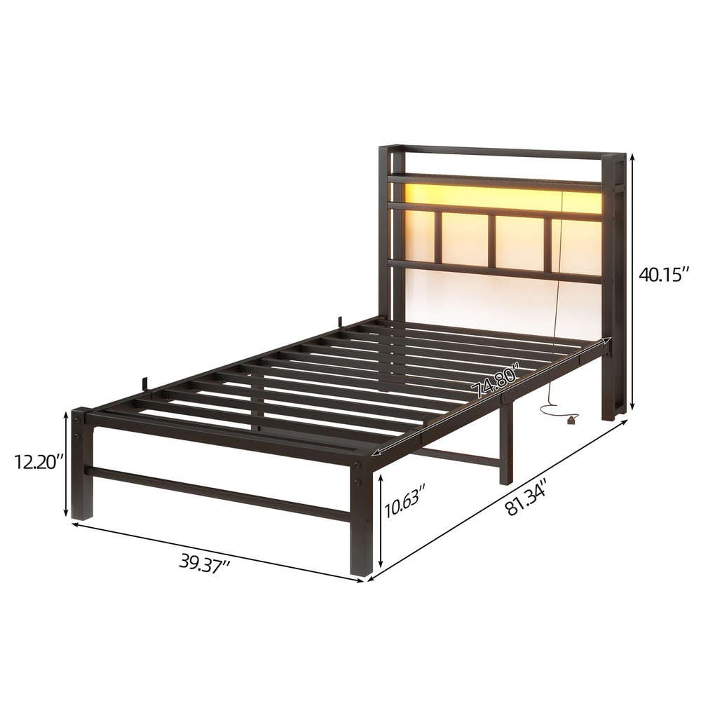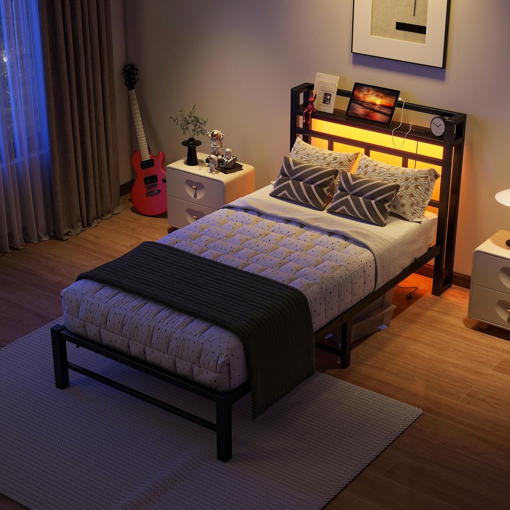Single Bed Frame with Storage Headboard,Twin Bed Frame with Charging Station and Lights Package contains: 1 x Bed Frame 1 x Charging Station 1 x Lights 1 x Enough Screws 1 x Instruction Manual 【Multi-functional Bed Frame:】The twin lights bed frame supports the headboard RGB lights, from gentle shimmer to party color, steady soft light to constant flashing color light. Multiple bed frame lighting modes create a wonderful ambiance to your liking and make the night colorful! 【Headboard Storage Shelves with Charging Station:】The black twin bed features convenient headboard shelves and charging station,which is easily charge your , , or other gadgets and offering easy access to essentials and extra space to showcase your favorite decor, such as phones, glasses, and books within easy reach. 【Sturdy Metal Slat Platform:】The single bed frame with headboard is made of high-quality metal and multiple legs for stability and durability; offer great mattress . No spring needed. 【Under-Bed Storage: 】Under thoughtfully designed of our metal bed frame,there is a 10.6-inch under-bed storage maximizes space, providing you maximize bedroom space and keep your room neat and tidy for belongings and effortlessly contributing to a neat and organized bedroom. 【Easy to assemble】The twin bed frame with storage comes flat-packed in for easy home assembly.All parts with clearly label,easy to assemble with very clear instructions for installation.the manual for standing towel rack for quick installation. 【Worry 】 Our bed frame come with worry-after-sales with parts. If you have any questions, please feel to ,we will reply to you within 24 hours.