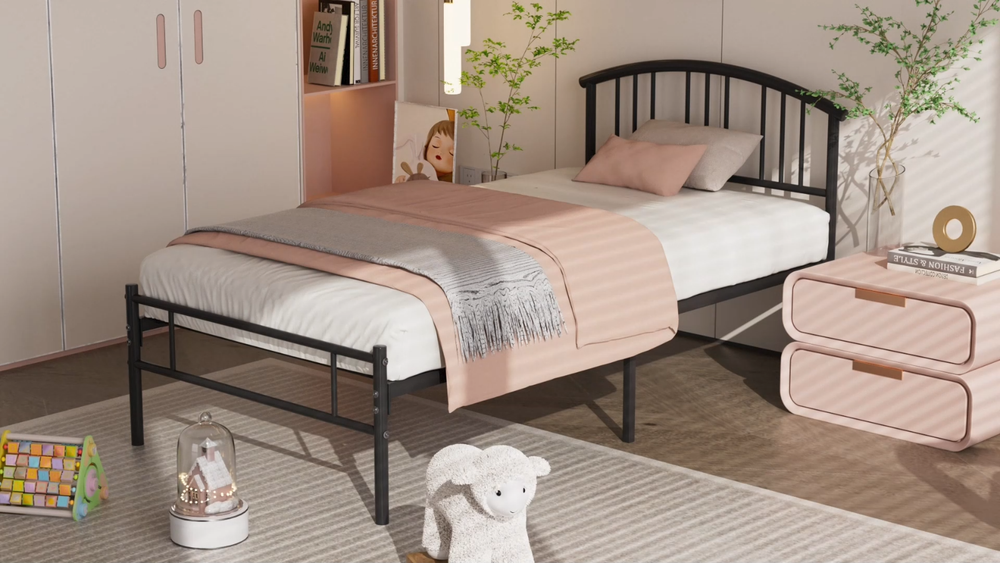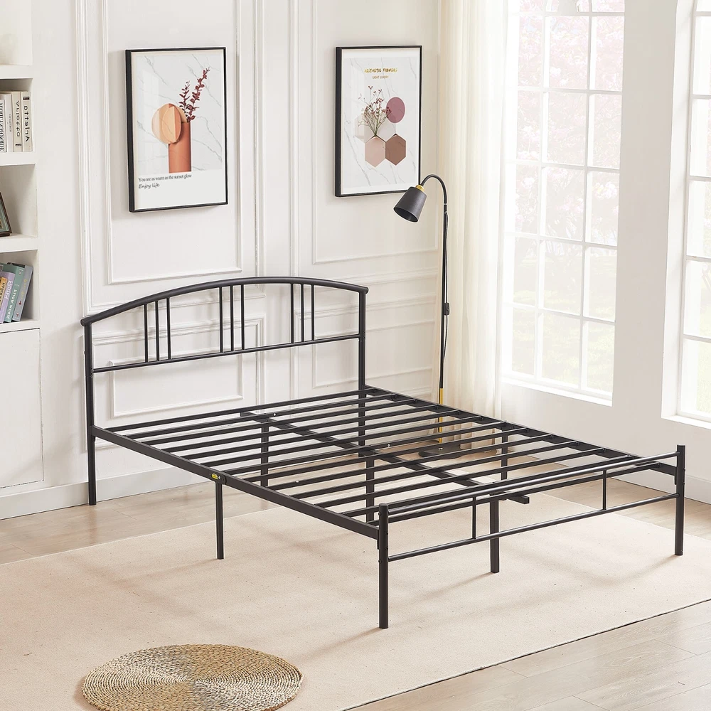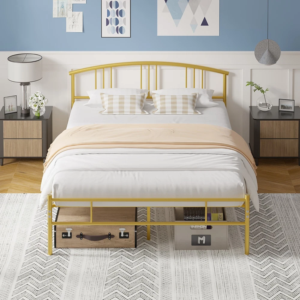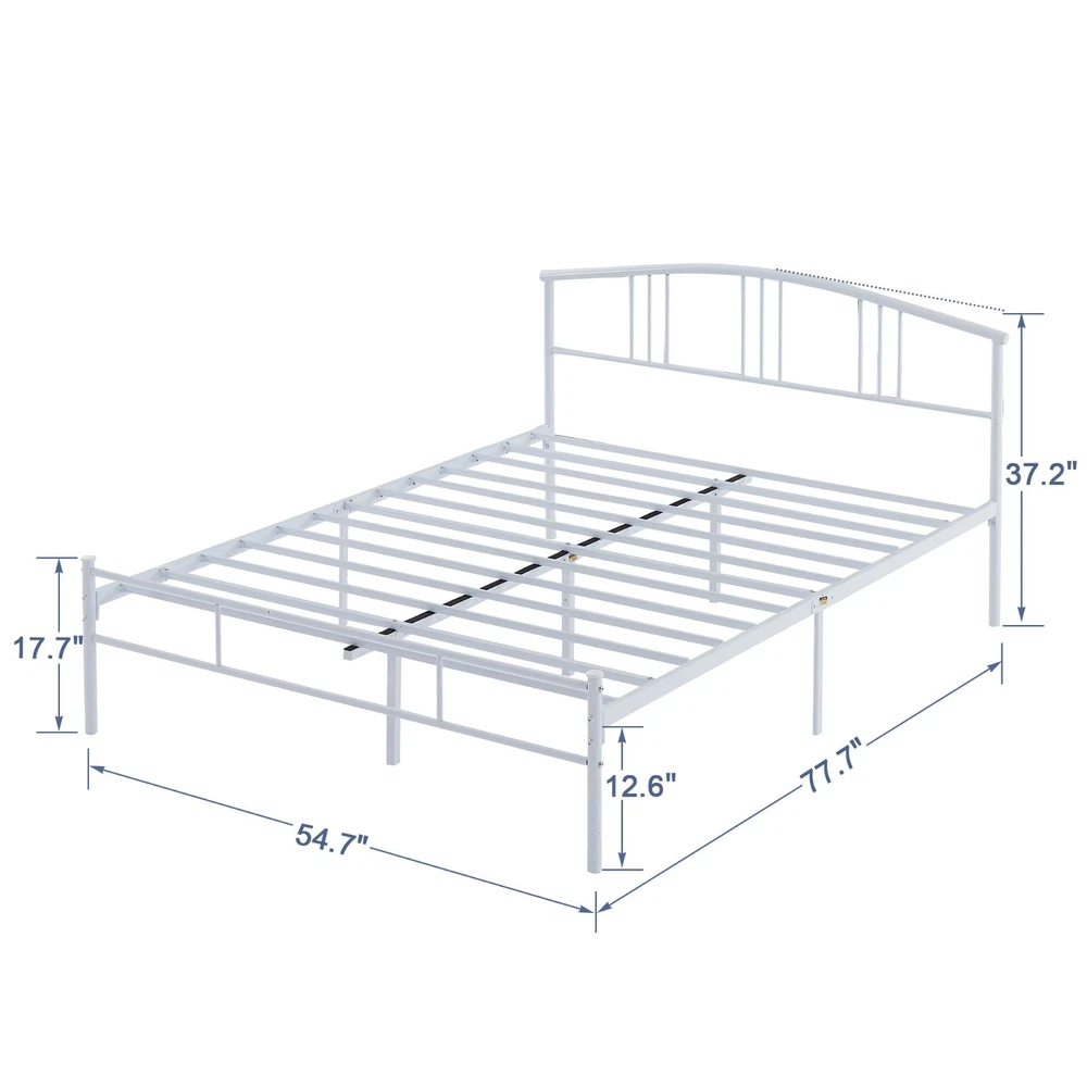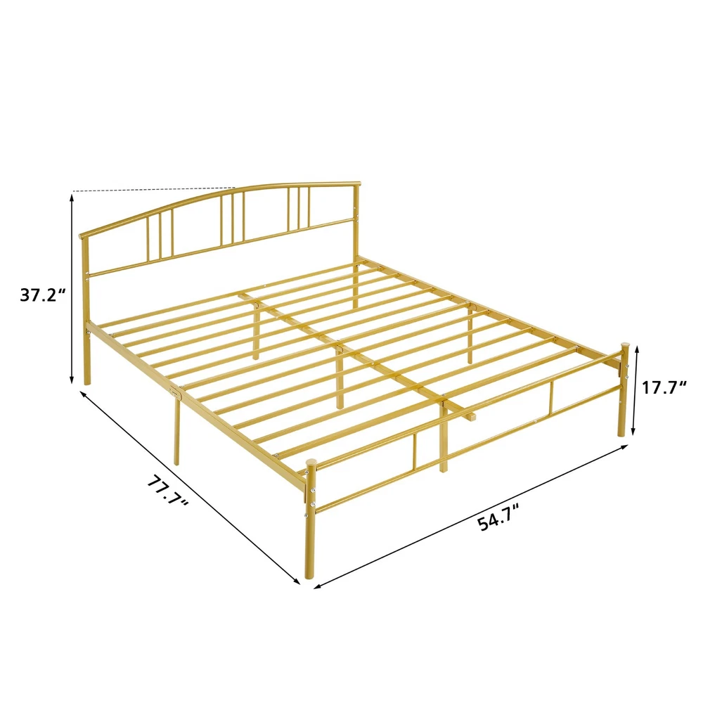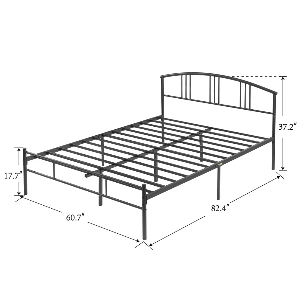 Features 【 Modern Style 】 This bed frame is designed with simple lines, and the curved design is more suitable for all simple decoration styles. The smooth coated surface prevents you from being scratched while sleeping or sitting on the bed. 【 Sturdy Construction 】 The bed frame is constructed of sturdy metal slats, side rails, and 9 solid legs, the metal bed legs are guaranteed for a lifetime of use and the head of the bed frame won't shake. Make sure there is no noise. 【 No Box Springs Needed 】 This bed frame allows your mattress to sit directly on the slats, no box springs required. Extend the life of the mattress and provide you with a comfortable sleeping experience. 【 Storage under the bed 】 12.4 inches of storage space under the bed, which can be used to organize your bedding and some unused tools. Make your room look tidy. 【 Easy to Assemble 】 Everything is included in the package, no additional tools are required, all parts are clearly labeled, one person can easily and quickly assemble and disassemble. Specifications of Twin Size: Material: Metal Frame Overall dimensions: 77.7"L x 39.4"W x 37.2" H Maximum weight capacity: 400 lb Ground clearance: 14'' Twin weight : 29 lb Specifications of Full Size: Material: Metal Frame Overall dimensions: 77.7" L x 54.7"W x 37.2"H Maximum weight capacity: 600 lb Ground clearance: 14'' Full weight : 38 lb Specifications of Queen Size: Material: Metal Frame Overall dimensions: 82.4" L x 60.7"W x 37.2"H Maximum weight capacity: 630 lb Ground clearance: 14'' Queen weight : 40.6 lb Packing list: 1 x Bed Frame 1 x Installation instructions (all accessories included, no need to prepare your own tools) Note: 1. Please allow ±1/0.5'' error due to manual measurement. 2. Mattress, box spring, and bedding (comforter, sheets, pillows, etc.) are NOT included.