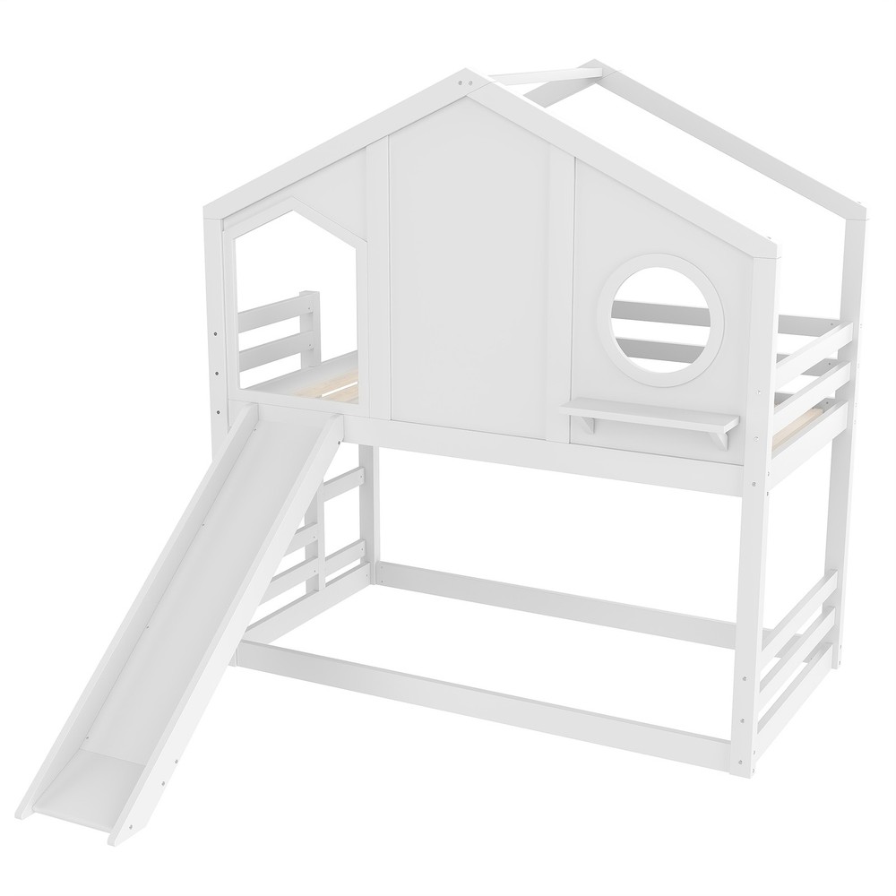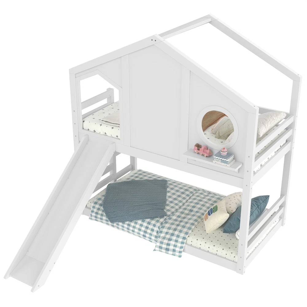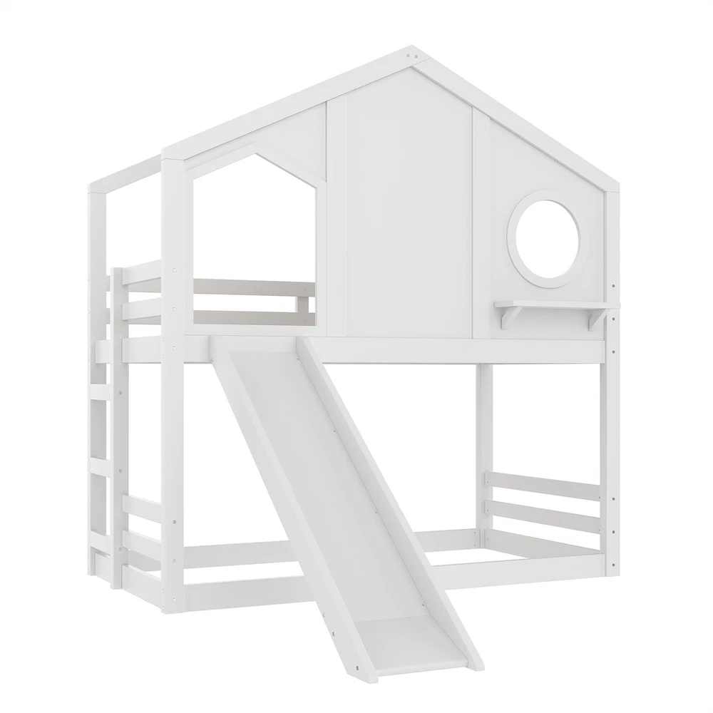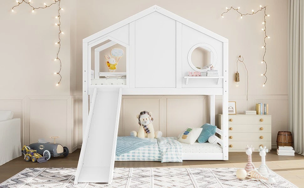 Twin House Bunk Bed w/Slide & Storage Shelves,Wood House Loft Bed w/Window White Features 【Playful House Design for Kids】This twin house bunk bed features a charming roofline and a built-in window, creating a fun and cozy play-and-sleep environment. Its childlike design sparks imagination and makes bedtime more enjoyable for kids. 【Fun Slide for Daily Play】Built with an engaging slide, this house bunk bed adds extra excitement to your child’s room. Kids can start their morning with playful energy, making the bed both a sleeping space and a mini playground. 【Solid Wood Construction】Crafted from high-quality solid wood, this bunk bed is sturdy, durable, and designed for long-term use. The stable frame and reinforced structure ensure a safe and reliable sleeping experience for children. 【Built-in Storage Shelves】Equipped with convenient storage shelves, the bed offers extra space for books, toys, and decorations. It helps keep your child’s room organized while maximizing floor space. 【Easy Assembly with Clear Instructions】All parts, tools, and a step-by-step illustrated manual are included. The straightforward design allows parents to assemble the bed quickly and efficiently. Descriptions Description Bring creativity and practicality together with this twin house bunk bed with slide and storage shelves, the perfect centerpiece for any child’s bedroom. Designed with a charming house-shaped roof and an adorable built-in window, this bunk bed creates a playful and cozy atmosphere where kids can sleep, imagine, and play freely. Kids will love the fun slide, adding excitement to everyday routines and turning their room into a joyful indoor playground. The solid wood construction ensures long-lasting durability and dependable stability, giving parents peace of mind. Along the side, built-in storage shelves offer a smart and accessible place for books, toys, and favorite decorations—helping maintain a clean and organized space. With all tools and detailed instructions included, assembling this child-friendly bunk bed is simple and convenient. Functional, safe, and full of childlike charm, this house bunk bed transforms any room into a warm and imaginative haven for kids. Weight & Dimensions Product Type Wood House Bunk Bed Color White Size Twin over Twin Material Pine Wood+Plywood+MDF Overall Product Dimension 78.7”L*41.3’’W*82.7”H Overall Product Weight 135.36 LBS Recommend Mattress Thickness of Bed 6’’ Weight Capacity 300 LBS for Upper Bed, 11 LBS for Shelf Number of Package 2 Package Dimension & Weight Please refer to the Specification Level of Assembly Full Assembly Needed Eligible for Hardware Packs Yes Country of Origin Vietnam Note All the pictures are taken by actual samples, slight chromatic aberration may occur due to lighting or display.