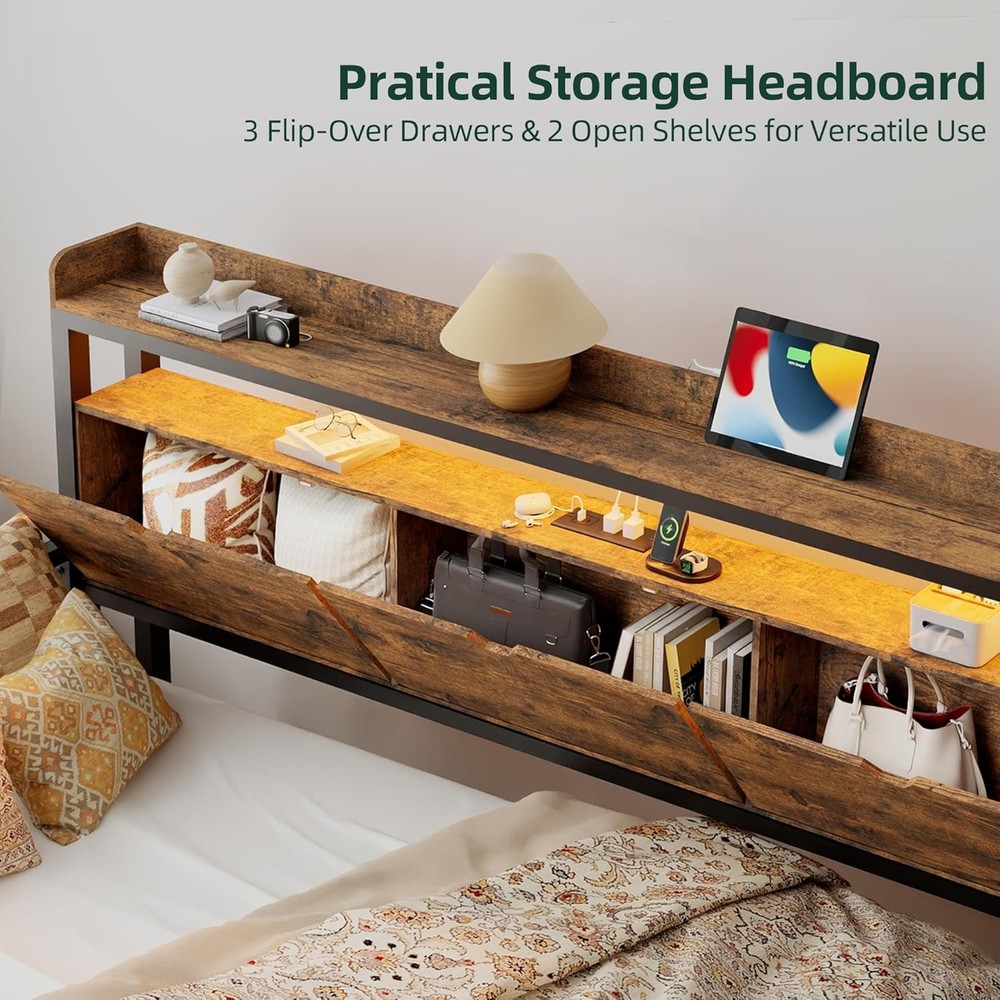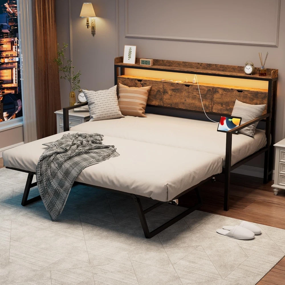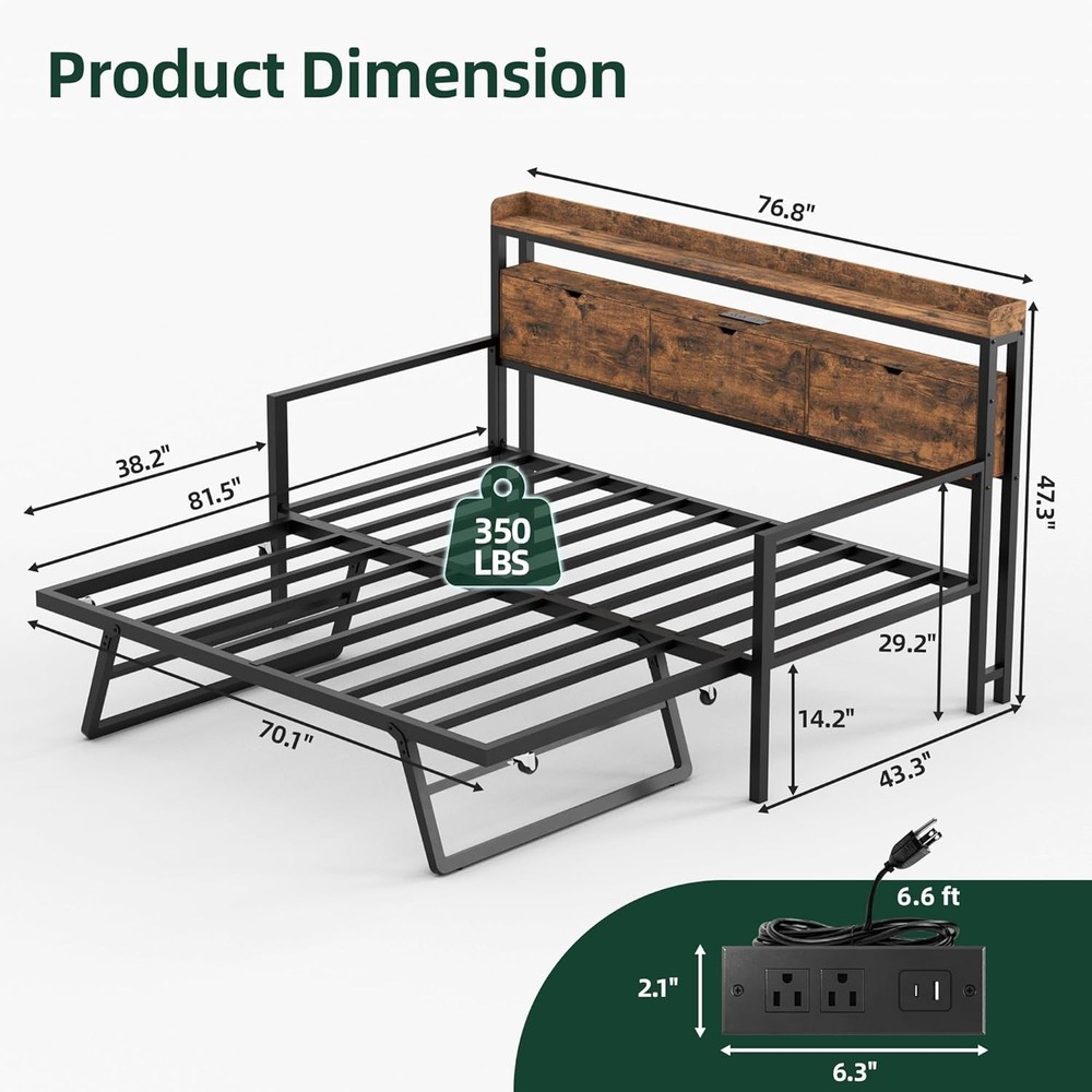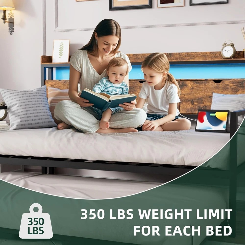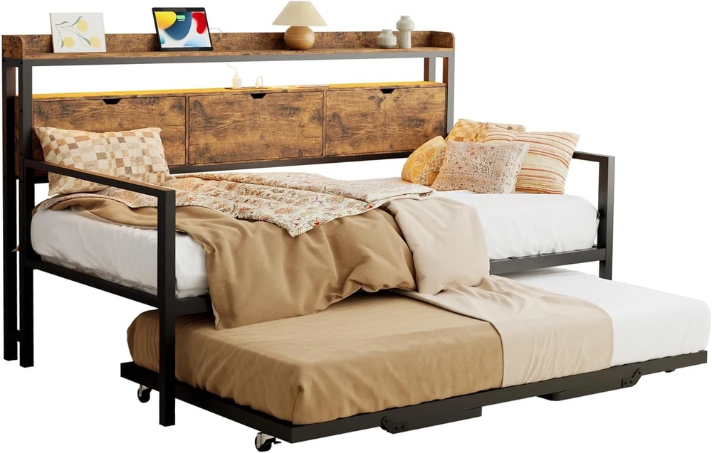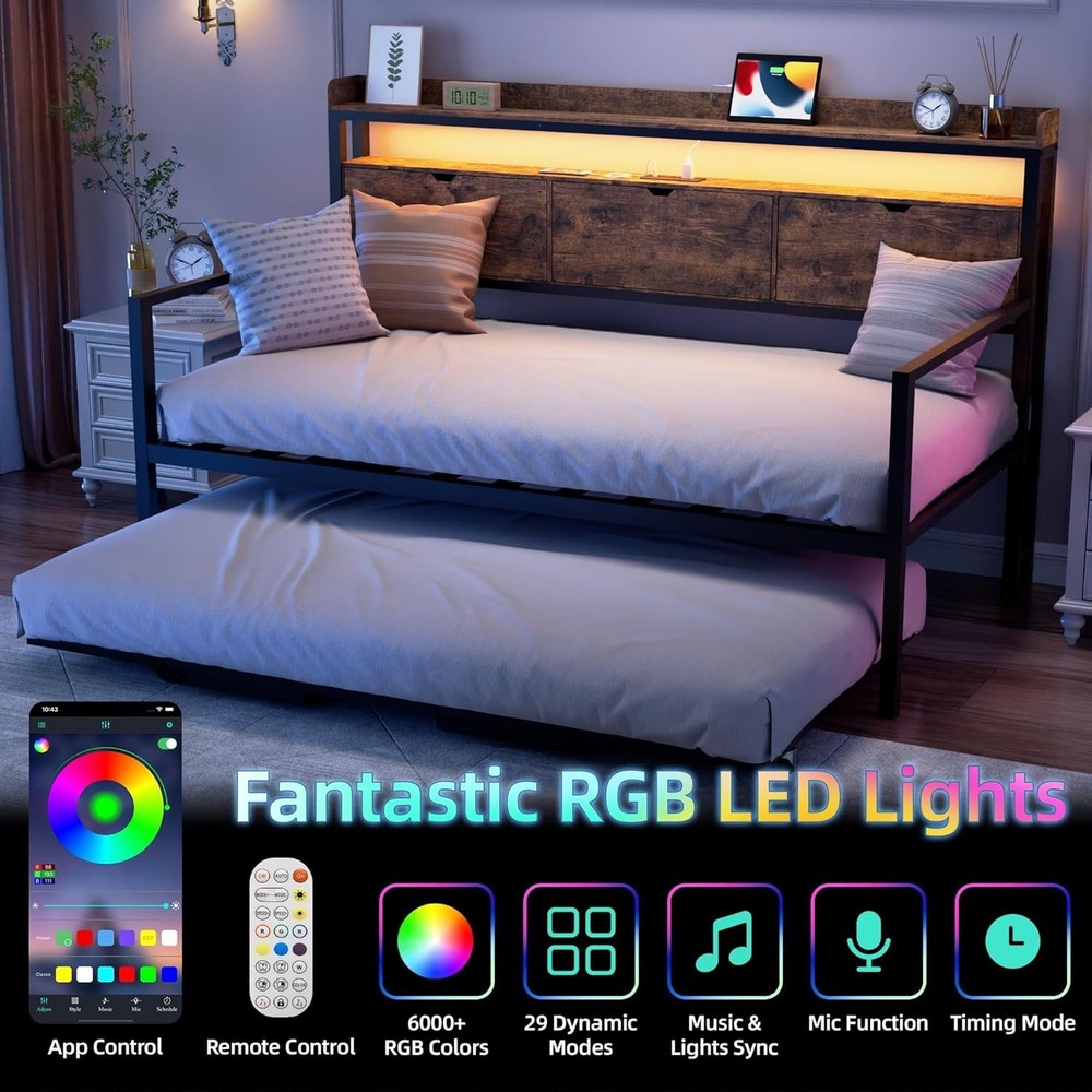 Product Description About this item Practical Headboard Storage: Featuring a thoughtfully designed wooden storage headboard, this daybed includes three flip-over drawers and two open shelves. Perfect for organizing essentials like books, electronics, or decor, it provides convenient and ample bedside storage, keeping your space tidy and functional. Built-in Charging Hub: Stay connected and charged with convenient built-in power station, our twin bed with trundle features 1 x USB port, 1 x USB-C port and 2 x AC outlets for hassle-free device charging. Dynamic LED Lighting: Elevate your ambiance with vibrant LED lights, daybed with pop up trundle offering 6000+ RGB colors and 29 dynamic modes to set the perfect mood for any occasion. Sturdy & Space-Saving: Crafted for stability and convenience, our trundle bed frame features sturdy legs and lockable wheels, ensuring safety while maximizing space. Versatile Daybed Design: Seamlessly transform your living space with our twin daybed with trundle, effortlessly converting into two single bed or merging to create a spacious king-size bed, ideal for small apartments, living rooms, or guest rooms. Versatile Comfort for Modern Living Daybed with Pop Up Trundle Designed for modern lifestyles, this exquisite piece seamlessly blends style and functionality. Organized Living, Stylish Design Stylish Headboard with Practical Storage With 3 flip-over drawers and 2 open shelves, this headboard helps you organize and access your belongings effortlessly, giving you both privacy and convenience in one stylish design Enhanced Ambiance with LED Lighting Convenient Charging at Your Fingertips Keep Your Devices Powered and Ready with Built-In Ports Elevate Your Space with Style and Function What if some parts arrive damaged or missing? Please don' worry, we can send you replacements. Just make sure to keep pictures of the damaged product and packaging. I can't find the instruction manual. What should I do? No problem! We can send you an electronic version of the manual. Just reach out, and we’ll get it to you.