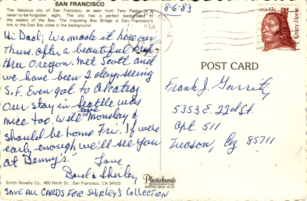 1. Shipping was delayed. I believe this was due to the January 2026 snow storm. Packaging was in a thick protective envelope. Exactly as pictured and described. Mint condition for being a 43 year old postcard. My counter-offer was accepted and a fair price. Ebay was able to step in and assist with my inquiry of the delay in receiving. 5 STARS to Seller. Thank you for bringing me closer to a dear friend, that I miss so very much!