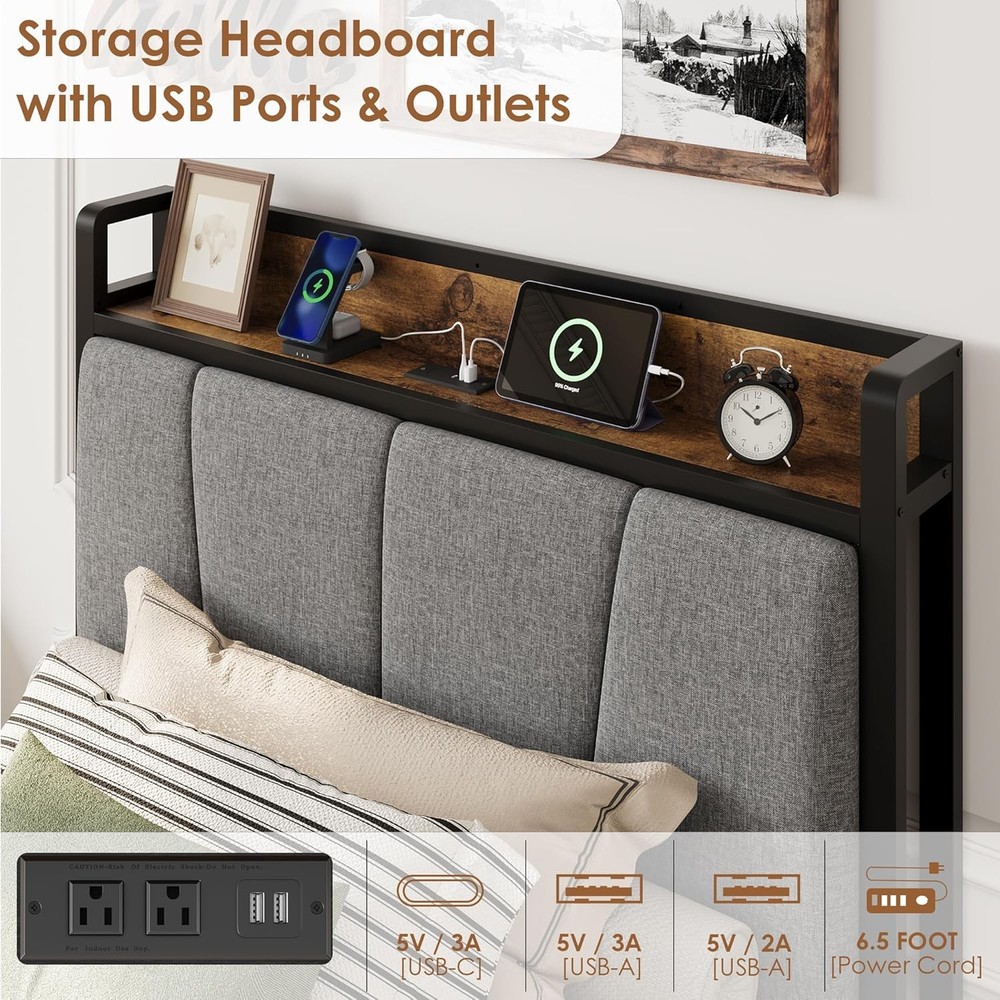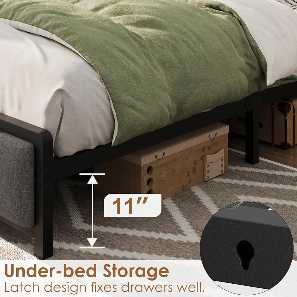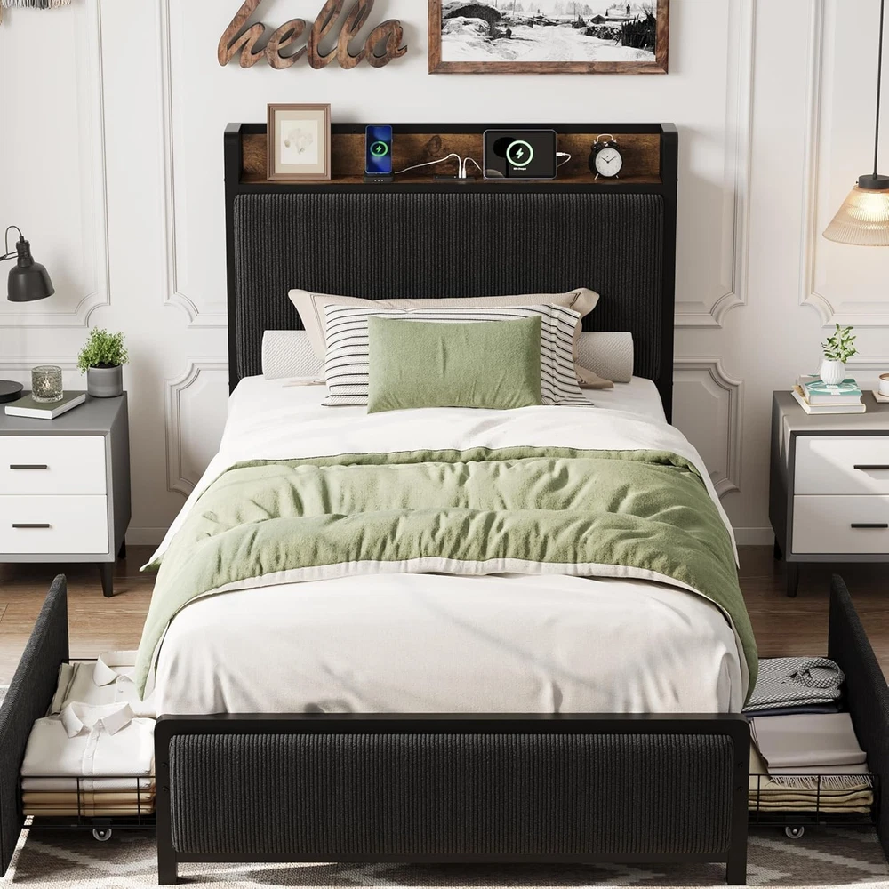 Product description 【Storage Headboard with Charging Station】This bed frame with storage headboard allows you to easily store small items such as phones, glasses and books. It is equipped with 2 USB ports and 1 Type-C port, providing a maximum of 5v/3a for fast charging efficiency. The linen upholstered headboard not only adds a stylish touch to your room, but also allows you to comfortably lean back to read books or use your phone. 【Twin Size Bed Frame with 2 Storage Drawers】This bed frame comes with 2 spacious storage drawers with smooth wheels, perfect for storing clothes or bedding. The screw lock prevents the drawers from sliding out. Additionally, the extra 10.6-inch space under the bed can be used to store shoes, boxes, or suitcases, making the most of the under bed space. 【Ideal for Placement Against the Wall】You have the flexibility to choose the placement of the two drawers under the bed. Placing both drawers on one side allows the other side to be placed against the wall, avoiding wasted drawer space. This feature is particularly suitable for families with kids or limited room space, as placing the bed against the wall prevents children from falling off the bed, providing extra safety. 【More Space for Nightstand】If you have a need for nightstand, you can choose to place a drawer on each side of the foot of the bed, as placing drawers at the head of the bed may be obstructed by nightstand. If you have these requirements above, our bed frame is the perfect choice for you. 【Sturdy Structure & Noise-Free】This bed frame is constructed with 12 high-quality metal slats and 8 heavy-duty support legs, ensuring both comfort and stability. It can withstand a maximum weight capacity of 800 pounds. With no need for a box spring and the use of noise-reducing cotton, you can enjoy a quiet and comfortable sleeping environment. 【Easy Assembly】All the parts and tools of our platform bed frame are marked out in the manual. Clear assembly instruction helps people with zero assembly experience. It only takes around 60 minutes to complete the installation. Any problems with this bed frame, please feel free to contact us, we will provide you with 24 hours professional customer service. Twin/Twin-XL Size Bed Frame with 2 Storage Drawers Twin Size Bed Frame with 2 Storage Drawers and Charging Station Charging Station with USB Ports & Outlets Soft Linen Backrest The comfortable Linen backrest has a soft fexture, is resistant to sinking, and offers great bounce. The bed has stable frame with noise-free design & easy to install. Functions 1 2 Large Drawers 2 Stable Frame 3 Under-Bed Storage A Gift for Kids Specification Size Option TWIN/TWIN-XL/FULL/QUEEN/KING Fabric Linen Drawers 2 (Can be placed anywhere) Charging Station Yes Noise Free Yes Easy to Install Yes All Day Customer Serivice Yes Color Yes GAOMON High Quality Bed Frames Customer Reviews 4.0 out of 5 stars 1 — 4.0 out of 5 stars 2 4.8 out of 5 stars 23 Price $99.99 $ 99 . 99 $221.07 $ 221 . 07 — $169.99 $ 169 . 99 Color Pink / White White / Grey White / Grey Pink / White / Blue Available Size Twin Full / Queen / King Full / Queen / King Twin/Twin XL/Full Soft Headboard Charging Station Storage Drawer Easy to Assemble Noise Free Weight Capacity 1000 lbs 1000 lbs 1000 lbs 1000 lbs From the brand Gaomon is committed to creating a comfortable residence for customers that meets their style and needs space. We pursue excellent craftsmanship quality and fashionable design, integrating them with modern aesthetics to give customers diverse choices and unparalleled value and satisfaction. GaoMon hopes to become the first choice channel for customers to find ideal furniture while pursuing a high-quality life road brand. Farmhouse Cabinet Bed Frame Makeup Vanity Farmhouse Console Table Bathroom Storage Series What is our brand value? our mission is to improve people's living spaces and improve their overall quality of life. What is the direction of our efforts? GAOMON is committed to creating a comfortable living space for customers that suits their personal style and needs. What is our pursuit? We pursue excellent craftsmanship quality and fashionable design, integrating them with modern aesthetics to give customers diverse choices and unparalleled value and satisfaction.
