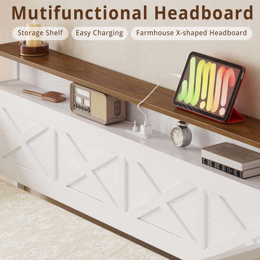 Farmhouse Style Twin Daybed: The “X” shaped frame brings rustic casual style to your room, providing unique highlighting. This beautiful twin daybed with storage is great for a guest room, living room for small living spaces, and accommodating guests. Twin Size Daybed with Two Storage Drawers: Maximize your space with this twin-size daybed featuring two storage drawers underneath. Perfect for keeping items organized, making it easy to pull in and out. Functional design: The left and right side panels are softly upholstered to ensure overall comfort during use. At the same time, the headboard has built-in shelves that can be used to store books, small tools, or decorations, giving you more comfort and convenience. Built-in Charging Station: Stay connected with the built-in charging station, which provides a convenient spot to charge your devices overnight. No more searching for outlets or dealing with tangled cords. Sturdy and Durability: Dimensions:77.2"L x 45.1"W x 40.4"H. It features a sturdy high-quality solid wood construction and strong metal slats, for durability and strength, ensuring longevity. Moreover, the solid legs of good craftsmanship provide stability while ensuring no squeak when used.