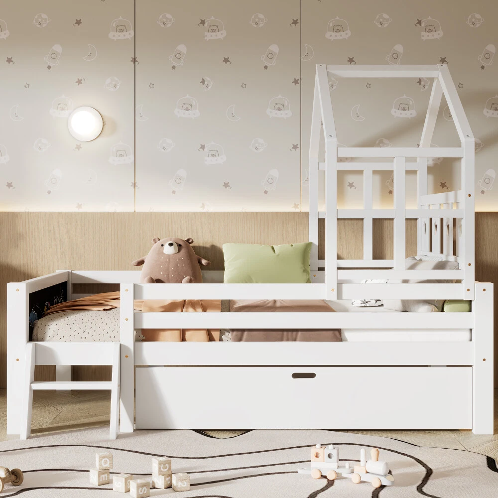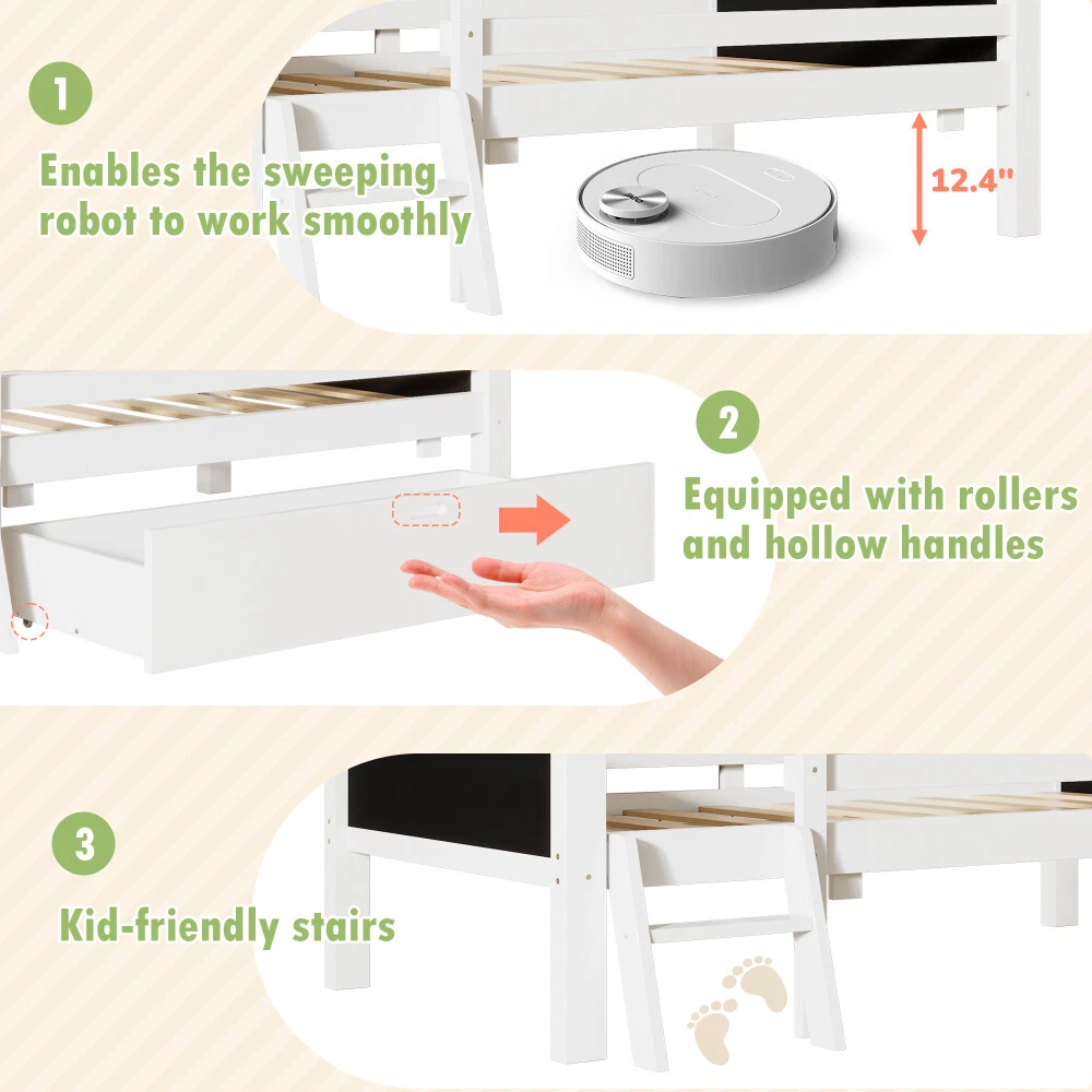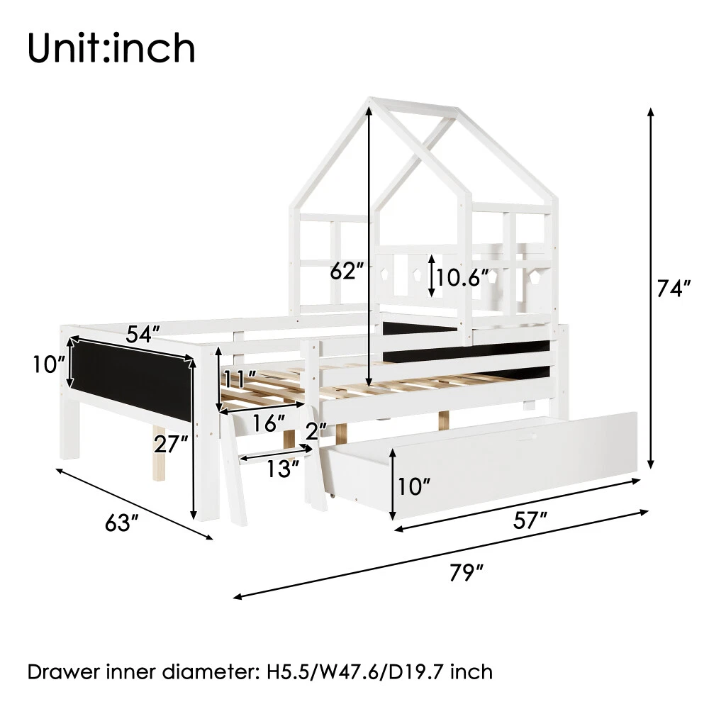 Product Features BOTH PRACTICAL AND CREATIVE: The bed is shaped like a loft window, which expands your child's activity space. The bed is paired with 2pcs 53.7*10 inches chalkboards at the end of the bed, which can be written on both sides, making it a cost-effective bed that combines entertainment and sleeping functions. The side of the bed comes with a star hollowed out decorative panel, the unique design allows you to add imagination and sense of fun to your child's bedroom. DESIGNED FOR SAFETY: The bed is surrounded by guard rails to ensure children's safety while sleeping, preventing them from falling, and the roof shape provides a sense of security. Climbing ladder height of 12.4 inch ensures fun for your child while keeping them safe when climbing the ladder. MULTIFUNCTIONAL STORAGE: The bed is 12.4 inch off the ground, with an easy to clean underbed space with no cleaning dead ends, and a large drawer with handles and rollers underneath the bed, which is sized to store your child's favorite toys. This bed maximizes space and helps develop your child's storage habits. STABLE FRAME CONSTRUCTION: The slatted frame is supported by 10 plywood slats, eliminating the need for springs.The Full size has extra support legs with adjustable feet to ensure stability on varying floors.This construction has been tested to ensure solid stability and durability. More details: single package shipping, the package comes with instructions and simple tools, a person can also be easily assembled, if there are parts missing, please contact customer service! Description N736P195111W Full size Overall Dimensions 79"L×63"W×74"H Size Full Material Pine+Plywood+MDF Color White Max. User weight 400LBS Box Spring Required NO Assembly Required Yes Package Content Bed frame+Slats+Blackboard*2 Recommended Mattress Thickness 6"-8" Drawer Inner Size 47.6"L×19.7"W×5.5"H Unique design Double-sided Blackboard Package Quantity 1 Gross/Net weight 114.64/105.82LBS Place of origin information Vietnam