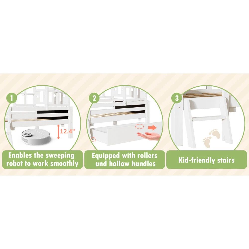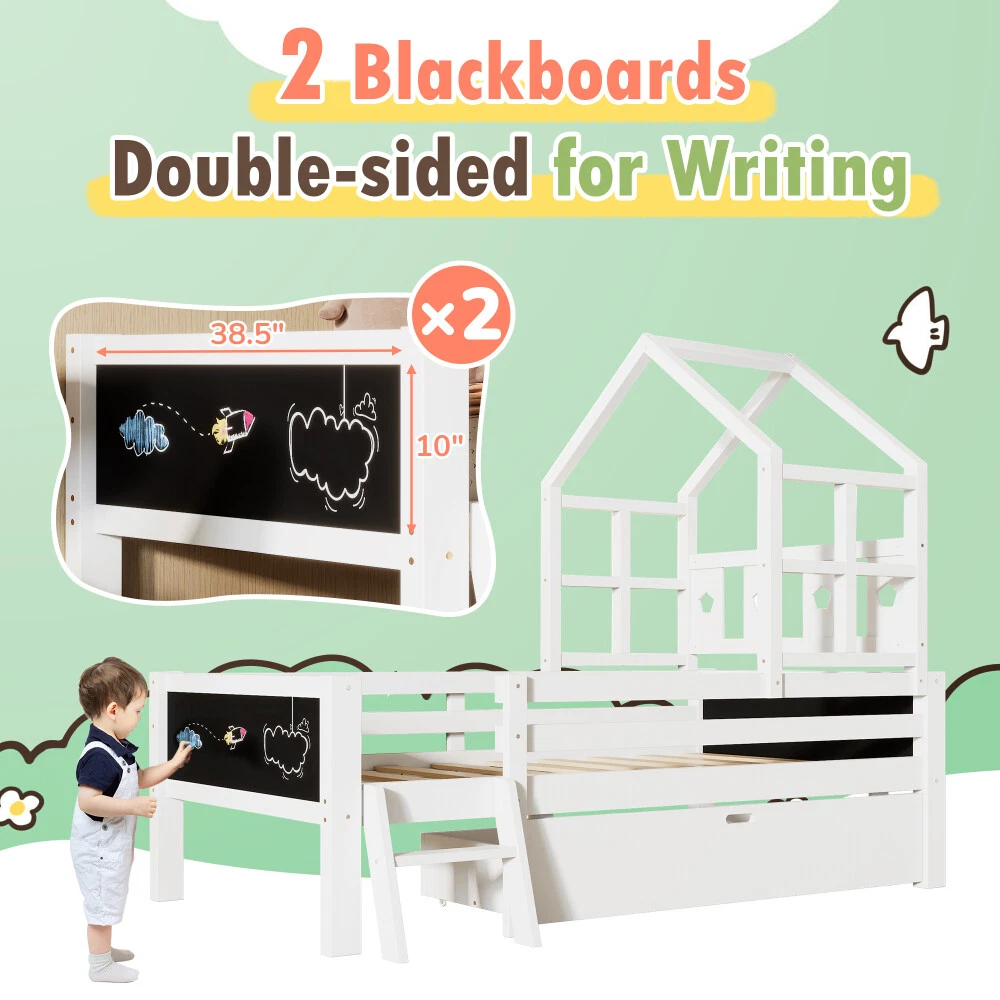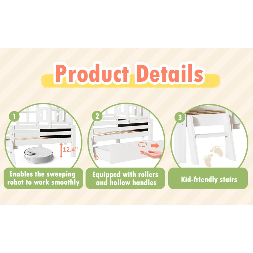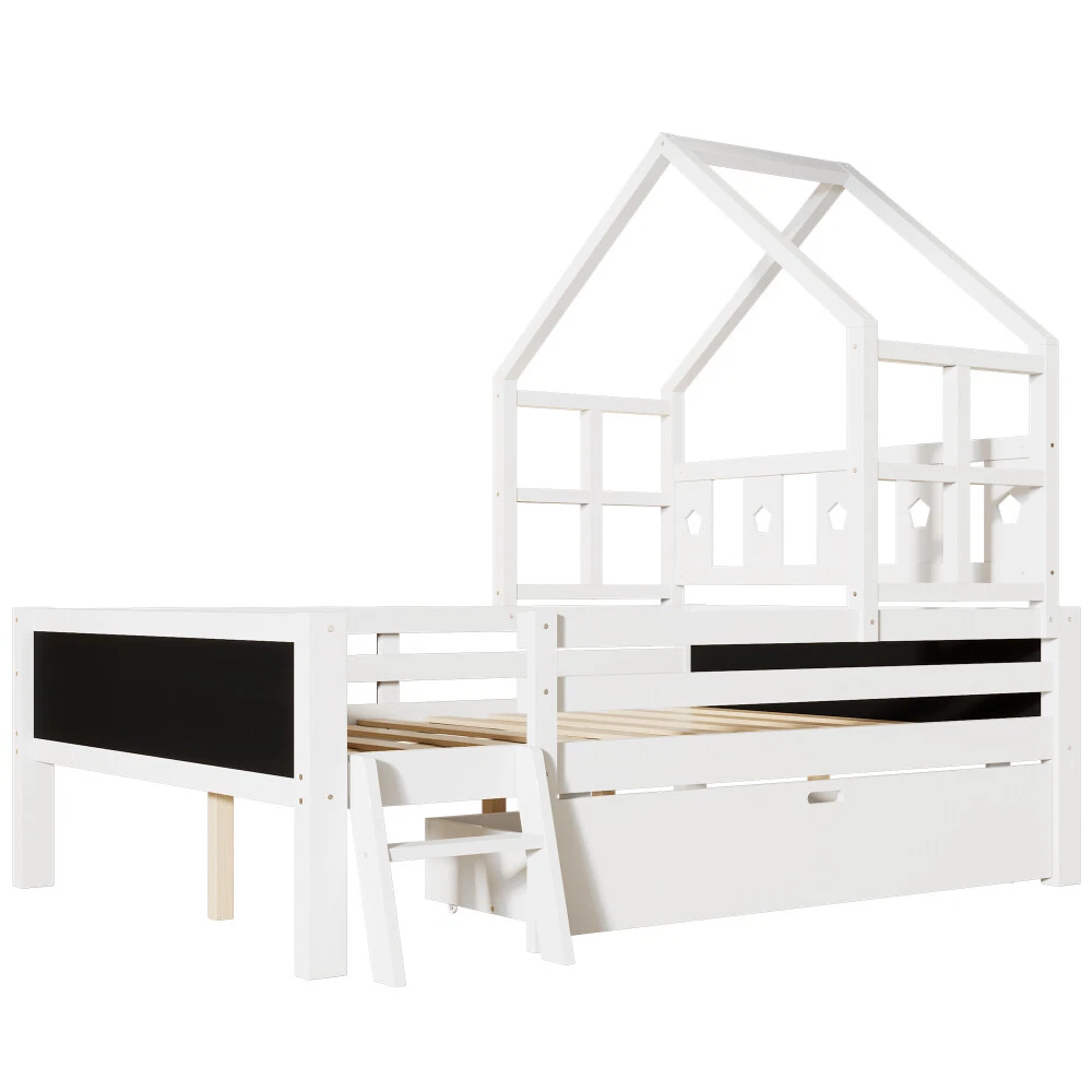Product Features BOTH PRACTICAL AND CREATIVE: The bed is shaped like a loft window, which expands your child's activity space. The bed is paired with 2pcs 53.7*10 inches chalkboards at the end of the bed, which can be written on both sides, making it a cost-effective bed that combines entertainment and sleeping functions. The side of the bed comes with a star hollowed out decorative panel, the unique design allows you to add imagination and sense of fun to your child's bedroom. DESIGNED FOR SAFETY: The bed is surrounded by guard rails to ensure children's safety while sleeping, preventing them from falling, and the roof shape provides a sense of security. Climbing ladder height of 12.4 inch ensures fun for your child while keeping them safe when climbing the ladder. MULTIFUNCTIONAL STORAGE: The bed is 12.4 inch off the ground, with an easy to clean underbed space with no cleaning dead ends, and a large drawer with handles and rollers underneath the bed, which is sized to store your child's favorite toys. This bed maximizes space and helps develop your child's storage habits. STABLE FRAME CONSTRUCTION: The slatted frame is supported by 10 plywood slats, eliminating the need for springs.The Full size has extra support legs with adjustable feet to ensure stability on varying floors.This construction has been tested to ensure solid stability and durability. More details: single package shipping, the package comes with instructions and simple tools, a person can also be easily assembled, if there are parts missing, please contact customer service! Description N736P195111W Full size Overall Dimensions 79"L×63"W×74"H Size Full Material Pine+Plywood+MDF Color White Max. User weight 400LBS Box Spring Required NO Assembly Required Yes Package Content Bed frame+Slats+Blackboard*2 Recommended Mattress Thickness 6"-8" Drawer Inner Size 47.6"L×19.7"W×5.5"H Unique design Double-sided Blackboard Package Quantity 1 Gross/Net weight 114.64/105.82LBS Place of origin information Vietnam