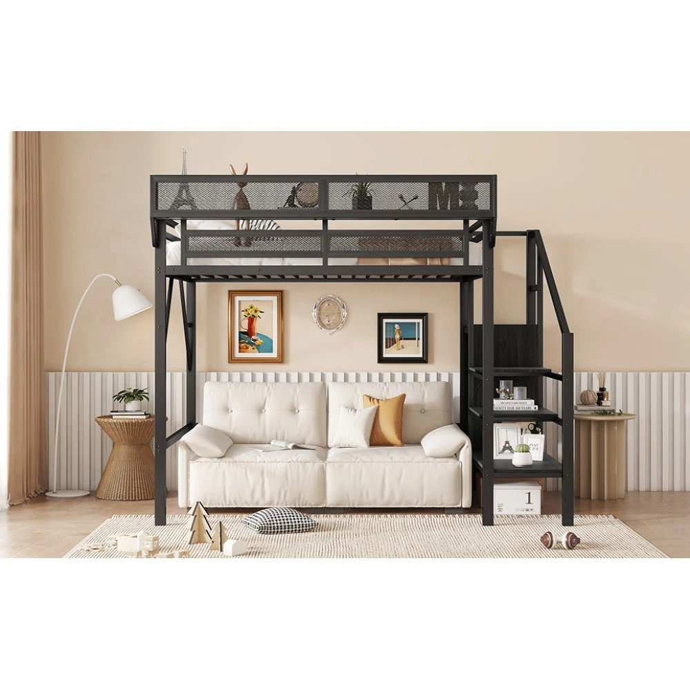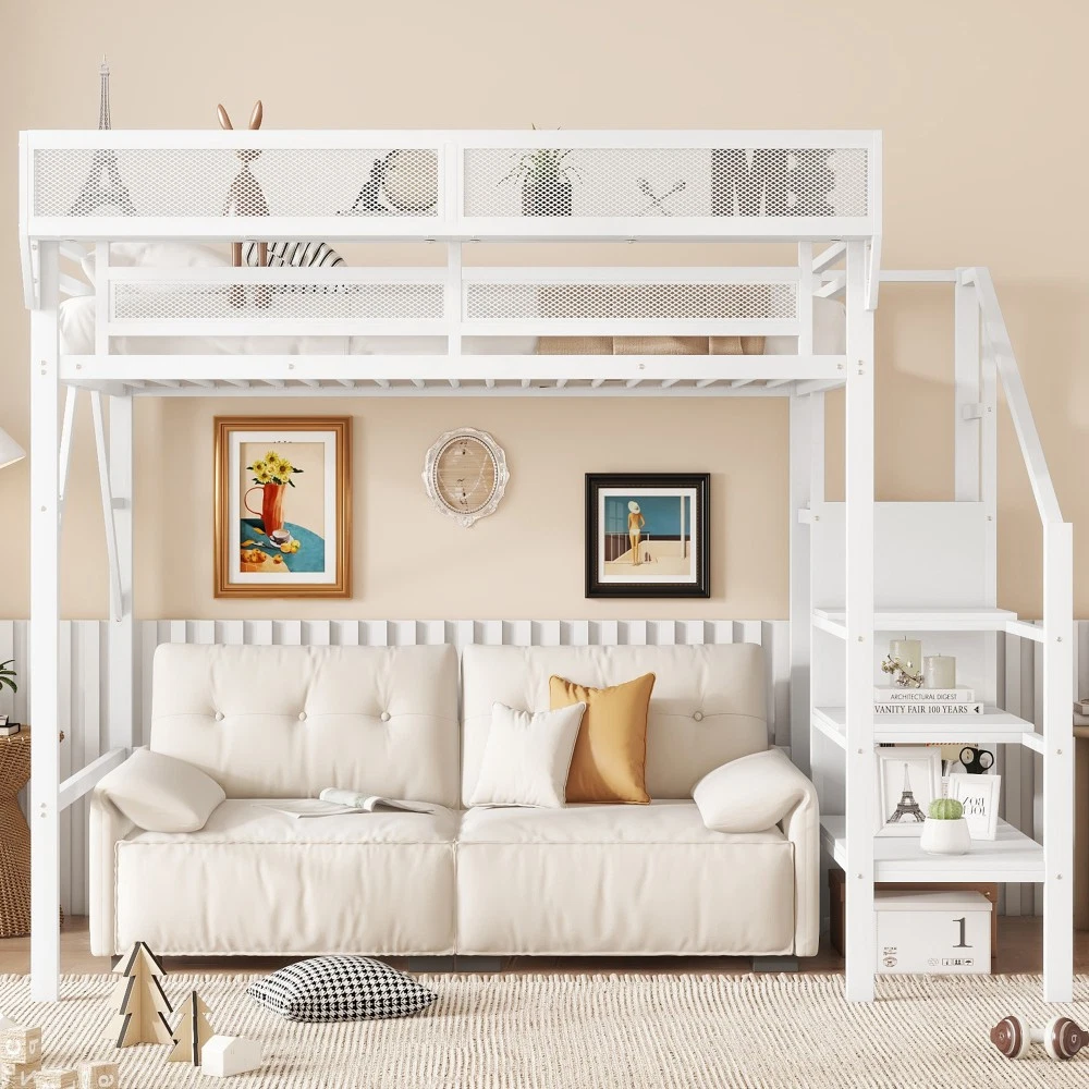 Twin Size Loft Bed Stairs Metal Twin Loft Bed with Storage Shelves High Loft Bed Features 【Twin Loft Bed with Storage Shelves for Upper】The twin metal loft bed features a storage shelf next to the upper bed, providing extra storage space. This shelf is perfect for keeping books, gadgets, or small items within easy reach. The shelf have mesh around which prevent thing falling down. It adds functionality without compromising space. 【Metal Twin Loft Bed with Staircase】The metal twin size loft bed come with staircase includes built-in storage compartments, making it easy to store items like shoes, toys, or blankets. The steps ensure safe and convenient access to the upper bed, enhancing both practicality and safety. The stairs can be installed on either right side or left side. 【Under Space of Metal Loft Bed】54.3 inch under the twin loft bed creates extra space for multi-functional use. You can place storage cabinets, a small sofa, or a desk underneath, maximizing the use of limited space and creating a versatile living area. 【Metal Loft Bed with Wardrobe】The staircase features a built-in wardrobe function, providing additional storage for clothes and accessories. This clever design adds more functionality to the metal full loft bed, making it a perfect solution for small bedrooms. 【Durable and Sturdy Construction】The twin size metal loft bed made from high-quality metal, this loft bed is durable and sturdy. The metal material ensures long-lasting use and stability, while also offering a sleek and modern look that fits well in any bedroom.Weight cap Descriptions Twin Size Loft Bed with Stairs, Metal Twin Loft Bed with Storage Shelves, High Loft Bed with This twin size loft bed features built-in storage shelves next to the upper bed. Come with staircase and wardrobe. The sturdy metal design ensures stability and durability, making your bedtime routine more organized and efficient. Specification Description & Dimensions Color: White Material: Metal Overall Dimensions: 94.3” x 47.8”x 73.4” (L x W x H) Size: Twin Size Height of Upper Guardrail: 11.3" Clearance Under the Bed 54.3" Recommended Mattress Thickness 6”(not included) Weight Capacity: 250LBS Net Weight: 125.4 lbs Gross Weight 136.84 lbs Box Spring Required No Country of Origin China