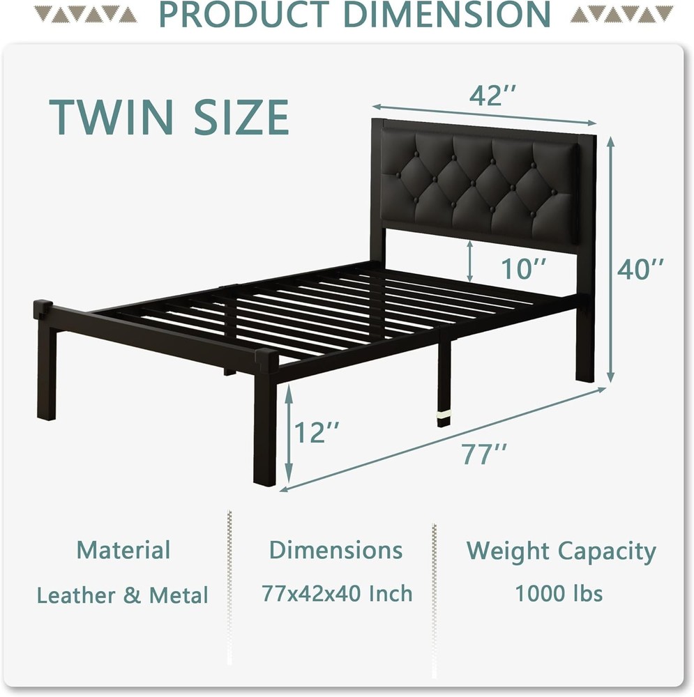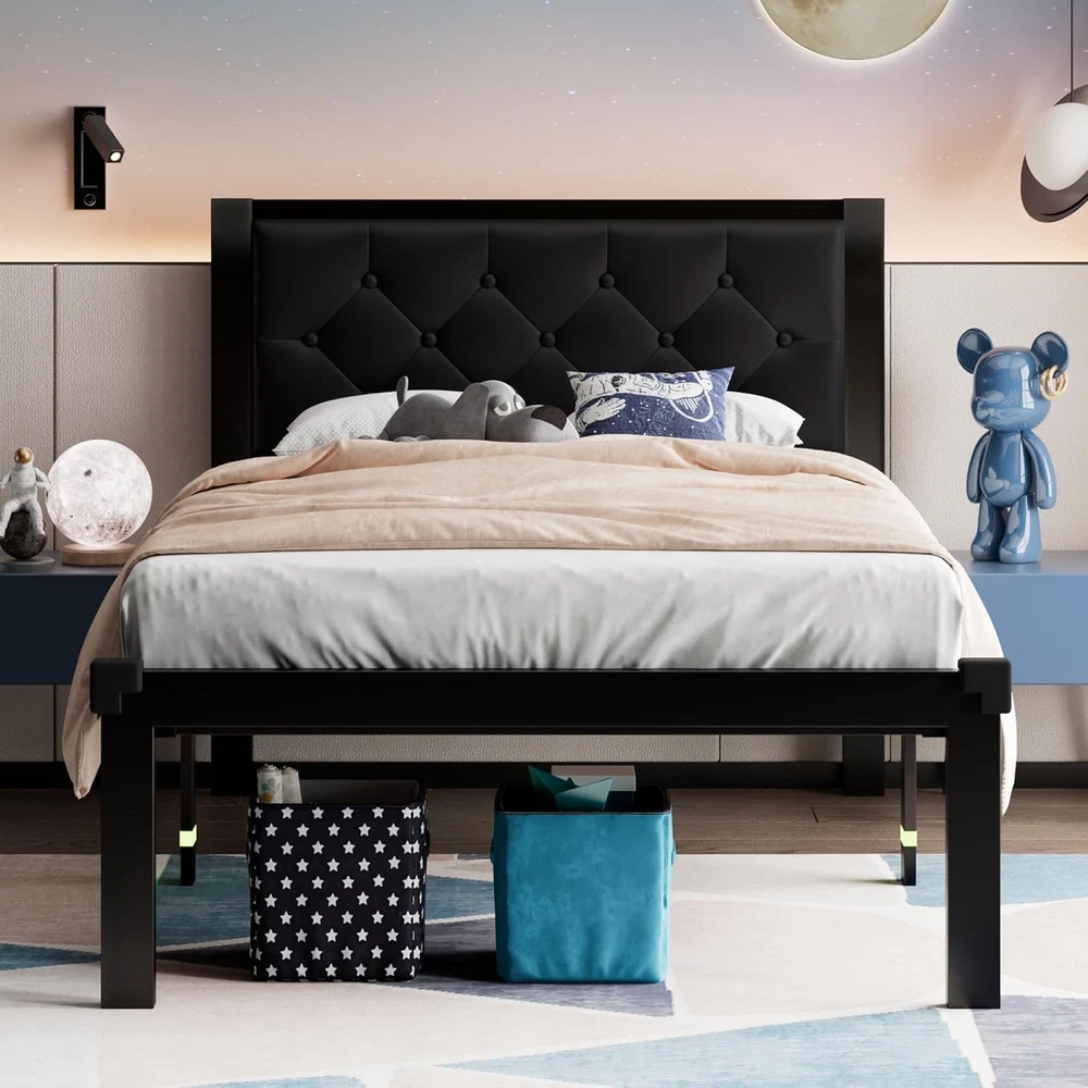 About this item Fluorescent strips help avoid stubbing toes and corner protectors protect children from injury Withstands up to 1000 lbs with thick legs, embedded design prevents mattress sagging or slipping 12-inch under-bed storage holds many items to keep room organized and tidy Built-in anti-noise shells create silent sleep environment without noise Easy 30-minute assembly with one-click buckle slats included in 1 box Faux leather headboard with retro diamond buttons matches metal frame › Size: Twin Material: Metal Product Dimensions: 77"L x 42"W x 40"H Style: Modern Special Feature: Heavy-Dutu Metal Frame, Premium Fabric, Soft Upholstered Headboard, Zero Noise
