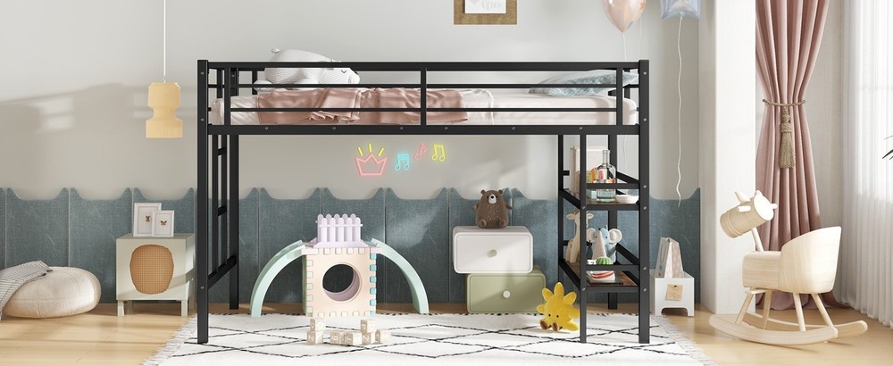 Product Feature Classic Metal Loft Bed Frame: Adopting a classic and minimalist design, adding a touch of elegance to your bedroom, suitable for any decoration style. The perfect metal loft bed for children, teenagers, boys, and girls. Classic Metal Loft Bed Frame: Adopting a classic and minimalist design, adding a touch of elegance to your bedroom, suitable for any decoration style. The perfect metal loft bed for children, teenagers, boys, and girls. Durable square tube frame: The sturdy square tube frame provides maximum support, with a total load capacity of 350 pounds, ensuring safety and stability, and ensuring good sleep. Safety Design: This loft bed is equipped with raised guardrails to prevent your child from falling and provide them with a peaceful sleep. Additionally, a convenient ladder and comfortable steps make it easy for children to climb up and down. Easy to Assemble All parts included in your package are indicated clearly. With step-by-step installation manual and pre-drilled holes, you can easily assemble this bed individually. Product Description Description This loft bed features a classic and minimalist design, making it the perfect furniture for your home. High quality materials ensure the bed is sturdy and durable, providing a good sleeping space for your child. Underneath the bed is a perfect storage space, providing a great place for children's toys and books. Weight & Dimensions Product Type Metal Loft Bed Color Black Size Twin Material Metal+MDF Overall Product Dimension 77.6”L*42.5’’W*49.3”H Overall Product Weight 67.24 LBS Bed Weight Capacity 350LBS Recommend Mattress Thickness 6'' Number of Package 1 Package Dimension & Weight Please refer to the Specification Level of Assembly Full Assembly Needed Eligible for Hardware Packs Yes Country of Origin China Note All the pictures are taken by actual samples, slight chromatic aberration may occur due to lighting or display.