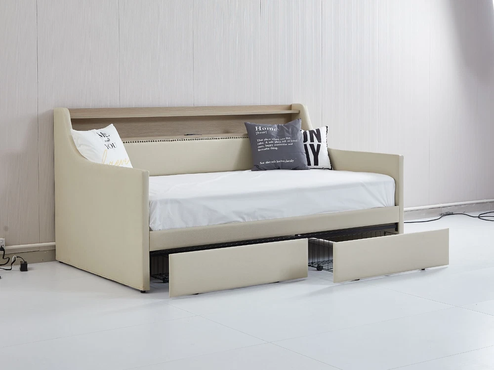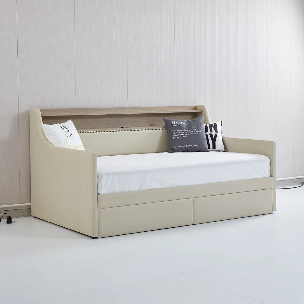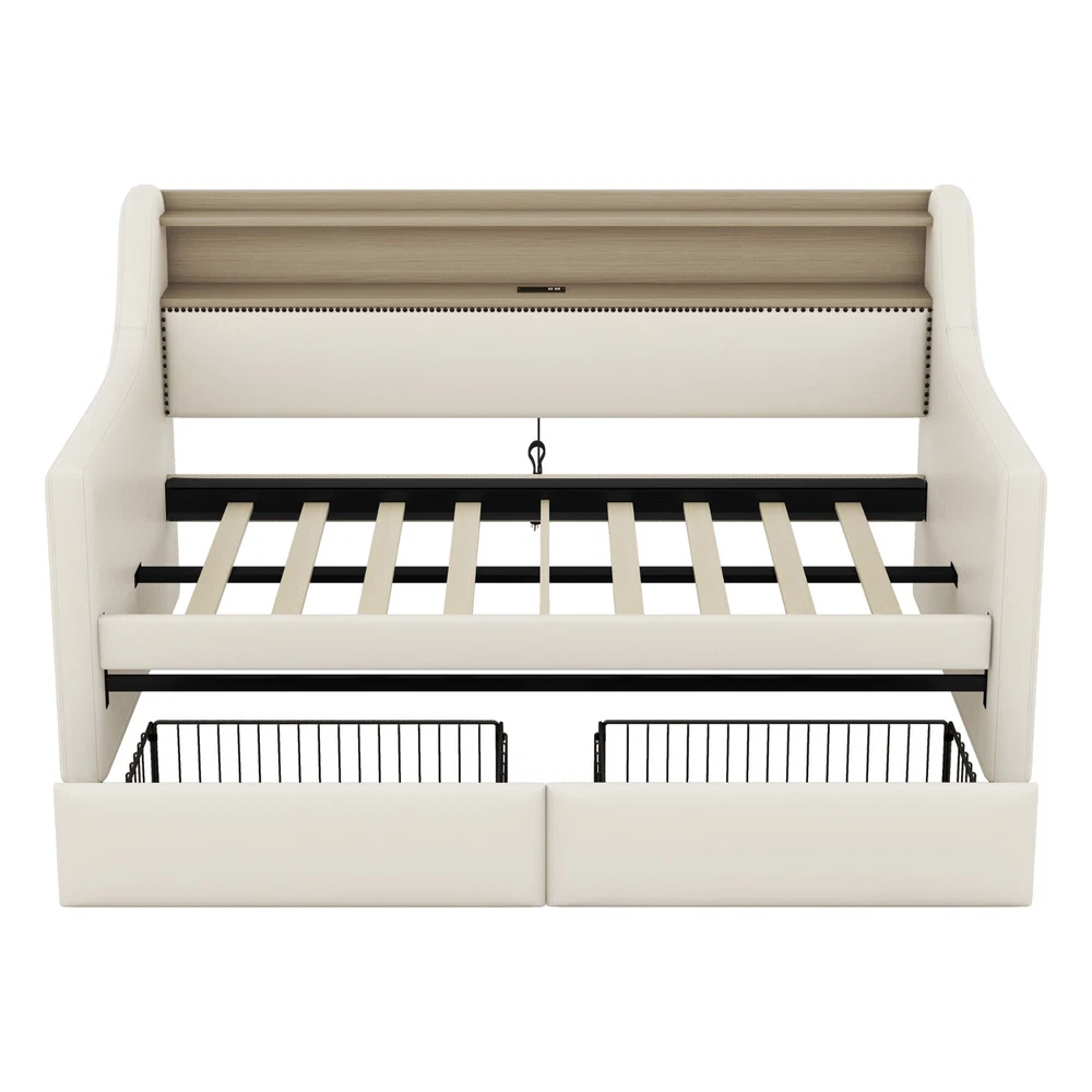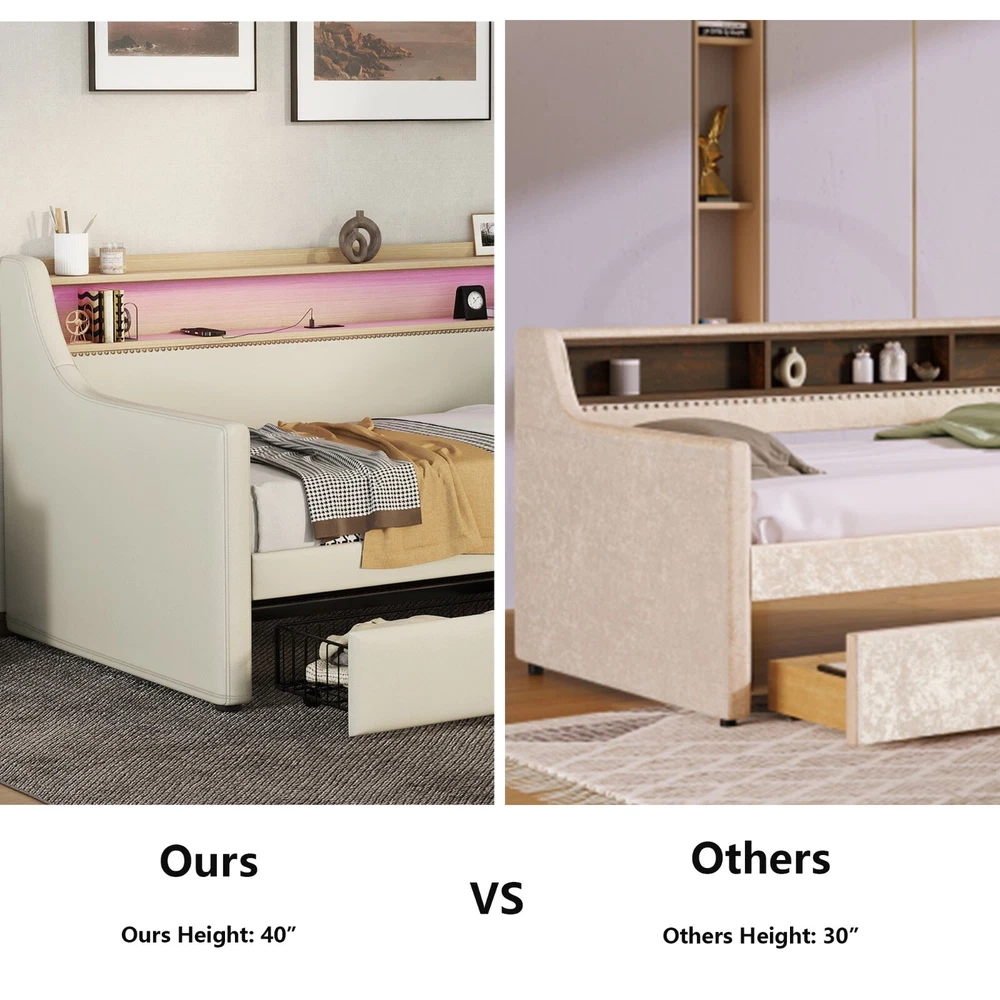 Twin Size Daybed w/ Drawers, Upholstered Bed w/ Charging Station and LED ,Beige Features Stylish and Elegant Design--Our daybed with drawer is made of PU leather. With high backrest which lying more comfortable, two armrests make your hands free. Bronze nail head trim make this twin daybed more stylish and classic. A timeless design concept combined with a thick padded back and four side foam filled makes our daybed stand out from ordinary bed frame and brings you a comfort experience and soft touch. Charging Station--The built-in power socket comes with 2 USB ports and 2 outlets, allowing you to easily charge your electronic device while relaxing your body and mind. LED RGB Light--The LED light with a remote control offers 16 static colors and speed adjust and brightness adjust provide personalized lighting atmosphere for your night. Choose the color you like and completely immerse yourself in the beautiful night time. Storage Headboard--The headboard storage provides you with an extra place to store magazines, phones, beloved photos and decorations which is very practical. 2 Storage Drawers--This twin size daybed frame come with 2 drawers with wheels offers ample space for off-season clothing, bed sheets, etc. keeping your bedroom organized & clutter-free. Durable Frame--Our daybed frame is made of solid MDF and plywood, with dense and strong support to withstand the weight of 330 lbs. Recommend mattress thickness max. 8 inch. This sturdy construction ensures that the frame is strong and the backrest will not wobble but also ensures lifetime usage. Description Description Upgrade your room with this simple and modern style, with bronze nailhead for decoration. 2 drawers for storage, with LED light and charging station which will look luxurious in your room. Description & Dimensions Overall Product Dimension 79.5"L x 45.3"W x 36.2"H Size Twin Color White Numbers of Package 2 Overall Product Weight 105.6LBS Weight Capacity 330LBS Mattress Thickness 8" Product Material Leather+MDF Box Spring Required No