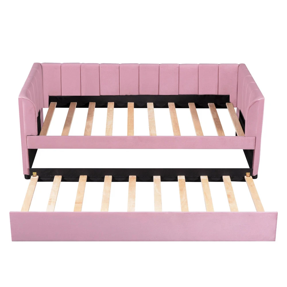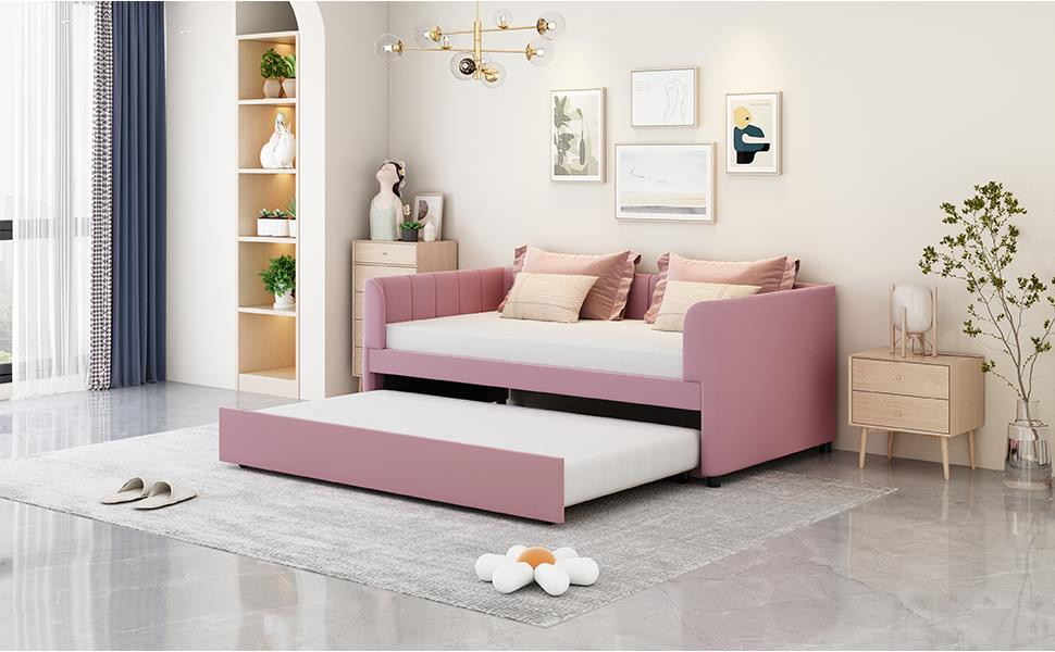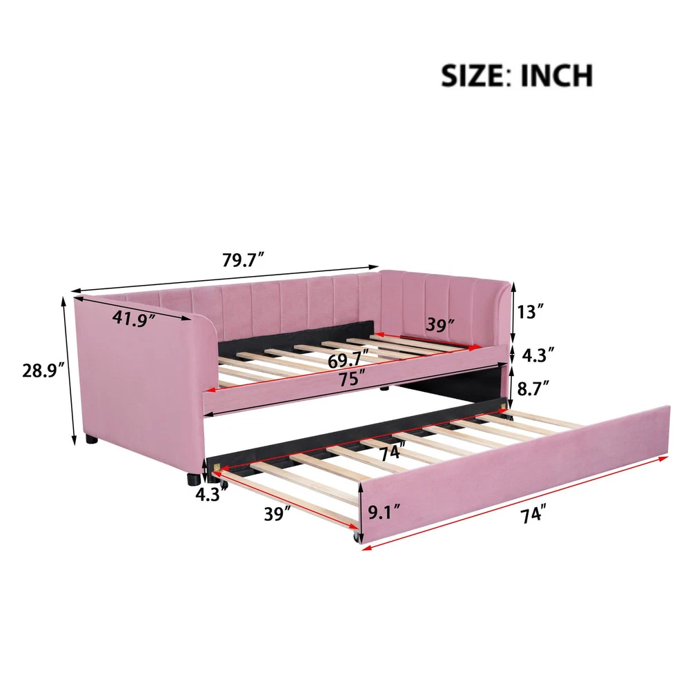 With the design of classic stripe shaped headboard, this daybed brings artistic to your home.This daybed maintain its stylish look with clean lines that blend well with the surroundings. Our designs promote both comfort and elegance.And with the latest Ergonomic Design for the backrest of the daybed, this bed allows for easy leaning and comfortable experience.In addition,this daybed comes with a twin size trundle. Perfect for small apartment or someone who love sleepovers.This daybed will surely be a beautiful and practical piece for your bedroom. Weight & Dimensions Overall Product Dimension 79.7"L x 41.9"W x 28.9"H Detail Product Dimension Please refer to the Size image Number of Package 2 Package Dimension Please refer to the Specification Overall Product Weight 119.05LBS Package Weight Please refer to the Specification Weight Capacity Bed:250LBS Trundle:250LBS Recommended Mattress Thickness 6" Specifications: Product Type Day Bed Size Twin Color Gray/Beige/ Material Velvet Box Spring Required No Number of slats Bed:10 Trundle:8 Country of Origin Vietnam Notes: Manual measurement has been used,there may be some reasonable error.All the pictures are taken by actual samples, slight chromatic aberration may occur due to lighting or display. [Eye-catching Design] With the design of classic stripe shaped headboard, this daybed brings artistic to your home.This daybed maintain its stylish look with clean lines that blend well with the surroundings. Our designs promote both comfort and elegance. [Backrest Ergonomic Design]With the latest Ergonomic Design for the backrest of the daybed, this bed allows for easy leaning and comfortable experience. [Space-saving] This daybed comes with a twin size trundle. Perfect for small apartment or someone who love sleepovers. Simply roll out the trundle when it is needed and roll in when it's not in use. [Easy Assembly] The day bed is delivered in 2 packages, along with the installation manual and full set of hardware necessary to guide you through the process of assembly, and the bed will definitely be assembled conveniently. [Overall Dimensions] Overall Product Dimension: 79.7"L x 41.9"W x 28.9"H. Mattress not included.