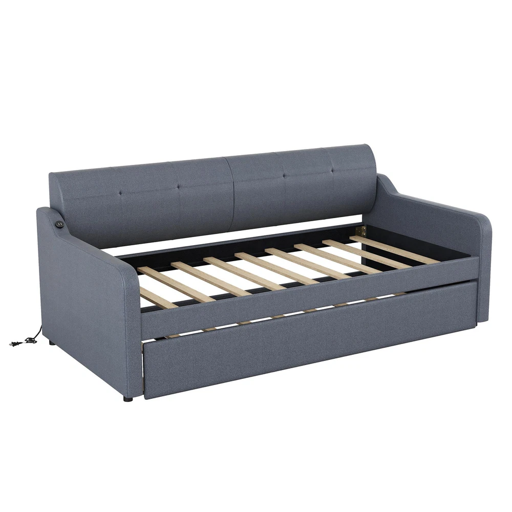 If you need extra sleeping space or your kids' love sleepovers, this daybed with a handy pull-out trundle is perfect for your home. The right armrest also has a USB charging design. When you are lying on the sofa and your phone is out of power, you can charge your phone in.High-quality legs and a strong, durable frame ensures stability and durability for-term use. This daybed is designed with a clean silhouette and a of elegance.The trundle can be laid directly on the ground, or it can be erected at the same height as the daybed.It suits all styles of home decoration and completes the look of any bedroom. ①[Elegant Design] Upholstered in woven fabric, in elegant beige, features a backrest and two armrests with soft materials, this daybed not only suits any home décor but is timeless in its design. ②[Solid Construction] The daybed frame is made of solid and particleboard, providing dense and strong support. The construction ensures both a lifetime of use and a sturdy frame with a backrest that won't wobble. ③[Multifunctional Trundle] The daybed with a handy pull-out trundle takes up minimal space for the spontaneous sleepover guest.And it can be laid directly on the ground, or it can be erected at the same height as the daybed. ④[Charging Design] The right armrest also has a USB charging design. When you are lying on the sofa and your phone is out of power, you can charge your phone in. ⑤[Easy to Assemble]All parts included in your package are indicated clearly. With step-by-step installation manual and per-drilled holes, you can easily assemble this side table individually.Manual installation is recommended. Description : Bed Material:Pine Wood Woven Fabric Size:Twin Color:Gray Numbers of Package:2 Assembly Required:Yes Origin:Vietnam Dimensions : Overall Product Dimension:80.7''L*78.7''W*34''H Upper/Down Bed Dimension:76''x39.2'' Total Height:34'' Number of Daybed/Trundle Slats:10/10pcs Overall Product Weight:130lb Each Bed Weight Capability:400lb Recommend Daybed/Trundle Mattress Thickness:6'' Package Includes: 1 x Twin Size Upholstery DayBed