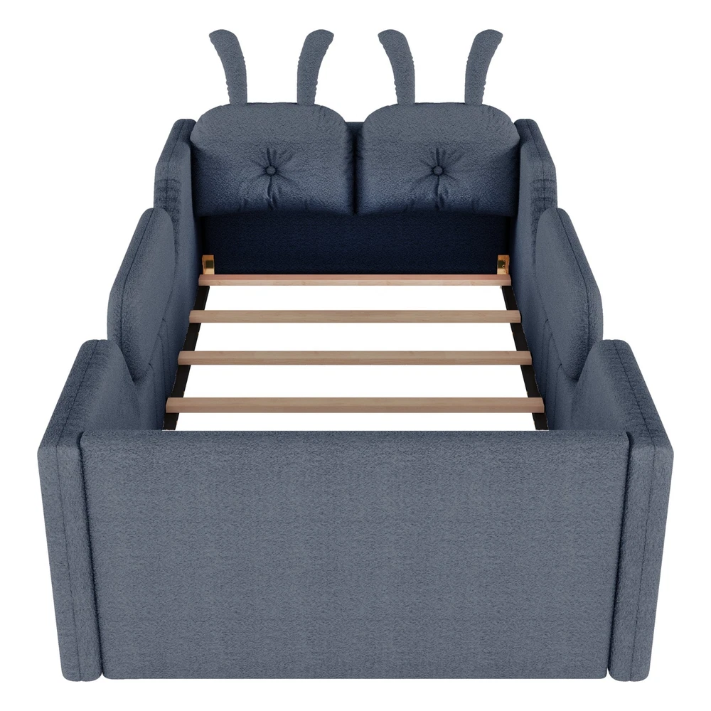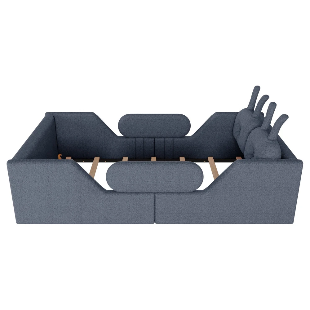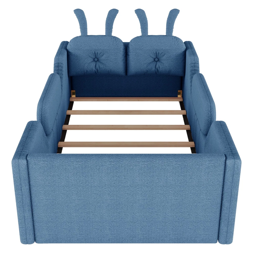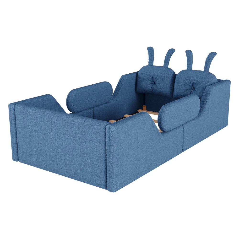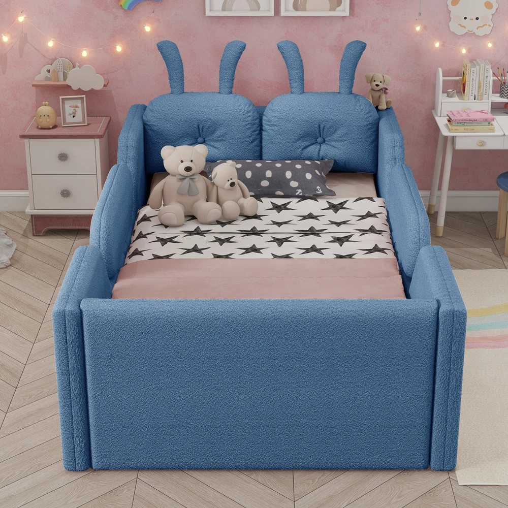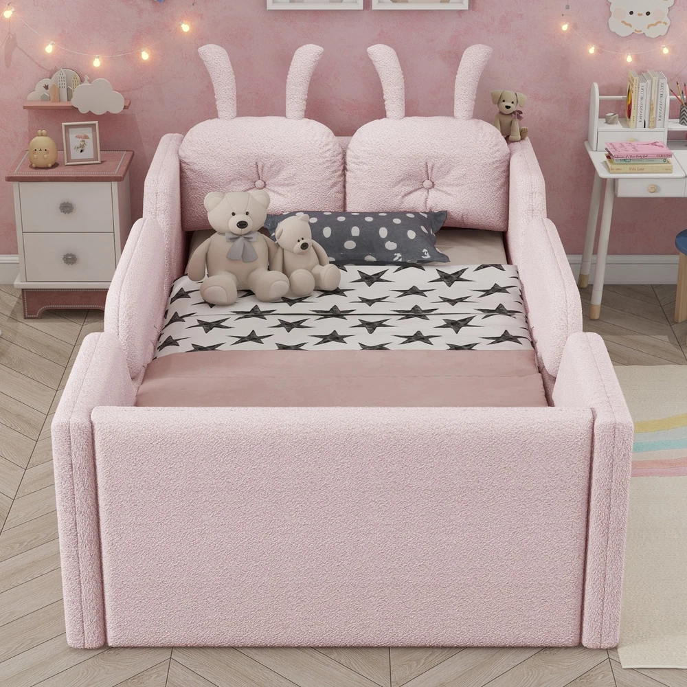 Product Feature [High Guardrails]-The 21” inch height of kids floor bed suitable for mattresses of various thicknesses to improve the safety of children's activities. Also eliminates the risk of any nasty falls and bumps, designed to create a safe space to roam and sleep for kids. [Whole Soft Design]-Kids floor bed is made from soft Teddy fabric and filled by high quality foam which get soft hand feeling and protect your kids away from hurt. [Removable Side Rails]-There are 2 small safety side rails come with this kids upholstered bed. The extra safety rails could avoid your kids fall down from bed during the time they are sleeping, more safety for little kids. And the rails can be removed if no need after growing up. [Rabbit Cushions]-Feature with 2 rabbit-shaped back cushions at headboard and fix with velcro. Can be removed for washing. The cushions is vacuum-packed. You just need to take off the packing and fluff in minutes. [No Need Box Spring]-No need box spring, height is deeper than most children’s beds so that you can choose 8 inch mattress. Instruction and tools included for easy assembly. Product Description Twin Size Upholstered Platform Bed with Rabbit Cushion 21 inch height for 8 inch thicker mattress, included the rabbit cushion make this bed more cute, and removable side rails for safety, teddy fabric with foam padding for soft feeling and avoid your kids from hurt. Description & Dimensions Color: White Material: Teddy Fabric Overall Dimensions: 78.5*43.11*21” (L x W x H) Size: Twin Recommended Mattress Thickness 8”(not included) Weight Capacity: 250LBS Net Weight: 97 lbs Gross Weight 105.6 lbs Box Spring Required No Country of Origin Vietnam