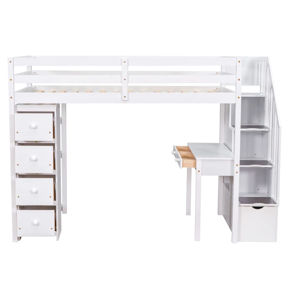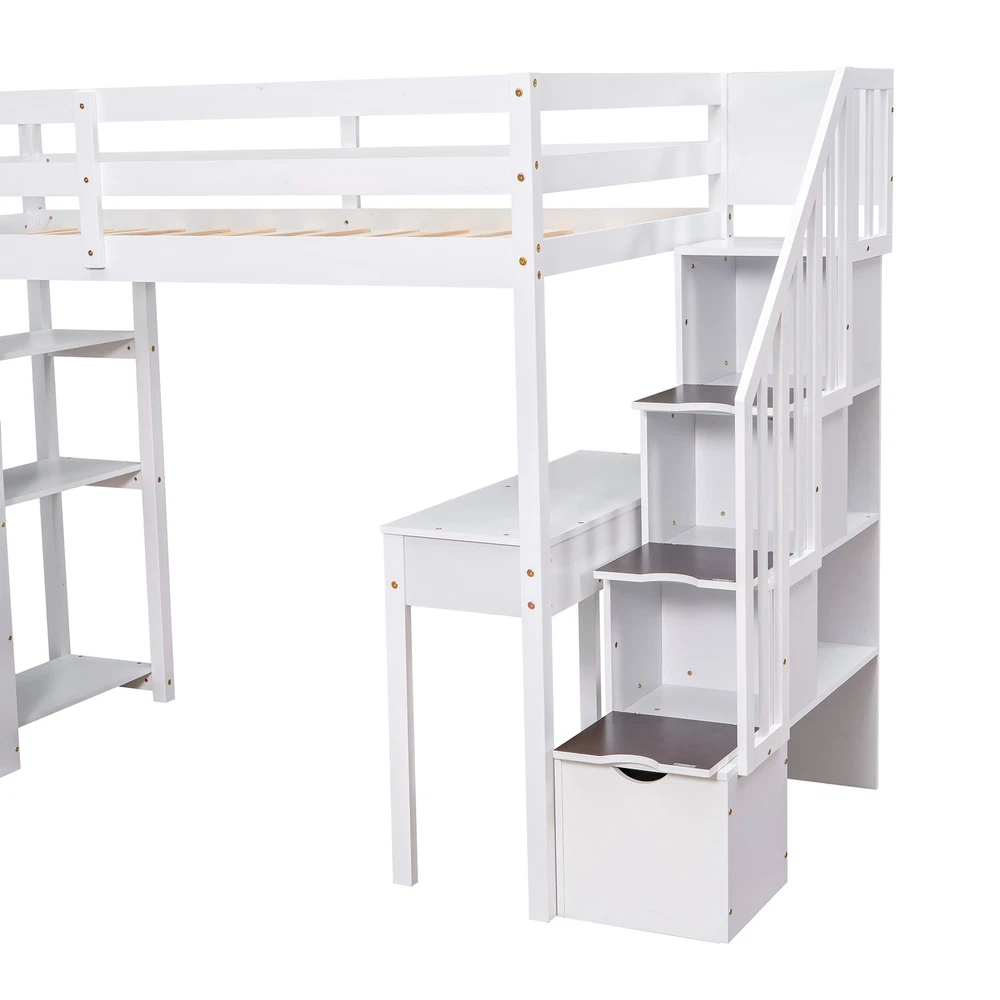 This loft bed totally transformed my kid's room! The built-in desk creates an awesome study nook, while the storage drawers keep everything organized. The stairs are much safer than a ladder, and the solid wood construction feels really sturdy. Perfect space-saving solution that looks fantastic in white!