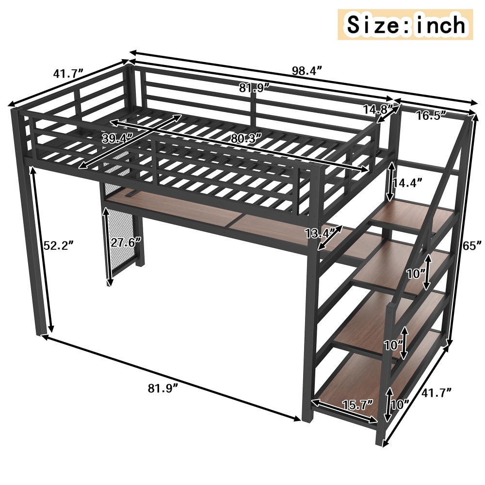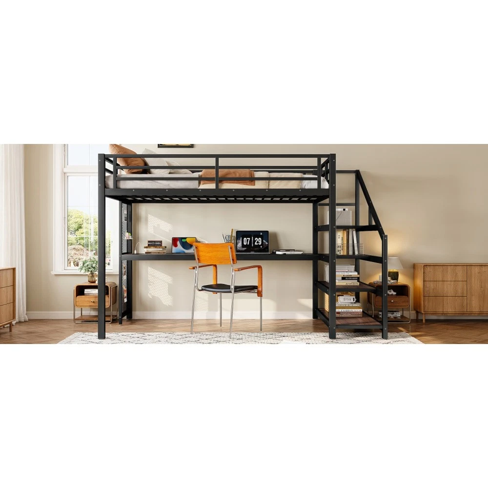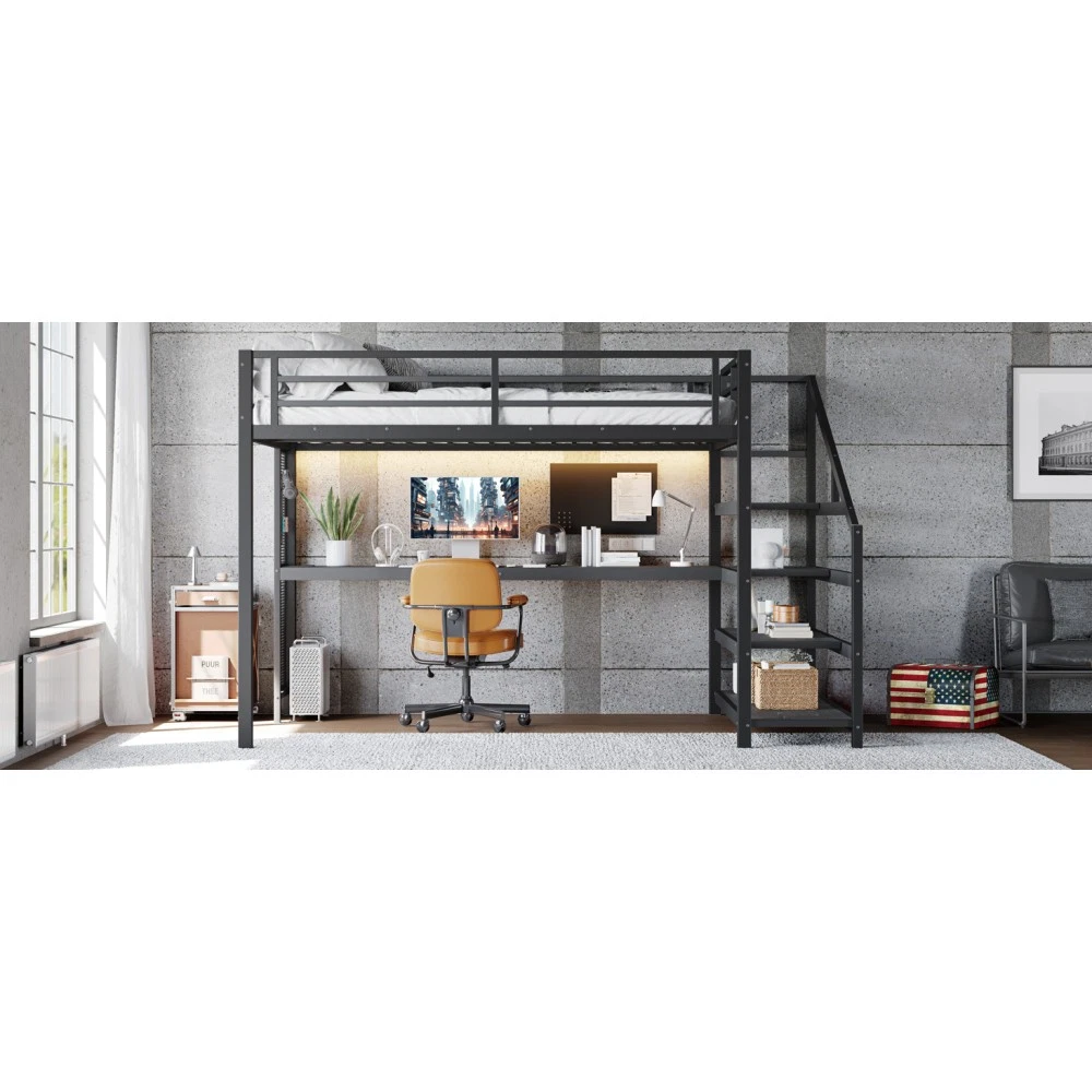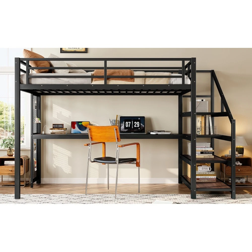 Twin XL Loft Bed with Desk & Storage Stairs, Metal Frame with LED Lights & USB Ports, Noise-Free Black Upgrade your small space with this multifunctional Twin XL loft bed—perfect for apartments, dorms, or family bedrooms! Combining a sturdy sleeping area with a built-in desk, storage stairs, and thoughtful tech features, this bed maximizes every inch of your room while blending style and practicality. Crafted from durable metal and MDF, it offers reliable stability, quiet comfort, and all the functionality you need for studying, working, and relaxing. Space-Saving & Multifunctional Design : This loft bed transforms your room into a versatile living space by integrating a built-in desk, storage stairs, and unique iron nets. The desk provides a dedicated workspace for studying or working, while the stairs offer convenient access to the upper bed (no shaky ladders!) and extra storage options. The iron nets let you hang photos, calendars, or small accessories, adding a personalized touch to your space and keeping essentials within reach. Built-In LED Lights & USB Ports : Stay cozy and connected with built-in LED lights and convenient USB ports. The soft LED lighting creates a warm, inviting atmosphere—ideal for reading or relaxing before bed—while the USB ports let you charge your phone, tablet, or laptop without messy cords. It’s the perfect blend of comfort and tech convenience for modern living. Durable & Stable Metal Frame : Constructed from premium steel with a rust-resistant finish, this loft bed frame ensures long-lasting durability and reliable stability. It supports up to 500 LBS for the upper bed, providing a safe sleeping space for daily use. The combination of metal and MDF materials adds sturdiness, making it a durable addition to your home. Noise-Free Sleep Experience : Designed with noise-reducing rubber plugs, this loft bed minimizes squeaks and friction caused by movement. Enjoy quiet, restful sleep every night without disruptions—perfect for light sleepers or shared living spaces. Easy Assembly Process : All parts are clearly labeled and come with detailed illustrated instructions and a complete tool kit. You can assemble this loft bed quickly and securely without professional help or hassle, getting your new space set up in no time. Key Product Specifications : Color: Black; Material: Metal + MDF; Bed Size: Twin XL; Overall Dimensions: 98.43"L × 41.73"W × 64.96"H; Overall Product Weight: 117.73 LBS; Weight Capacity: 500 LBS (Upper Bed); Recommended Mattress Thickness: 6" (Box Spring Not Required); Product Type: Metal Loft Bed. Package Information : This combo item ships in 2 separate boxes for safe delivery: Box 1 (W1580P407712): 44.49"L × 17.13"W × 5.71"H, 61.51 LBS; Box 2 (W1580P407710): 83.86"L × 14.96"W × 4.92"H, 69.89 LBS. All hardware and assembly tools are included. Important Notes : All pictures are taken from actual samples. Slight chromatic aberration may occur due to lighting conditions or differences in display devices. Please refer to the actual product for the most accurate details. Worry-Free Purchase Guarantee : We stand behind the quality of this Twin XL loft bed with a 1-Year Warranty. If you’re not completely satisfied with your purchase for any reason, we offer a 30-Day Free Return & Exchange Policy. Shop with confidence, knowing you’re getting a stylish, functional, and durable solution for your small space!