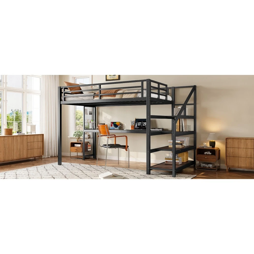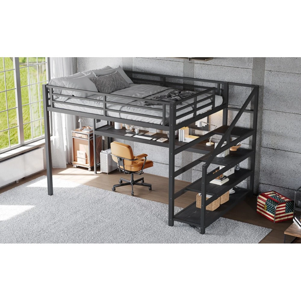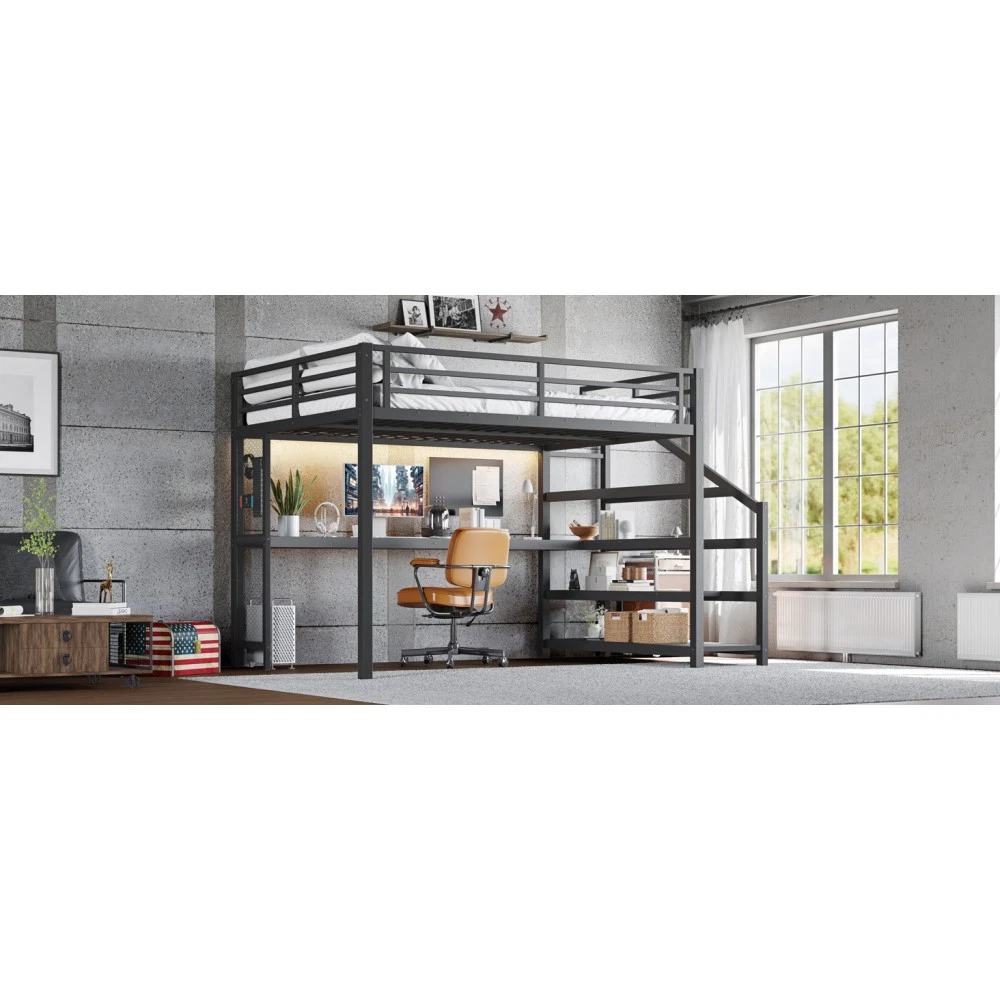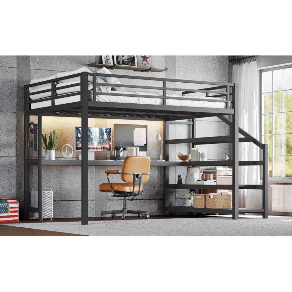 Twin XL Loft Bed with Desk & Storage Stairs, Metal Frame with LED Lights & USB Ports, Noise-Free Black Upgrade your small space with this multifunctional Twin XL loft bed—perfect for apartments, dorms, or family bedrooms! Combining a sturdy sleeping area with a built-in desk, storage stairs, and thoughtful tech features, this bed maximizes every inch of your room while blending style and practicality. Crafted from durable metal and MDF, it offers reliable stability, quiet comfort, and all the functionality you need for studying, working, and relaxing. Space-Saving & Multifunctional Design : This loft bed transforms your room into a versatile living space by integrating a built-in desk, storage stairs, and unique iron nets. The desk provides a dedicated workspace for studying or working, while the stairs offer convenient access to the upper bed (no shaky ladders!) and extra storage options. The iron nets let you hang photos, calendars, or small accessories, adding a personalized touch to your space and keeping essentials within reach. Built-In LED Lights & USB Ports : Stay cozy and connected with built-in LED lights and convenient USB ports. The soft LED lighting creates a warm, inviting atmosphere—ideal for reading or relaxing before bed—while the USB ports let you charge your phone, tablet, or laptop without messy cords. It’s the perfect blend of comfort and tech convenience for modern living. Durable & Stable Metal Frame : Constructed from premium steel with a rust-resistant finish, this loft bed frame ensures long-lasting durability and reliable stability. It supports up to 500 LBS for the upper bed, providing a safe sleeping space for daily use. The combination of metal and MDF materials adds sturdiness, making it a durable addition to your home. Noise-Free Sleep Experience : Designed with noise-reducing rubber plugs, this loft bed minimizes squeaks and friction caused by movement. Enjoy quiet, restful sleep every night without disruptions—perfect for light sleepers or shared living spaces. Easy Assembly Process : All parts are clearly labeled and come with detailed illustrated instructions and a complete tool kit. You can assemble this loft bed quickly and securely without professional help or hassle, getting your new space set up in no time. Key Product Specifications : Color: Black; Material: Metal + MDF; Bed Size: Twin XL; Overall Dimensions: 98.43"L × 41.73"W × 64.96"H; Overall Product Weight: 117.73 LBS; Weight Capacity: 500 LBS (Upper Bed); Recommended Mattress Thickness: 6" (Box Spring Not Required); Product Type: Metal Loft Bed. Package Information : This combo item ships in 2 separate boxes for safe delivery: Box 1 (W1580P407712): 44.49"L × 17.13"W × 5.71"H, 61.51 LBS; Box 2 (W1580P407710): 83.86"L × 14.96"W × 4.92"H, 69.89 LBS. All hardware and assembly tools are included. Important Notes : All pictures are taken from actual samples. Slight chromatic aberration may occur due to lighting conditions or differences in display devices. Please refer to the actual product for the most accurate details. Worry-Free Purchase Guarantee : We stand behind the quality of this Twin XL loft bed with a 1-Year Warranty. If you’re not completely satisfied with your purchase for any reason, we offer a 30-Day Free Return & Exchange Policy. Shop with confidence, knowing you’re getting a stylish, functional, and durable solution for your small space!