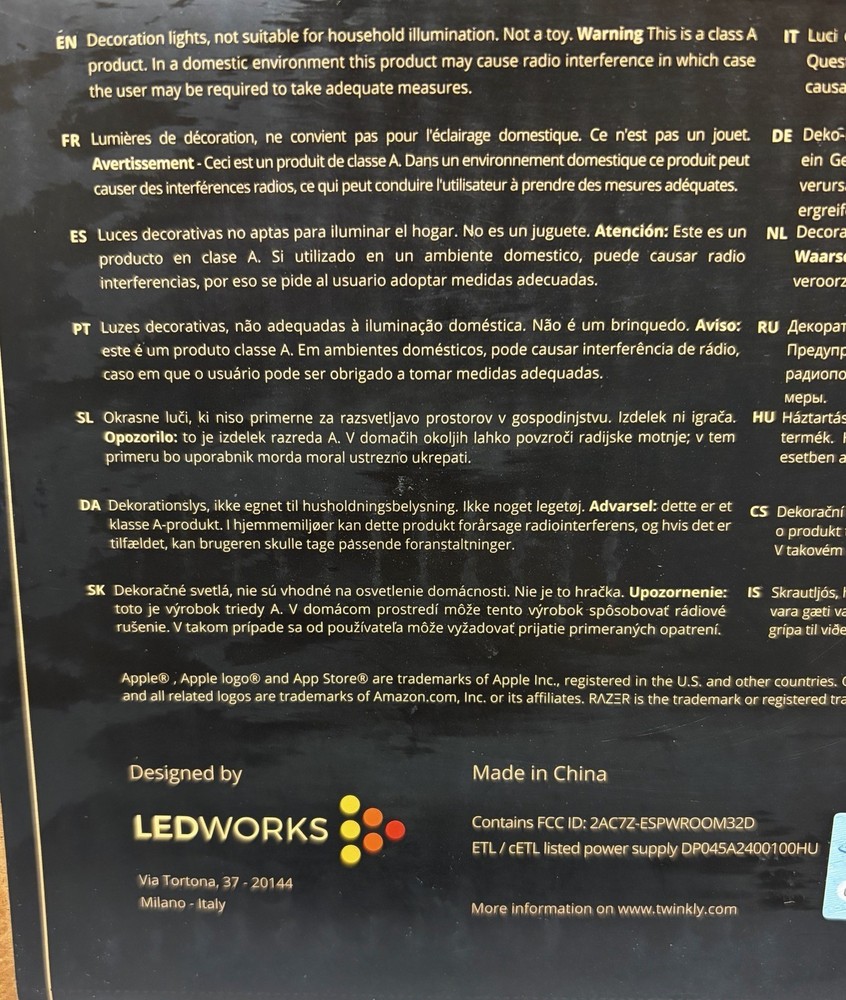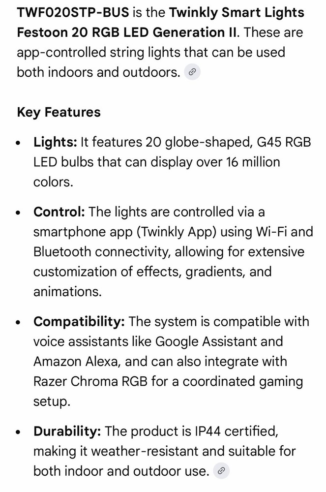 The Twinkly TWF020STP-BUS Smart Lights Festoon 20 RGB LED Gen II is a versatile and colorful string light designed for all occasions. With 20 individual LED lights in a globe shape, this corded light can be controlled using the Twinkly app, Alexa and google for a customized color experience. Whether for a party, holiday, or outdoor patio setting, these smart lights offer a festive and customizable lighting solution for any space. The Twinkly brand ensures high quality and innovative design, making these lights a standout addition to your festive decor.