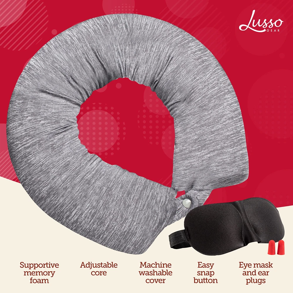 Custom Memory Foam Support: Memory foam rebound technology provides the perfect balance of support and softness, contouring to your head to take the strain off your neck and spine while you travel. Bendable Twist Design for Personalized Fit: A pliable inner spine allows you to wrap your pillow to fit any travel situation and holds its shape while you sleep! Use your pillow on car or airplane headrest as neck, lumbar, or leg support. Removable Pillow Cover for Easy Cleaning: Traveling can be messy. so a fast and easy-to-clean travel pillow is a must. The pillow comes with a removable cover that is machine washable and dryer safe! Attaches to Luggage Instantly: Forget trying to balance your , coffee, plane tickets, and travel pillow all at once. Never lose another travel pillow again! Neck Pillows attach to luggage with an easy-snap button for hands-free mobility. Comes with Eye & Ear Plugs: Includes a light-blocking eye and noise-canceling earplugs to help your body adjust to time changes and avoid jet lag. If you aren’t satisfied with your purchase, let us know and we’ll work with you until you are.