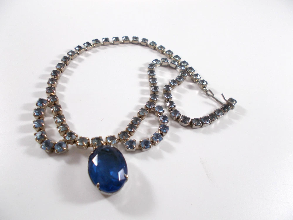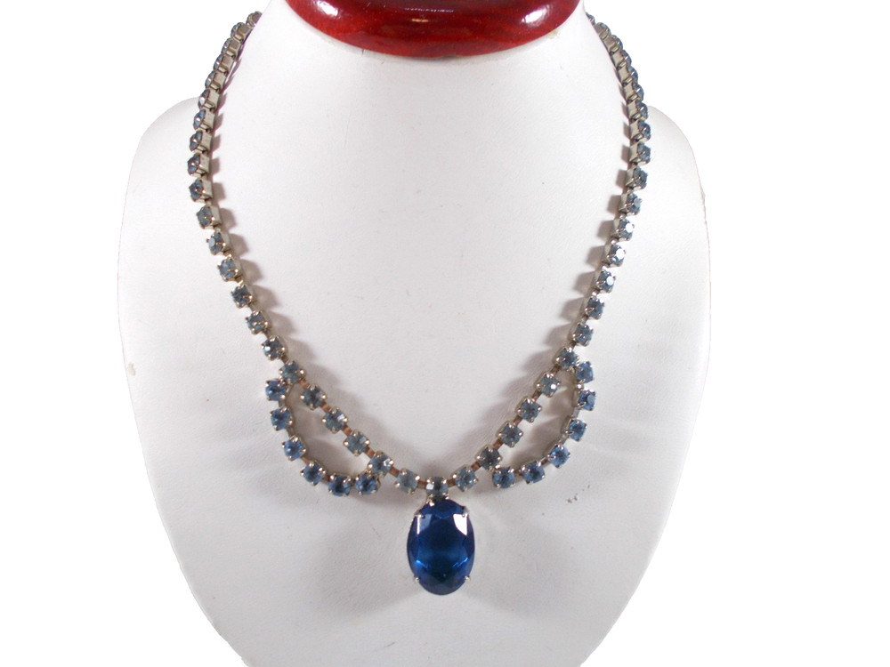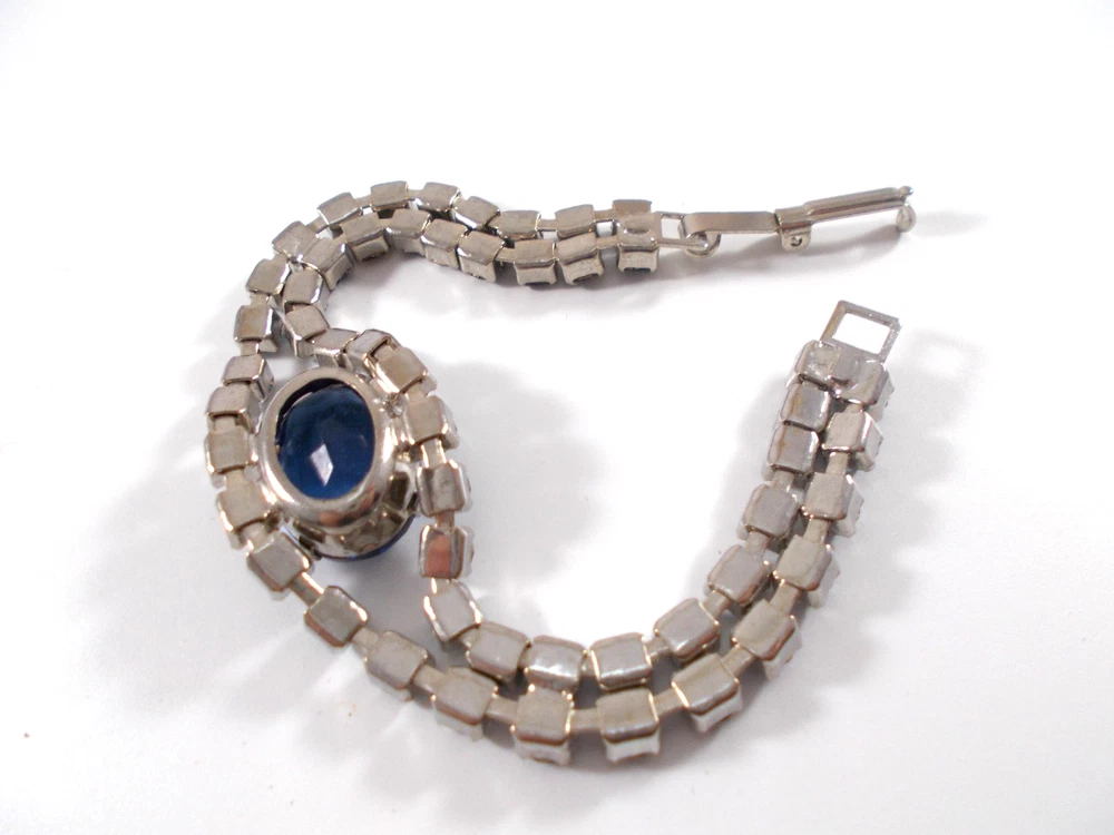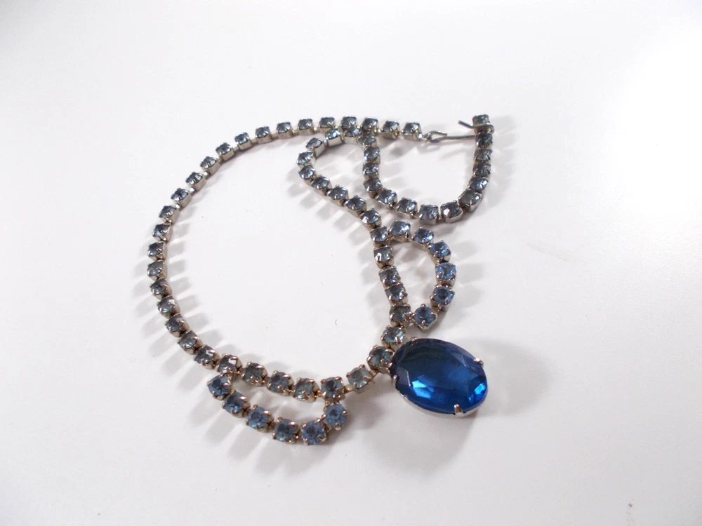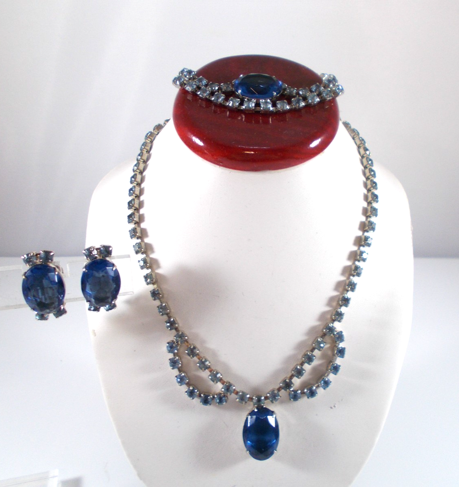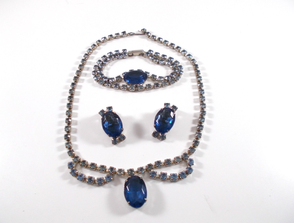 This lovely blue rhinestone set includes a 14" necklace with a hook clasp, a 6" bracelet with a fold over clasp and clip on earrings. the set is unsigned so origin is unknown. Each piece has a 5/8" royal blue faceted oval glass, prong set stone. The necklace has two light blue rhinestone swags in front bordering the large blue drop and a chain made of light blue rhinestones. The bracelet has a double row of light blue rhinestones that border the top and bottom of the large blue stone. The earrings are 1" high with large blue stone accented on the top and bottom with two light blue rhinestones. The pieces have bright silver back finish and all stones are prong set. Gift boxed. Combined shipping is available. $5.00 for first item purchased with USPS Ground Advantage. Plus $1.00 for each additional item purchased at the same time. To combine shipping on items that have different shipping cost methods (flat rate, shipping included, calculated shipping), exact weight of package will calculated and excess shipping will be refunded.