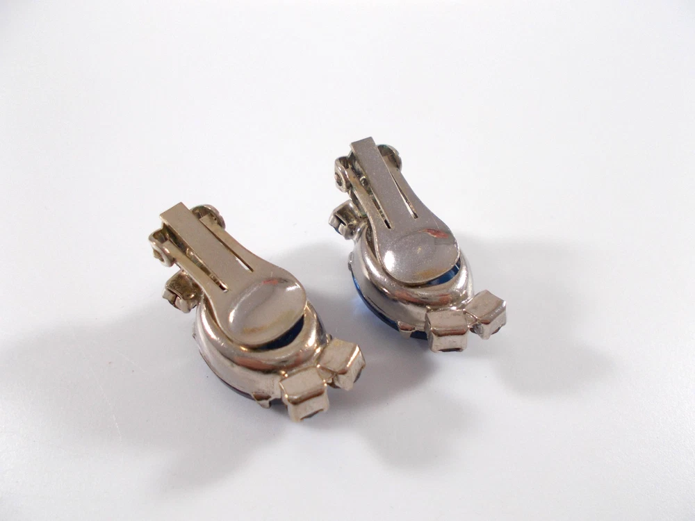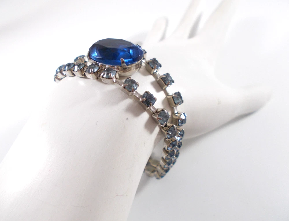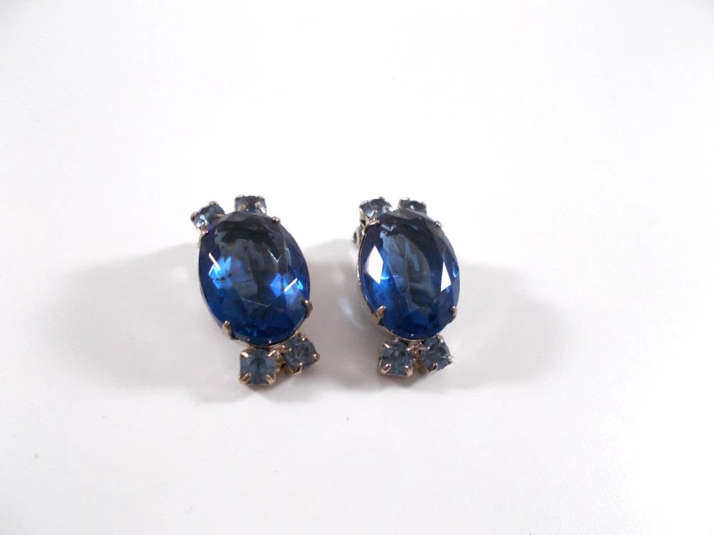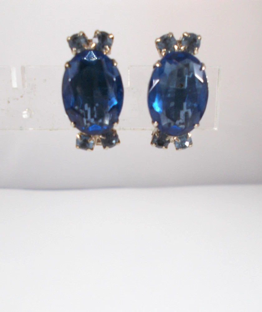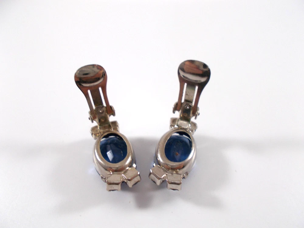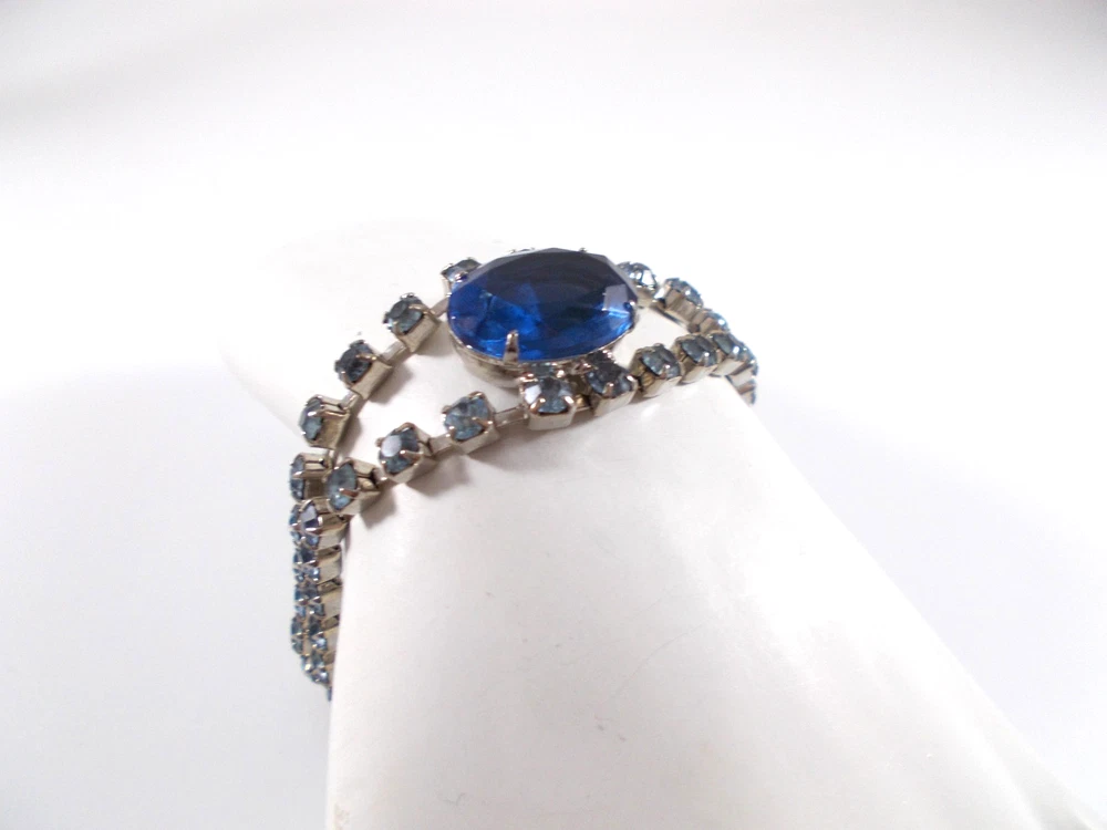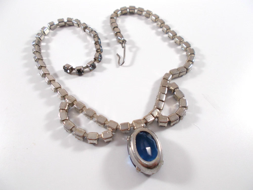 This lovely blue rhinestone set includes a 14" necklace with a hook clasp, a 6" bracelet with a fold over clasp and clip on earrings. the set is unsigned so origin is unknown. Each piece has a 5/8" royal blue faceted oval glass, prong set stone. The necklace has two light blue rhinestone swags in front bordering the large blue drop and a chain made of light blue rhinestones. The bracelet has a double row of light blue rhinestones that border the top and bottom of the large blue stone. The earrings are 1" high with large blue stone accented on the top and bottom with two light blue rhinestones. The pieces have bright silver back finish and all stones are prong set. Gift boxed. Combined shipping is available. $5.00 for first item purchased with USPS Ground Advantage. Plus $1.00 for each additional item purchased at the same time. To combine shipping on items that have different shipping cost methods (flat rate, shipping included, calculated shipping), exact weight of package will calculated and excess shipping will be refunded.