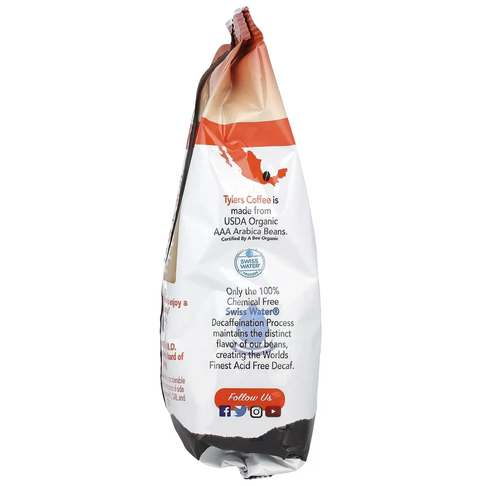 World's First Acid Free Coffee Doctor Recommended* USDA Organic Drink Different, Drink Smart, Drink Tylers Certified by a Bee Organic Swiss Water Process Only the 100% Chemical Free Tylers Coffee is made from USDA Organic AAA Arabica Beans. Decaffeination Process maintains the distinct flavor of our beans, creating the World's Finest Acid Free Decaf. The Benefits of Acid Free Coffee Minimizes the damage to tooth enamel Reduces acid reflux Non irritating to sensitive stomachs Limits heartburn, indigestion, & bloating.