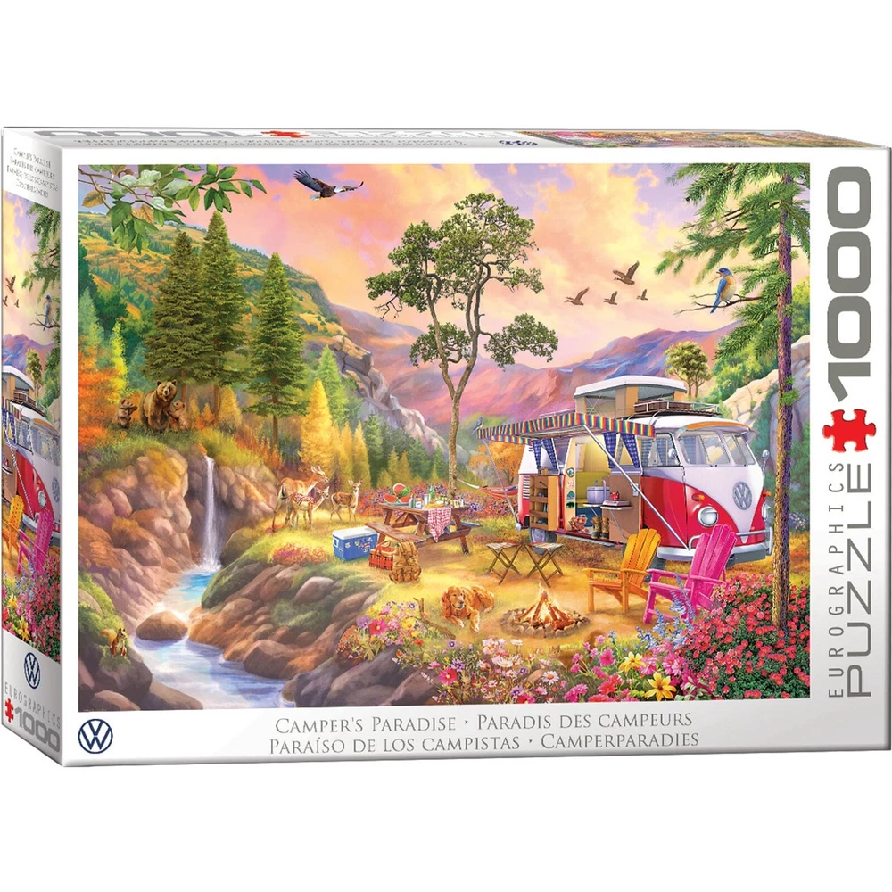 Campers Paradise 1000 Piece Puzzle This stunning puzzle features a detailed and atmospheric image of a campervan parked in a lush forest setting. From the campfire crackling in the foreground to the towering pine trees in the distance, this puzzle is sure to transport you to your happy place. This colorful puzzle measures 19.25 x 26.6 in (48.89 x 67.63 cm) completed. Box size: 10 x 14 x 2.37 in (25.4 x 35.36 x 6 cm). Artist: Bigelow Illustrations Strong high-quality puzzle pieces. Made from recycled board and printed with vegetable based ink. Visit our Mid America Motorworks Air Cooled VW eBay store! We have thousands of Air-Cooled VW Restoration Parts, Performance Upgrades, and personal accessories available to order with the convenience of eBay. Additional items are added daily. Shop with confidence. Family owned and operated for over 50 years. FREE SHIPPING within 48 STATES. If shipping to: Alaska, Hawaii or Puerto Rico please email our eBay Store for a shipping quote. For shipping outside the US please use the eBay Global Shipping program. Thanks for looking. Order Today!