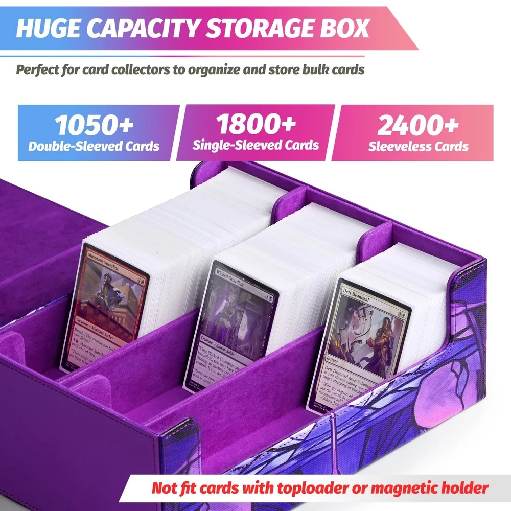 1 Super Large Capacity - The card storage box can easily accommodate over 2400 loose trading cards. It is also suitable for storing 1050+ double-sleeved cards or 1800+ single-sleeved cards, but not compatible with cards in top-loaders or cards held by magnetic card holders. Accessory: 6Pcs card dividers Durable Material - Our trading card box is made of premium leather and soft ultra-fine fiber lining, effectively preventing cards from scratches and keeping them in pristine condition. The high-quality materials and exquisite craftsmanship ensure its extremely long service life. You can enjoy the fun of collecting various favorite gaming cards and sports cards to your heart's content Stylish Appearance with Magnetic Closure - The strong magnetic closure ensures that the card storage box won't open even when shaken hard, preventing cards from falling out. The exterior features a beautiful textured finish, providing not only excellent protection but also adding a touch of style to your cards Versatile Uses - The UAONO card box is sturdy in structure, multifunctional, and offers ample storage space to meet all gaming needs. Perfectly compatible with various collectible card games such as Magic The Gathering, Duel Masters, sports cards, etc. If you need a new card storage solution, this box is definitely an ideal choice Excellent Choice - It is a nice choice for friends and family who enjoy collecting cards, providing a dedicated home for your cards