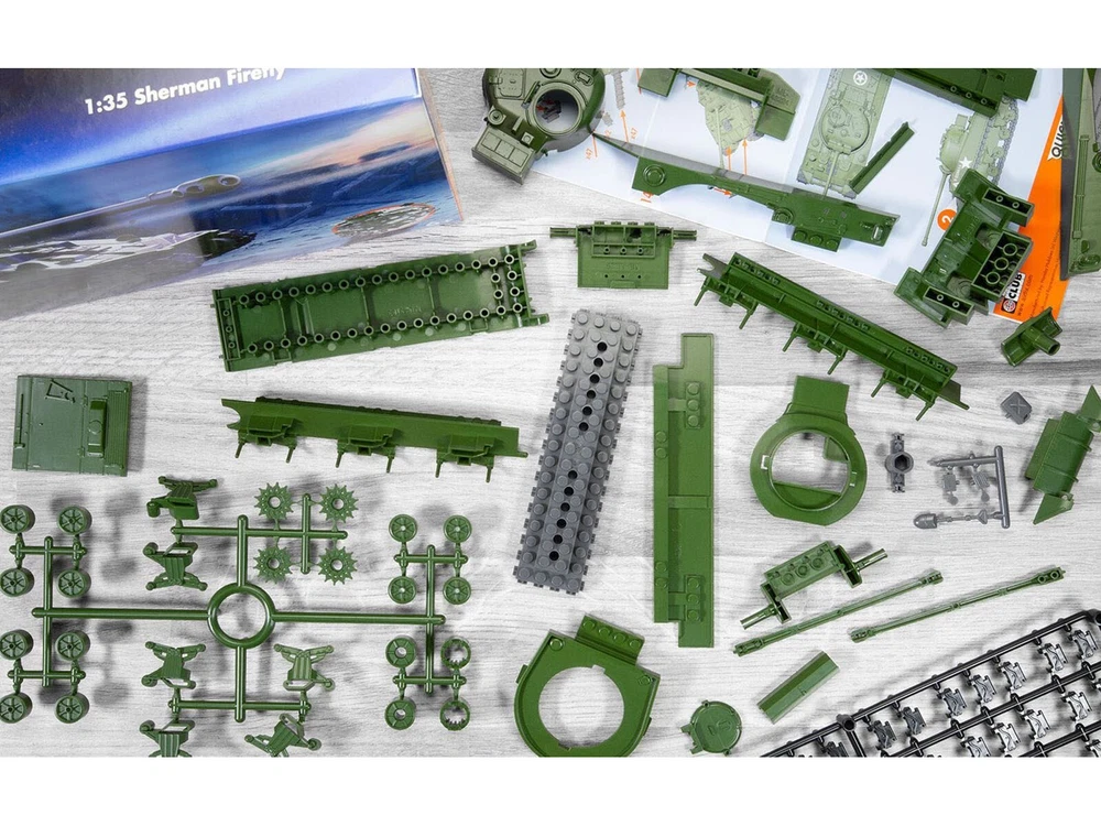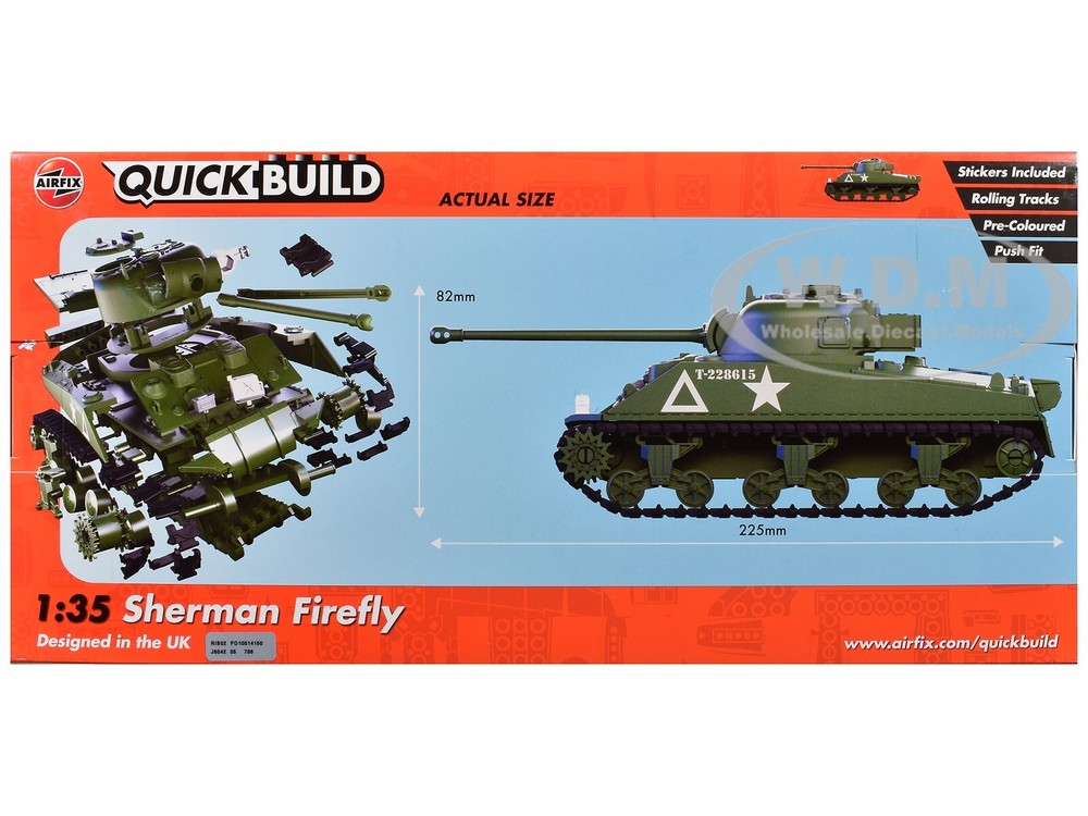 SAVE WHEN BUYING MORE!!! Buy as many items as you wish and we will ship them for one low shipping cost to 48 continental U.S. states physical addresses. Example: Shipping cost for most 1/24 scale items is $10, for 1/18 scale items is $12. If you use Add to cart button and purchase 5 items in 1/24 scale and 5 items in 1/18 scale, your shipping cost will be only $12 for 10 items. In order to request combined shipping for signed in desktop users: Please use Add to cart button for desired items, click Go to cart button and press Request total from us before paying and we will send combined shipping invoice shortly. If checking out as a Guest or using a mobile version, please use Add to cart button then click Go to cart button , press Go to checkout button, request extra shipping refund in Message to seller section and finalize payment by pressing Confirm and pay button. We will refund extra shipping cost shortly. DESCRIPTION: Brand new Sherman Firefly Tank "British Army" Snap Together (Skill 1) Painted Plastic Model Kit 1/35 scale by Airfix Quickbuild. Brand new box. Has rolling tracks. Includes 150 parts. Highly detailed model kit. Detailed interior, exterior. Officially licensed product. No glue or paint is required. Just build. Approximate dimensions: Length-9, Width-3.25, Height-3.25 inches. ABOUT: Airfix QUICK BUILD is an exciting range of brick-based models suitable as an introduction to modeling for any age of 6 and up. The pre-colored pieces simply push together to build an impressive model which can then be decorated with the included self-adhesive stickers. No paint or glue is needed to make these fantastic models look like the real thing, and once completed there's no evidence of any of the brick fittings showing. When built they are tough enough to be used as toys, or smart enough to use as display models. Either will show off those great modeling skills! Included with each model are a full set of easy-to-follow color instructions, free-rolling wheels for cars and tanks, and display stands for all aircraft. The Sherman Firefly was a British modification of the American M4 Sherman tank, designed to address the shortcomings of the standard Sherman when facing the formidable German armored vehicles during World War II. Equipped with the powerful 17-pounder anti-tank gun, the Firefly was capable of penetrating the armor of the German Panther and Tiger tanks, which had proven resistant to the standard 75mm Sherman gun. This adaptation transformed the Firefly into one of the most effective Allied tanks, giving it the firepower needed to counter Germany's armored threats. The Sherman Firefly first saw action during the Normandy Invasion in June 1944. Its impact was immediate and significant, as it provided the Allied forces with a much-needed boost in anti-tank capabilities. The Firefly's long-range accuracy and powerful gun allowed it to engage German tanks from a distance, reducing the risks of close-quarters combat. This capability proved crucial in the battles following the D-Day landings, particularly during the intense armored engagements in the Bocage countryside, where German tanks had previously dominated. The Firefly continued to play a critical role in subsequent campaigns across Western Europe, including Operation Market Garden and the Battle of the Bulge. During these operations, the Firefly's ability to take on the heaviest German tanks helped to shift the balance in favor of the Allies. Its presence on the battlefield boosted the morale of Allied tank crews and provided a significant deterrent to German armored counterattacks. By the end of the war, the Firefly had established itself as a key component of the Allied armored forces, contributing significantly to the overall success of the ground campaigns in Europe. With authentic markings and precise craftsmanship, this 1:35 scale QUICKBUILD model brings to life the Firefly's role in the critical engagements of World War II. It is an essential piece for collectors and military history enthusiasts, commemorating the legacy of the tank that helped turn the tide against the formidable German armored divisions. PAYMENT INSTRUCTIONS: We gladly accept paypal. Tracking info is free upon request. SHIPPING INFO: We do combine shipping cost for two or more items purchased. Please check shipping and payment section. In order to receive combined invoice for multiple purchases, please purchase items and let us know when you are done shopping, so we can send you one combined invoice. We can only combine shipping cost if items paid in one transaction. Dear Valued Customer! We appreciate your business. BUY WITH CONFIDENCE Fast Order Fulfillment 99% of orders are shipped within 24 hours or sooner. Simple Return Policy Thirty days simple returns. More than 10 Years of Experience Family owned and operated, we’ve had the experience of selling online for more than 10 years. Satisfaction Guaranteed! Our feedback says it all. And now, we hope to have the chance to prove we are the best to you! Competitive Pricing and Unrivaled Selection We are the number one direct distributor of diecast model cars in the USA, so we are able to provide very competitive pricing. Our stock selection is unrivaled with over 4,500 different items. Quality Shipping & Handling We package all our orders with care using bubble wrap to protect models from damage in transit. Each model that has a fragile window box is covered with carton protection. Excellent Customer Service Our customer service is second to none with thousands of returning, satisfied customers from all over the world.