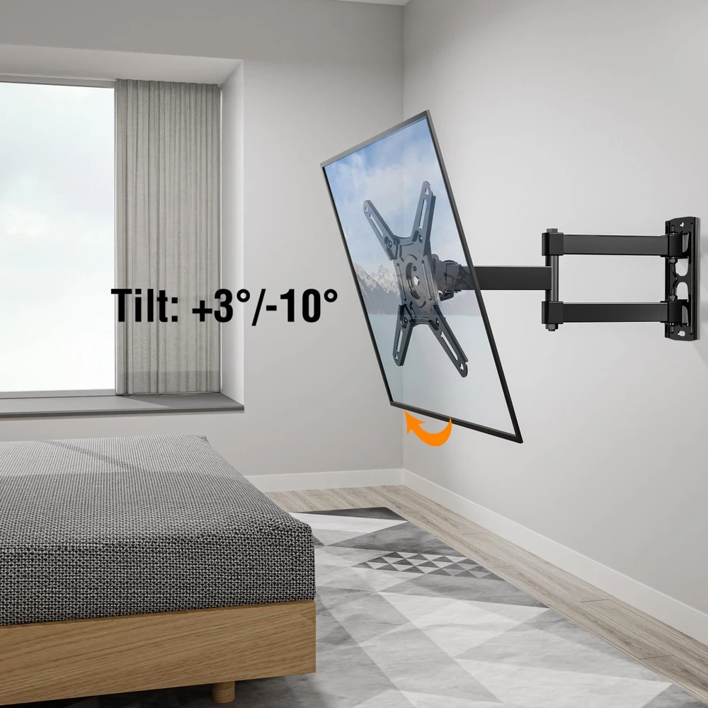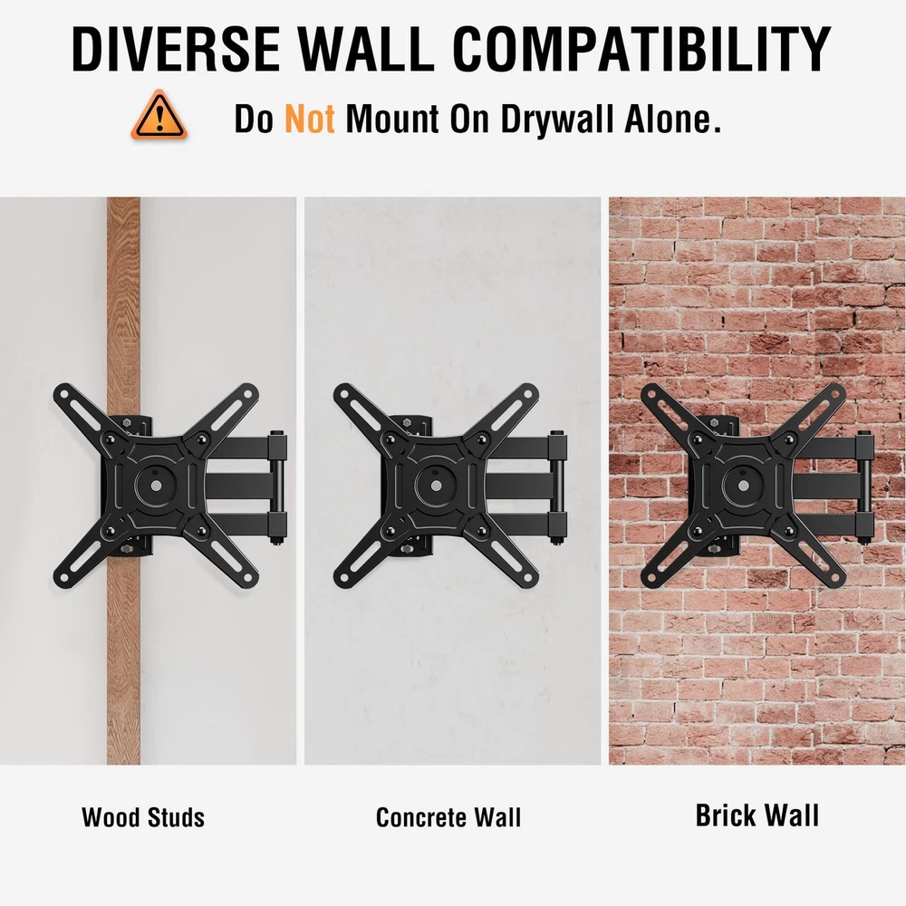 TV Wall Mount Applicability - This TV mount fits most 14-42 inch LED/LCD TVs and monitors, with 33 lbs. MAX loading and VESA sizes from 75x75mm to 200x200mm. This wall mount TV bracket is designed for single wood stud or concrete/brick walls. 180° Rotation & Swivel Design - With the 180° rotation unique design, the full motion TV mount can easily display in landscape or portrait position to meet your special need. Also, this swivel TV mount can swivel TV 180° to cover any angles in your home for the ultimate viewing experience. Adjustable for Max Flexibility - This TV wall mount bracket can tilt TV +3°/-10° to reduce glare. The strong articulating arm provides a smooth 14.96" extension and 2.67" depth to the wall for saving space. Universal Monitor Wall Mount - Our monitor mount fits monitors sizes 14-42 inch with VESA patterns from 75x75mm to 200x200mm. This wall monitor mount can keep your monitor to eye level and mount your monitor at an ergonomic sitting position to reduce eyes train and neck pain while saving up much space on your desktop. Easy Installation - The TV wall mount package comes with a completed hardware mounting kit, and the step-by-step instructions will guide you through the simple assembly and installation process. NOTE: DO NOT install into drywall alone. Concrete wall anchors will be sent per request.