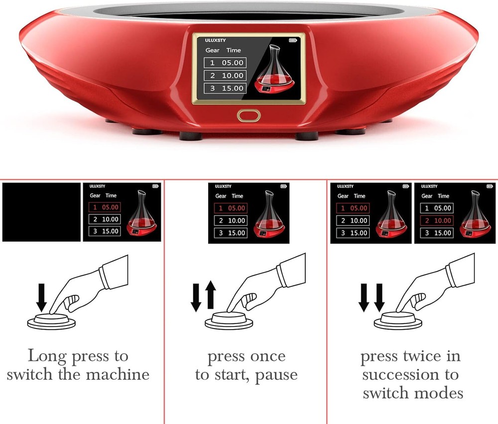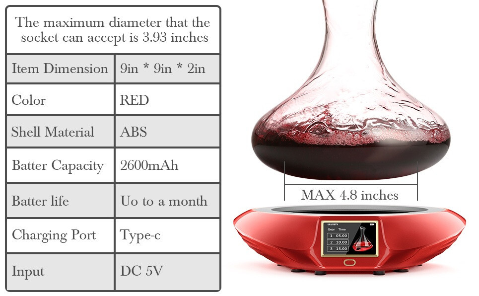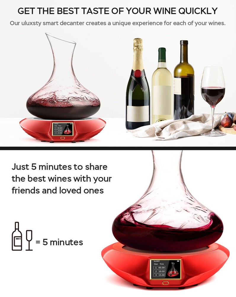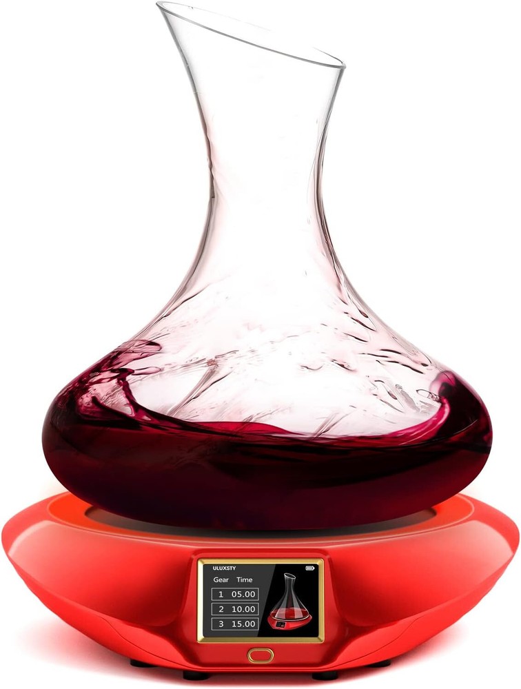 New In Box - Does not come with battery or glass seen in pictures - Only the red base electronic seen in pictures is the decanter! 【Releases Natural Flavors of Red Wine】ULUXSTY Electric wine decanter can bring you an unprecedented high-end experience. Automatic shaking and precise time control, can retain the mellow taste of red wine, making the red wine smooth and delicious. Allowing you to drink high-quality red wine at any time. 【Three Different Decanting Time】The electric wine aerator has 3 kinds of time mode adjustment: 5 minutes / 10 minutes / 15 minutes. You can choose the appropriate decanting time according to your needs. It can be used to sober up a variety of wines, such as red wine, whiskey, sweet wine, etc. 【Tri-Color Led Light Adds Romantic】The noble red base and three-color atmosphere light, fashion design that adds radiance to your home. The hops produced by ULUXSTY smart decanter dispenser are more ornamental. Let you enjoy the nice atmosphere when you gather with family and friends. 【Luxury Wine Lovers Gift】Suitable for parties, bars, restaurants, carnivals, it can be used for various festival celebrations, a necessity for holding wine nights. As an ideal gift to "wine lovers", surprise your friends with this unique electric decanter shaker on Christmas, thanksgiving day, anniversary or wedding.