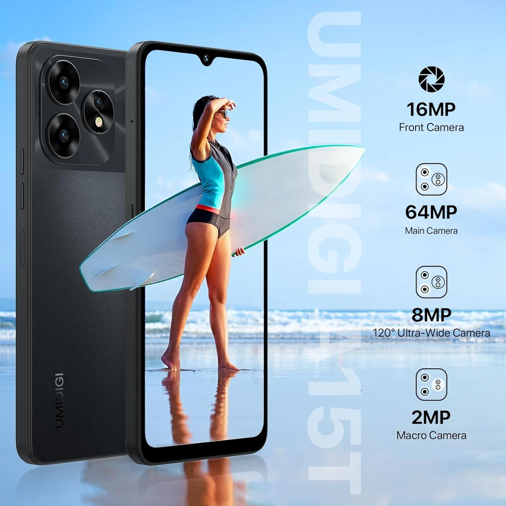 Store New Arrivals Add to Favorite View Feedback Contact UMIDIGI Unlocked Android Phones, A15T Smartphones, 5000Mah (8+8)+128GB/TF 1TB Expand, Ultra-Slim 6.7" Screen Mobile Phones, Android 13 NFC AGPS, 64MP AI Camera 4G Dual SIM Unlocked Cell Phone, Black Description Item model number A15T Whats in the box Power Adapter, Protector Film (applied), SIM Tray Ejector, USB Type-C Cable, Phone Case Connectivity technologies Wi-Fi Memory Storage Capacity 128 GB Other display features Wireless Battery Capacity 5000 Milliamp Hours Operating System Android Other camera features Front Wireless communication technologies Cellular, NFC Brand UMIDIGI Battery Power Rating 5000 Milliamp Hours Wireless Carrier Unlocked for All Carriers Audio Jack 3.5 mm Model Name A15T Form Factor Smartphone Manufacturer UMIDIGI Ram Memory Installed Size 8 GB Phone Talk Time 6 Hours Item Weight 6.9 ounces Connectivity Technology Wi-Fi Human Interface Input Touchscreen Standing screen display size 6.7 Inches GPS True Weight 195 Grams Color Rock Black Screen Size 6.7 Inches Batteries 1 Lithium Polymer batteries required. (included) Cellular Technology 4G OS Android Product Dimensions 6.57 x 2.95 x 0.31 inches Size 8+128GB 【Up to 16GB RAM+128GB ROM & Octa-Core Helio G95 Processor】: MediaTek Helio G95, clocked at up to 2.05 GHz. 16GB RAM (8GB virtual RAM) and 128GB ROM (expandable up to 1TB), this phone provides ample storage space, allow to run multiple apps simultaneously 【Ultra-Slim Body, Only 8.6mm & 195g Weight】: A15T unlocked android phones have a thickness of 8.6mm and weights just 195g. The lightweight and stylish design of this cell phone ensures a comfortable grip, makes it easier for you to carry 【5000mAh Battery & 18W Fast Charge】: A15T unlocked phones equipped with powerful 5000mAh battery, support 18W fast charging, Type-C charging port. This unlocked cell phone provide you with long battery life from early morning to late night for daily use 【6.7" HD+ Large Screen】: Featuring large 6.7 inch HD+ capacitive touch screen with resolution of 1650*720, 21:9 aspect ratio, and a 87% screen-to-body ratio, A15T android phone unlocked delivers vibrant colors and enhanced contrasts,provides a visual feast 【Multi-Function for Easy Use】: This mobile phones is fingerprint and face unlocked, NFC for Google Pay, FM radio. Faster and more accurate location with GPS, AGPS, Beidou, GLONASS, and Galileo navigation system.Hotkey button can customized quick access app 【64MP+ 16MP Professional Photo System】: 64MP ultra-clear main camera to capture stunning and vibrant colors. This cell phones support time-lapse, slow motion, panorama, portrait,night mode.16MP front camera "AI Beautify" mode capture your beautiful moments 【Ultimate Game Experience】: This smartphone equipped with gyroscope. Aim, steer, navigate through the game world by tilting or moving your phone, more interactive and engaging. Dynamic speaker delivers immersive sound for crystal-clear and crisp audio 【Dual SIM Phone & 4G Global Bands】: 2 card slots, so 2 Nano SIM cards or Nano SIM + TF cards can be inserted at the same time. Support 4G Global network, this unlocked smartphones compatible with most major carriers in USA, Canada, Europe, etc Product Description UMIDIGI A15T 2024 Unlocked Android Phones The video showcases the product in use. The video guides you through product setup. The video compares multiple products. The video shows the product being unpacked. 1 6.7''HD FULL SCREEN 2 MediaTek Helio G95 3 Android 13 4 5000mAh Battery 1 64MP+16MP Camera 2 Time-Lapse Mode 3 Slow Motion Mode 4 Night Mode 5 Panorama Mode 1 NFC for Google Pay 2 Powerful Hotkey 3 FM Radio 1 Doble Unlock 2 GPS 3 Gobel LTE Bands Powerful Gyroscope And Speaker for Ultimate Game Experience ABOUT US We offer the best prices around on high quality products. Our E-store includes media such as books, movies, music and games while offering electronics, toys, sporting apparel, clothing, tools, general home, garden items and more. SHIPPING We are always working hard to ensure your package arrives as soon as possible. Please understand that some factors like weather, high postal traffic, and the performance of shipping companies are outside of our control. We offer free shipping to the lower 48 states and ship within 2 business days of payment, usually sooner. We do not accept P.O. Boxes. Please provide a physical address. RETURNS We offer a 30-Day Return Policy on items which you are not completely satisfied with. You have the option for a full-refund or an exchange of the item. No returns are available on items shipped outside of the USA. PAYMENT We accept PayPal. CONTACT US This page content is yet to come Please ad us to your favorite seller and visit again later Thank You CUSTOMER SATISFACTION We try our very best to make sure every customer is completely satisfied. If there's a problem, message us! We're happy to help.