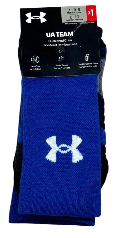 UNDER ARMOUR UA TEAM Cushioned Crew Socks Royal Blue U7704P1 Men 7-8.5 Women 6-10 NEW In Pack!!! Please See All Pictures. UNDER ARMOUR UA TEAM 1-Pair Cushioned Crew Socks MEN’S US Shoe Fit Size Available: 7-8.5 WOMEN’S US Shoe Fit Size Available : 6-10 PATTERN: Solid COLOR : Royal Blue RETAIL PRICE: $14.00 + Tax Description: 9% Nylon, 88% Polyester 3% Spandex Machine Wash Cold Imported