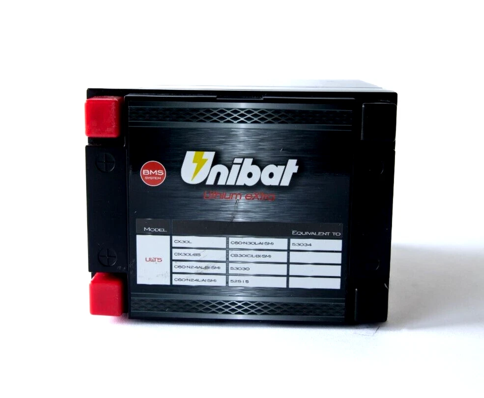 Unibat Batteries Lithium battery. Replaces all SLA and AGM lead batteries. At only 4.1 lbs (1.9kg) Unibat Lithium is about 3x lighter than any conventional lead acid battery. This maintenance free and spill proof battery comes with a 4 post terminal to be fitted and located in any position on your frame. The strong starting currents generated by the lithium battery power allow safe, repeated and consecutive starts even at low temperatures. Each lithium battery has an estimated life of over 5 years and over 2000 complete charge/discharge cycles. It guarantees operation even after long periods of inactivity. What's included with every battery: 2 year Manufacturer Warranty Advanced BMS System monitors temperature, overcharge, discharge, battery life Spacers to facilitate each battery size 2000+ complete charge/discharge cycles Expedited charging time - 6 minutes = 90% Charge 4 post terminal - mounting in any direction Maintenance Free Spill Proof 3x lighter than conventional lead acid battery 720 CCA (cold cranking amps) 154Wh Power 4.1 lbs light weight Ready to go out of box, no pre charging needed Low environmental impact Replaces Yuasa, OEM, Parts Unlimited, Mighty Max Batteries: ARCTIC CAT OEM 0445-115 CAN-AM OEM 515176151 CF MOTO OEM 31023004 POLARIS OEM 4014609 & 4010630 YIX30L-BS YB30L-B YB30CL-B GYZ32HL Y60-N30-A Y60-N24AL-B Y60-N24L-A Y60-N30-A 52515 53030 53034 Track Page Views With Auctiva's Counter