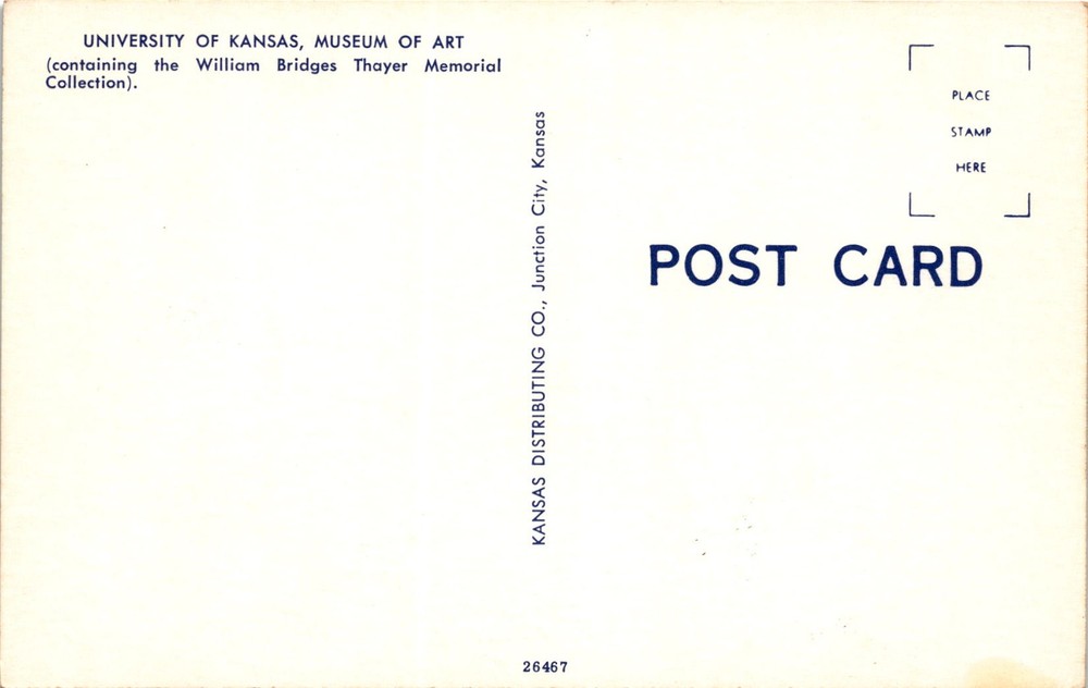 MAKE AN OFFER. THE MORE YOU BUY THE BETTER DEAL I WILL ACCEPT The postcard mentions the University of Kansas Museum of Art, which houses the William Bridges Thayer Memorial Collection. The museum is located at the University of Kansas in Lawrence, Kansas. The William Bridges Thayer Memorial Collection is a significant part of the museum's holdings and features a diverse range of artworks.