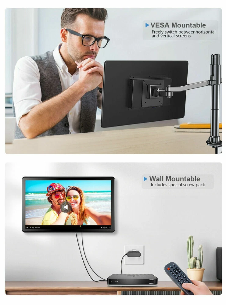 UPERFECT Touch 15.6" LED IPS Widescreen LCD Monitor Full HD VGA DVI USB No Stand Features đ´[Multiple Port Connections]: UPERFECT external monitor is equipped with Standard HDMI, DVI and VGA three interfaces, compatible with laptops, Macs, Raspberry Pi, TV boxes, PS4, Xbox, industrial medical and other equipment to meet the needs of connecting various devices. đ´[Striking Contrast Ratio 2000:1 ]: UPERFECT touchscreen monitor features astounding 2000:1 contrast ratio,300cd/ăĄand 100% sRGB to obtain better daylight contrast and no blacklight bleeding effect in the night time, creates true blacks, bright whites, sharp detail, and crisp text, delivers you excellent brightness and sharpness. đ´[Precise Capacitive Touch Control]: 15.6 inch Touch Screen with Full HD IPS 1080P is smooth feel, and support swipe, scroll, drag and pinch gestures to help you get tasks done more efficiently. No extra driver needed, just connect the touch cable we provide to your device to achieve the touch function. đľNOTE: For mobile phone,game devices(XBOX, PS4,etc.), the touch-function is unresponsive. đ´[Revel in Symmetrical Narrow Border]: A good look everyone will flip for. The symmetrical narrow border, full-screen and rounded edges make UPERFECT monitor body smooth, which looks beautiful and textured. UPERFECT sleek portable display can be for business, for work, for learning, for industry, or you can personalize it. đ´[VESA Mountable & Complete installation package]: VESA-compatible screws (75mm x 75mm @M3) special package for the monitor has been presented for you to facilitate your installation, and ensure the monitor can be easily mounted to on the wall or desktop with monitor arm or stand, making your space planning more flexible. High Contrast Ratio The contrast ratio of 2000:1 can display more colors in the dynamic video, and the image is clearer and more eye-catching. Due to the high contrast, the faster the light-dark transition in the dynamic image, the more human eyes can distinguish this process, giving a more impactful visual effect. Flicker-Free Technology Looking at the computer or mobile phone screen for a long time is extremely harmful to our eyes. NEWSOUL monitor adopts flicker-free and low blue light technology to protect the eyes and and make it easier to watch for a long time. 100%sRGB NEWSOULâs display adopts 100% sRGB, covering more red and green, making the picture clearer and brighter, allowing people to see more real colors, providing excellent brightness and clarity. Rounded Edges The frameless, full-screen, and rounded edges make NEWSOUL monitor body smooth, which looks beautiful and textured. Symmetrical Narrow Border Symmetrical frames are rare in the market. This is a technological innovation of NEWSOUL. The symmetrical frame is more beautiful, making the display look beautiful and textured, and outdoor office makes you more decent. Built-in Dual Speakers NEWSOUL adopts customized 2W long lifetime dual stereo speakers produce huge immersive 360-degree sound with deep and accurate SPECIFICATIONS ----Screen size: 15.6 inches ----Resolution: 1920x1080 ----Color: black ----Screen Ratioďź16:9 ----Color gamutďźNTSC72% ----Response time:30(Tr+Td)ms ----Refresh rate:60hz ----Panel Type: IPS (Full Viewing Angle) ----Backlight type: Highlight LED ----Average brightness: 300cd / m2 ----Contrast: 2000: 1 ----Interface type:USB port/DC 12v port/HDMI port/DVI port/VGA port/Audio in port/Audio out port ----Machine size: 37.66cm*22.64cm*3cm ----Type of port ----USB: For Touch function ----DC 12V: For power ----HDMI: For signal transmission ----DVI: For signal transmission(no audio) ----VGA: For signal transmission ----Audio in ----Audio out ---Material: aluminum alloy Support Laptop Models ----Ap ple: MacBook 12"ăMacBook ProăMacBook AirăiP ad Pro 2018 ----HUAWEI: MateBookăMateBookXăMateBookXProăMateBookE ----Honor: Magic ----MIUI: Air 12.5"/13.3"ăPro15.6"ăMIUI Game Book ----ASUS: TUF3ăU306ăU321 SeriesăU4100ăROG Series ----Lenovo: Yoga5 ProăThinkPad_Xl Carbon 2017ăMiix 720 ----HP: Pavilion x2ăEliteBook Folio G1 ----DELL: XPS13ăXPS15 ----Google: ChromeBook Pixelsă PielBook Pen ----Razer: Blade Stealth ----Microsoft: Surface Book 2 Support Game Devices ----All Brand: PS4/PS3/XBOXONE/SWITCHâŚâŚ WHAT'S IN THE BOX? ---- 1Ă 15.6 Monitor ---- 1Ă Standard HDMI Cable ---- 1Ă Monitor Stand ---- 1Ă 5.5mm DC Power Cable ---- 1Ă Micor USB Power Cable ---- 1Ă Manual Terms of sales Payment Delivery details About us Contact us Terms of sales About OUR's Item â OUR âs monitor(O r other item ) is our factory products, high quality.If you are satisfied my service, Could you please leave a Positive Feedback to us.Thanks a lot. â OUR âs monitor is electronic product,new industry, new technology; If there is malfunction or problem in product or service.For example, Unstable Voltage, No reponse, Screen problem, Don't know how to use. You can contact us to solve the problem.We will solve any problem in 24 WORK hours efficiently. Please Don't open Return Requested or leave Negative feedback(it is important to us,Buyers should be patient when encountering electronic products and wait for our solution). I will be much appreciated with your support and understanding. â OUR âs monitor (O r other item ) ,If you want to return and refund, you can contact us via eBay message too. We accept eBay messsage returns and refunds too; We will offer a return shipping label or refund right away. We promise the most satisfied solution for you anytime.And if there is must to open Return requested,please choose the Reason :"Didn't like item" "Changed mind" Or "Doesn't fit"(it is important to us).Thank you again. â OUR âs monitor (O r other item ) , Don't worry, we are a top rated plus seller, Our every products have Warranty.we will give you the most satisfied answer. Payment Delivery details About us Contact us