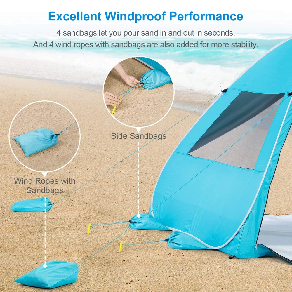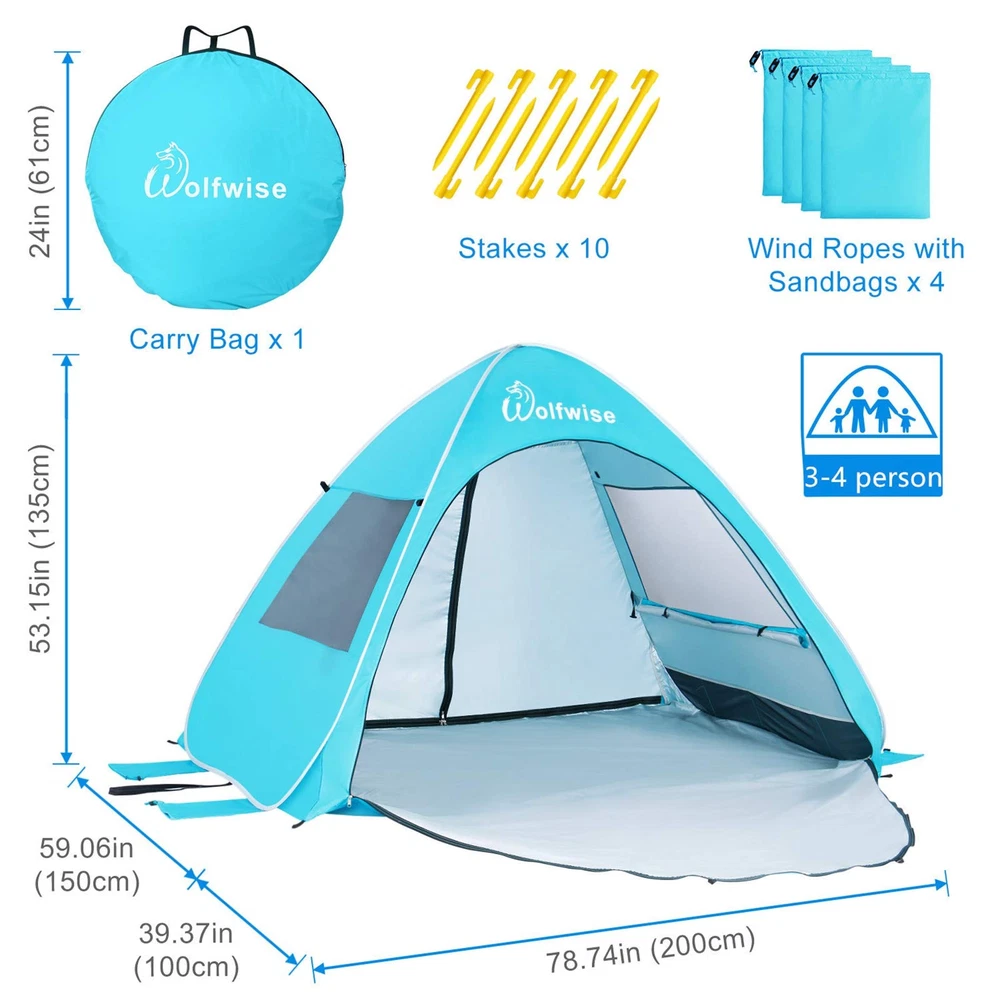 Pop Up Design & Super Large Space: The specially designed pop-up beach tent sets up well in seconds, no assembly required. The open size is 78.74" L x 59.06" W x 53.15" H with a 39.37" front porch, providing a spacious interior shelter that comfortably fits 3-4 people or 2 regular beach chairs. Weighing just 4.96 lbs, it folds down to a travel size of 24" L x 24" W x 1.97" H. Comes in a handy carrying bag to make it easy to fit in the trunk of a car. UPF 50+ & Water Repellent: You love the beach, but what about the blazing sun and sunburns? The pop up tent is made of polyester and eco-friendly silver coating that effectively blocks up to 98% of the sun's harmful UV rays, providing all-day protection for your family on the beach. And the water-repellent fabric design will provide you with temporary shelter during light rain, so please avoid using it in heavy rain. Two-way Entrances & Great Ventilation: The large front entrance combined with the full-zippered rear door provides easy access and maximum ventilation. Unzip the front door and there is a front porch to give you room to stretch your feet. Two enlarged mesh windows reduce the temperature inside the tent, making you enjoy great ventilation and breeze. Versatility: There is a hook at the top of the tent to hang lights or a small-sized fan. 2 long mesh storage pouches are added below the two side windows to store your phones, magazines, towels or other personal items. Not only is it perfect for activities at the beach, but also at the park, backyard, sporting events, music festivals, or weekend trips.