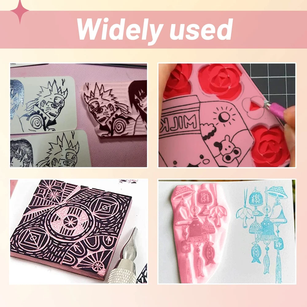 Description UPlama 4 Pcs Rubber Block Stamp Carving Block Stamp with Cutter Tools for Printmaking, Printing and Stamp Soft Rubber Crafts What you can get:4 rubber blocks, 1 set of carving tool, Easier carving than linoleum blocks. Size:6x4 inch, To ensure you get the correct information, all dimensions are shown in the picture. Suitable for:These carving block are suitable for printers,,clip art and newspapers. Material:The rubber block stamp block is made of premium quality soft rubber for clear and fine detail creating, It will be easier to carve into the shape you want by using the tools we prepared. Good for making stamps. Ideal for school and home.