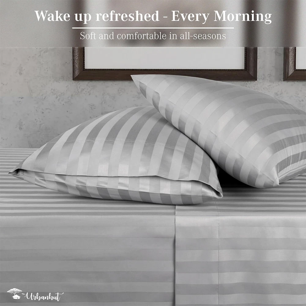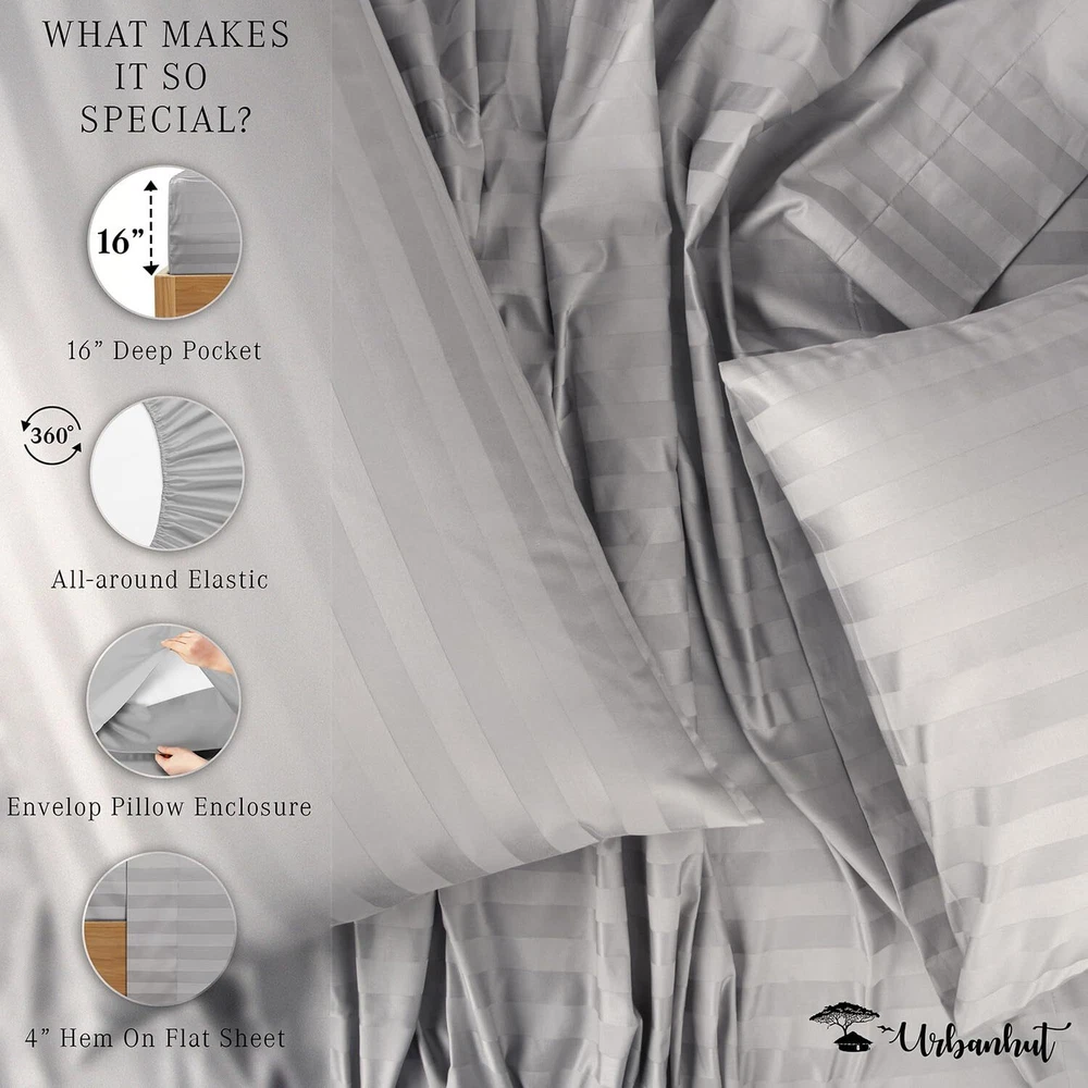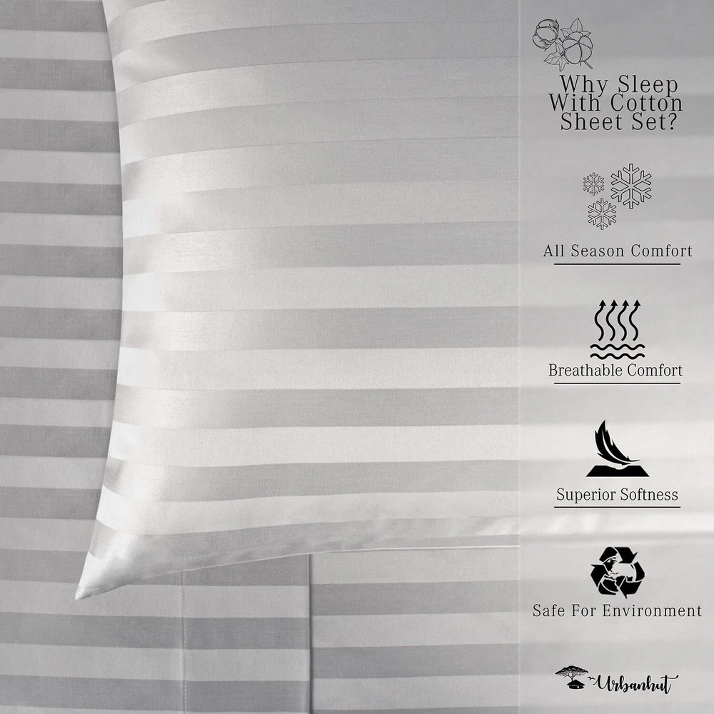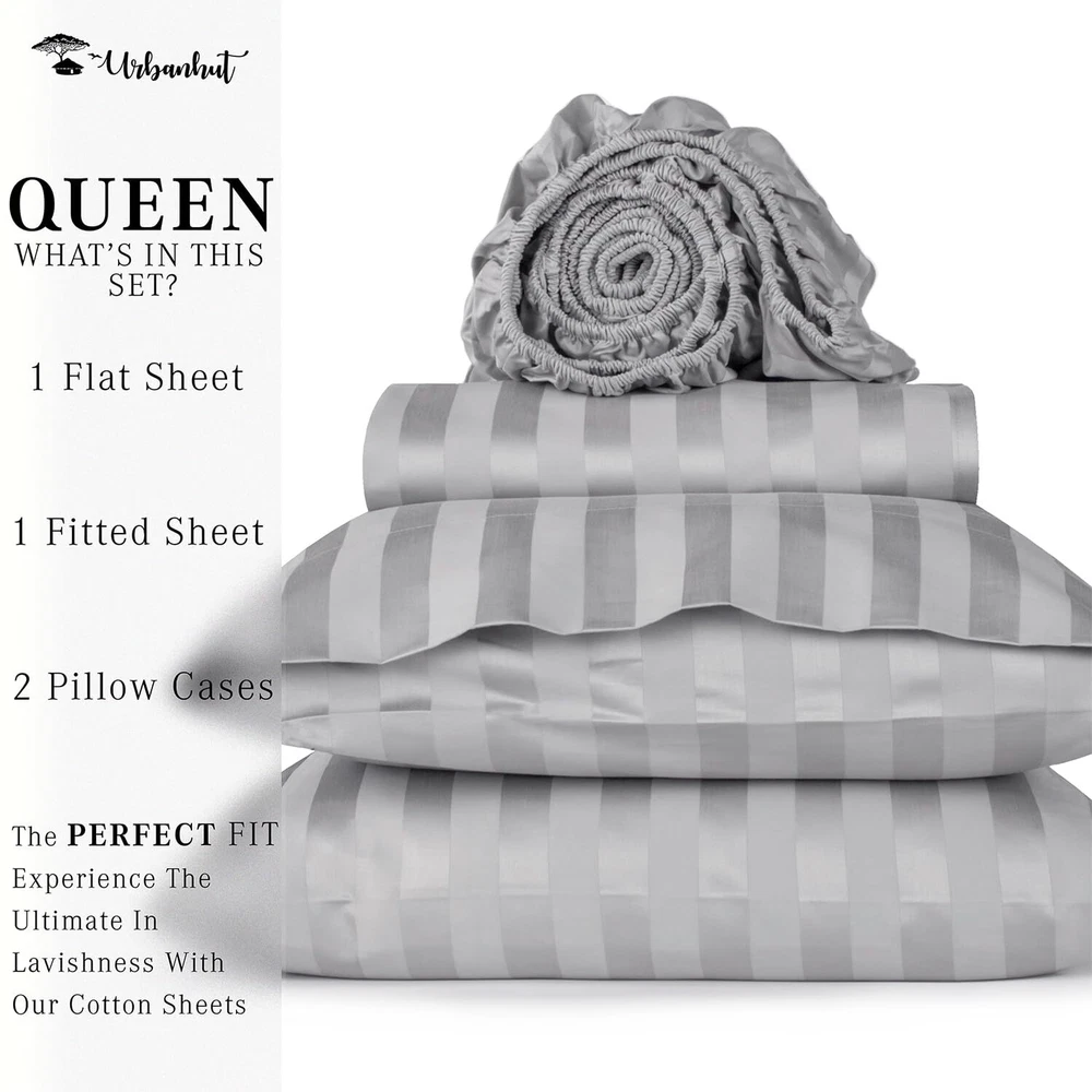 Experience Luxury Cotton: Immerse yourself in luxury with our 100% pure cotton Striped sheets, boasting 1000 threads per square inch. The sateen weave and long-staple cotton yarns deliver the ideal blend of breathability and durability, perfect for night sweats and ensuring a silky-soft feel akin to 5-star hotel bedding. Perfect Fit with Elastic Deep Pocket: Enjoy year-round comfort with our heavy and breathable Queen sheet set, designed to keep you cool in summer and cozy during winter. Each 4-piece Queen sheet set includes 1 flat sheet (91" X 102"), 1 fitted sheet (60" X 80" ), with a 16" deep pocket, and 2 pillowcases (21" X 32"). The all-around elasticized deep pocket ensures a snug fit without bunching. Crafted for High Quality & Longevity: Urban Hut premium bedsheets resist fading and become softer with each wash, offering a lifetime of comfort. Each sheet is individually measured and stitched to guarantee maximum comfort and durability. They undergo rigorous testing for color fastness, minimum shrinkage, and no pilling, ensuring superior smoothness. Certified Green Weaving & Dyeing: We take pride in our commitment to eco-friendly practices. Our sheets are made using certified green weaving and dyeing techniques. All dyes, auxiliaries, and sheets are OEKO-TEX certified, ensuring safety and sustainability. Our manufacturing facilities use renewable energy sources like windmills, and we implement rainwater harvesting methods to minimize our environmental footprint. Commitment to Our Customers: Our commitment to your satisfaction goes beyond comfort and luxury. We are fully devoted to serving our customers with the utmost care and attention, thanks to our 30-day return policy. Gift our high-quality sheets to your loved ones or enhance your room decor with bespoke luxury.