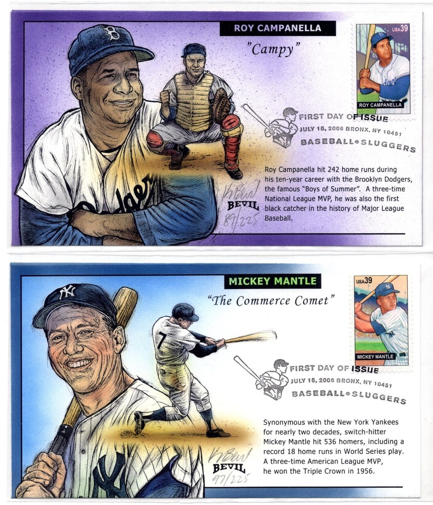 US 2006 BASEBALL SLUGGERS FOUR HAND-PAINTED FDCs OF ALL-AMERICAN HEROES MICKEY MANTLE, MEL OTT, ROY CAMPANELLA PLEASE VISIT MY EBAY STORE : Filatco Stamps BUY 5 ITEMS SHIPPING & REGISTRATION IS FREE INTERNATIONAL BUYERS PLEASE NOTE: EBAY AND PAYPAL REQUIRE REGISTRATION FOR TRACKING INTERNATIONAL SHIPMENTS. EBAY CHARGES $12.61 FOR SHIPPING LABELS WITH TRAKING # US POST OFFICE CHARGES $14.95 FOR REGISTRATION # + POSTAGE BUYER HAS THE CHOICE OF SHIPPING FIRST CLASS MAIL WITHOUT TRACKING # FOR $2.50 . IN THIS CASE BUYER ACCEPTS RESPONSIBILITY IF ITEM IS LOST IN TRANSIT. Feel free to ask if you have any questions. PAYMENT WITHIN 2 DAYS IS APPRECIATED . FEEDBACK : I APPRECIATE YOUR BUSINESS AND MY TOP CONCERN IS TO MAKE SURE YOU ARE 100% PLEASED WITH ANY ITEM YOU PURCHASE. IF YOU HAVE A CONCERN OR A PROBLEM WITH INVOICE, SHIPPING OR ANY ITEM YOU RECEIVED PLEASE CONTACT ME FIRST BEFORE YOU LEAVE ANY FEEDBACK. I GUARANTEE YOU WILL BE 100% SATISFIED WITH THE TRANSACTION. I WILL CERTAINLY LEAVE YOU A POSITIVE FEEDBACK AS SOON AS I RECEIVE YOURS.