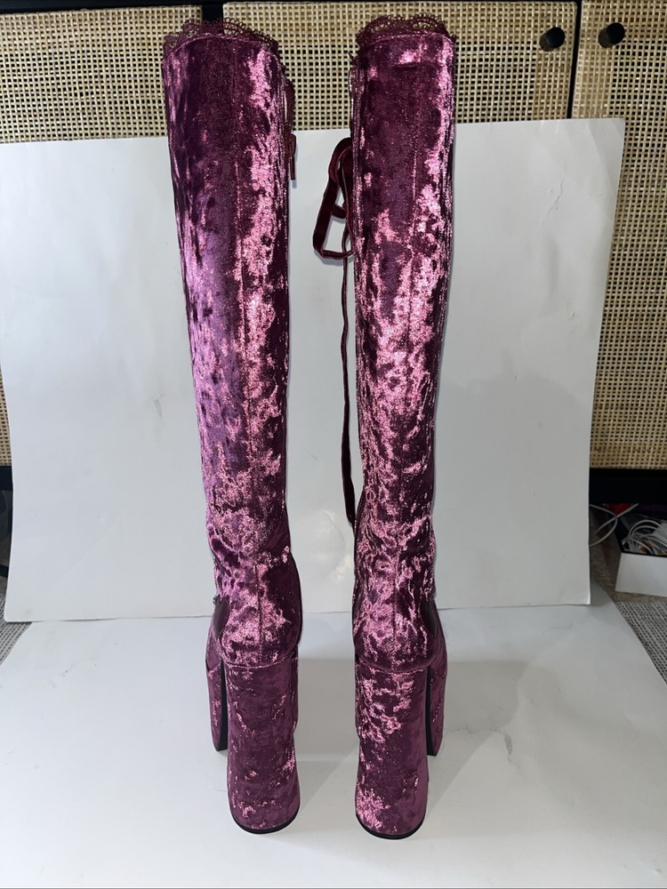 Brand:SugarThrillzColor:PinkUpper Material:SyntheticType:BootDepartment:WomenFabric Type:VelvetStyle:PlatformUS Shoe Size:7Model:Sugar Thrillz Material World