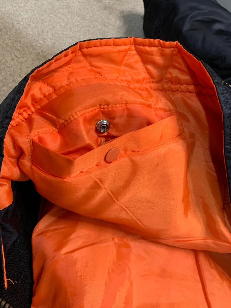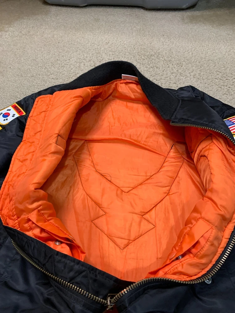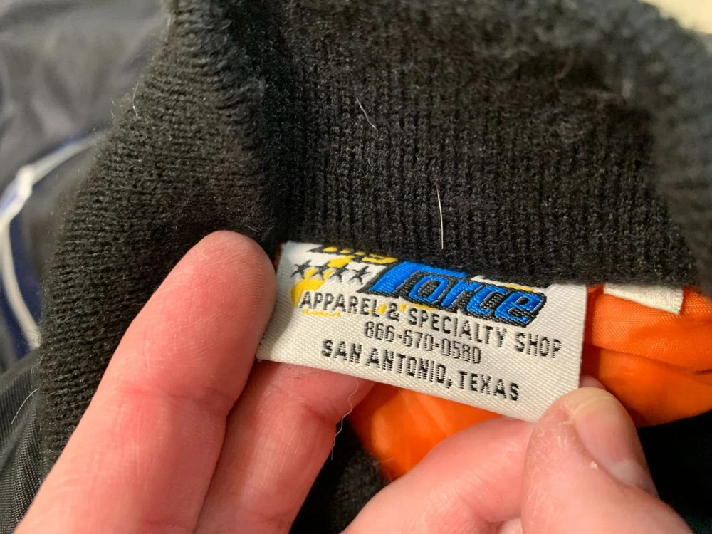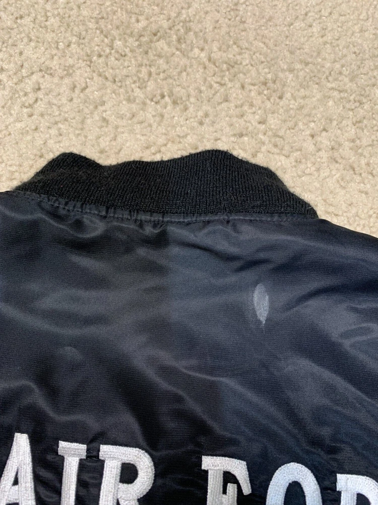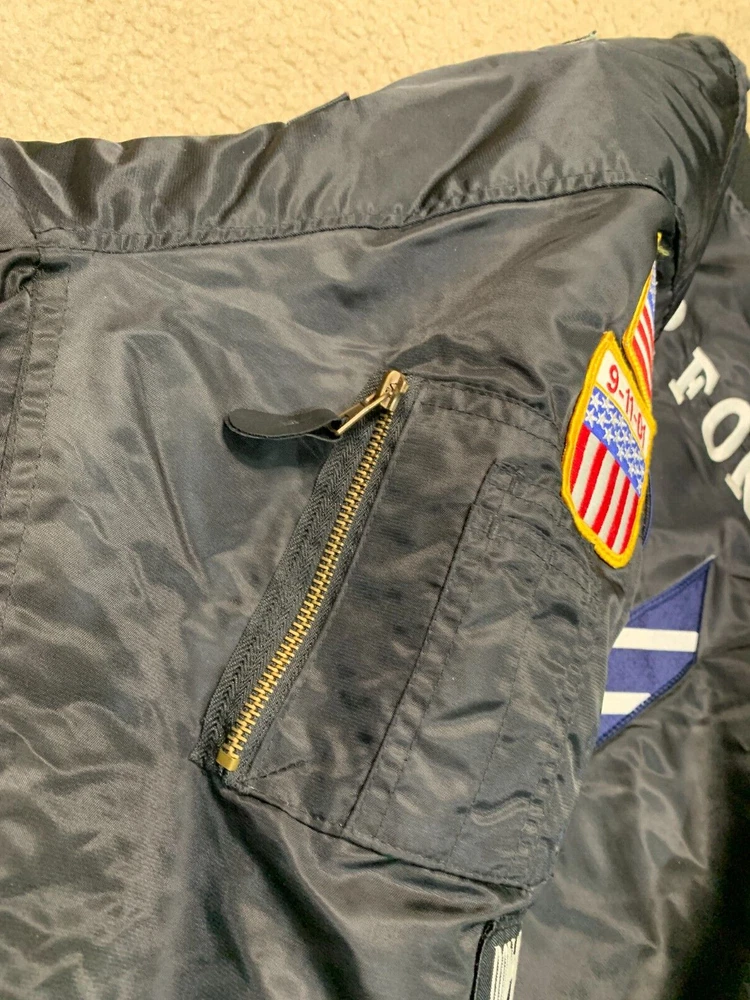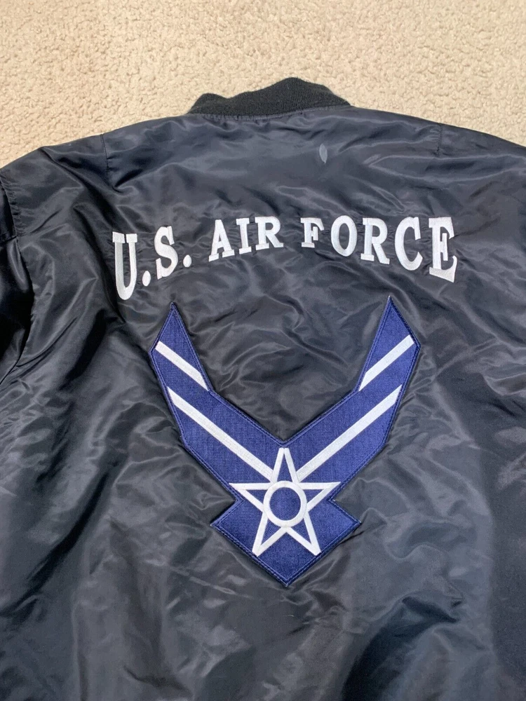 Get ready to rock the U.S. Air Force Nylon Bomber Jacket by My Force! This black bomber jacket is made of high-quality nylon material and features a full zip closure. The jacket is embroidered with a logo and zipper accents, giving it a stylish look. The jacket is available in size L and is a regular fit for men. It is perfect for winter, fall, and spring seasons and is made in China. The vintage jacket has a USA theme and is great for those who love Flight brand. The lining of the jacket is also made of nylon, ensuring comfort and durability. All of our items are shipped from a SMOKE-FREE environment.