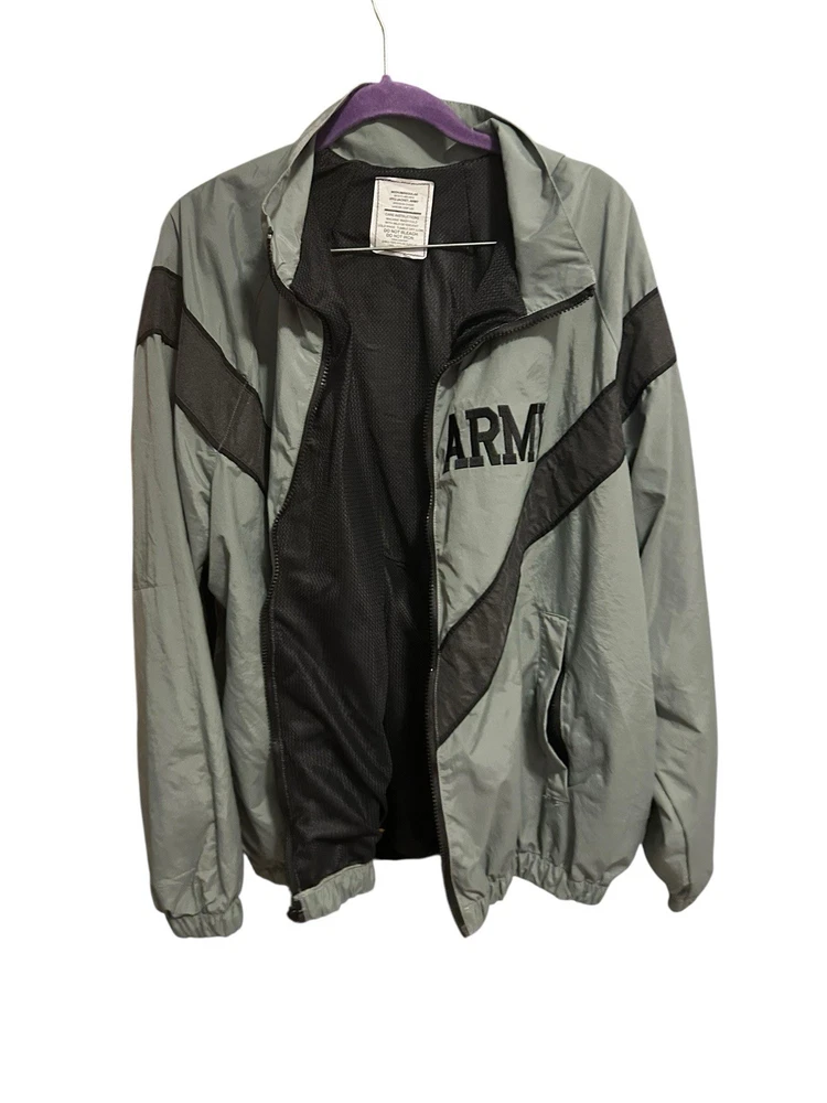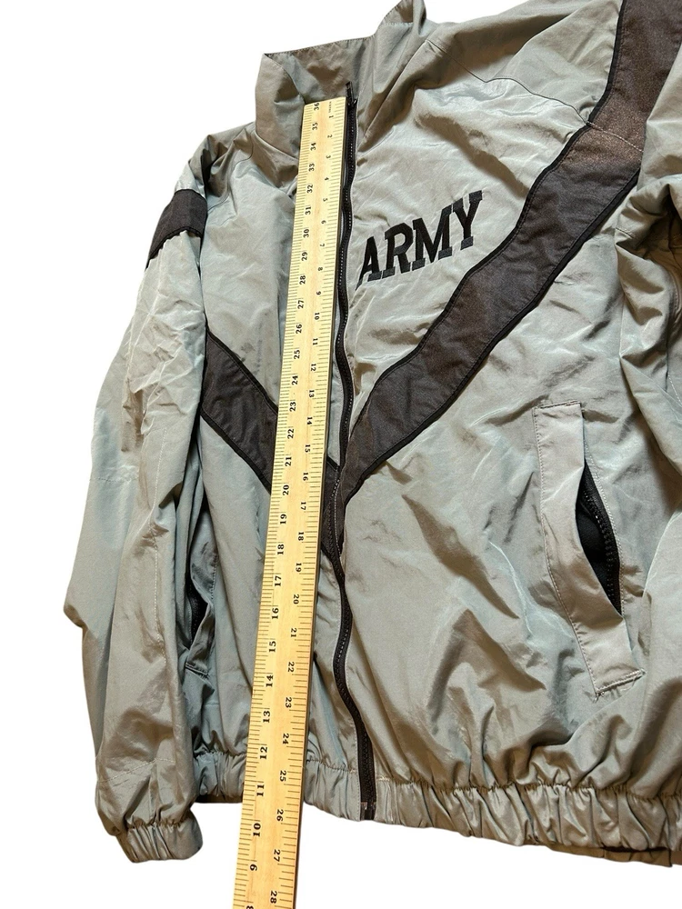 US Army Military Physical Training PT Uniform Sweat Jacket IPFU size Medium Regular Good used condition. Minimal signs of wear and tear. Please study pictures carefully before purchasing Please review the pictures Very carefully, before purchasing, for condition, details, and measurements. We do our best to describe accurately all of our items. The Approx. Measurements Laying Flat (not doubled) : 25" Top to Bottom Length 24" Shoulder to shoulder 29.5" Armpit to Armpit 24” Sleeve length 17" Width at Hip Feel free to ask any questions. Thank you for visiting our store! BagC02