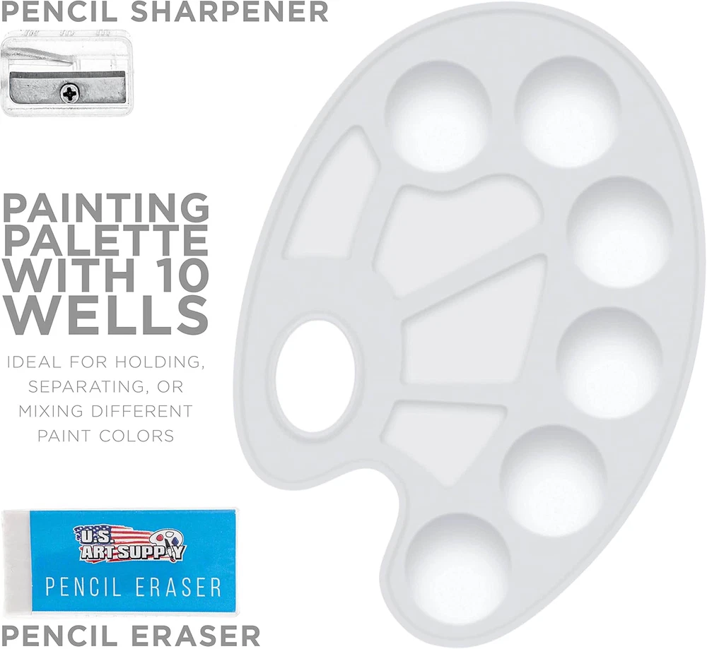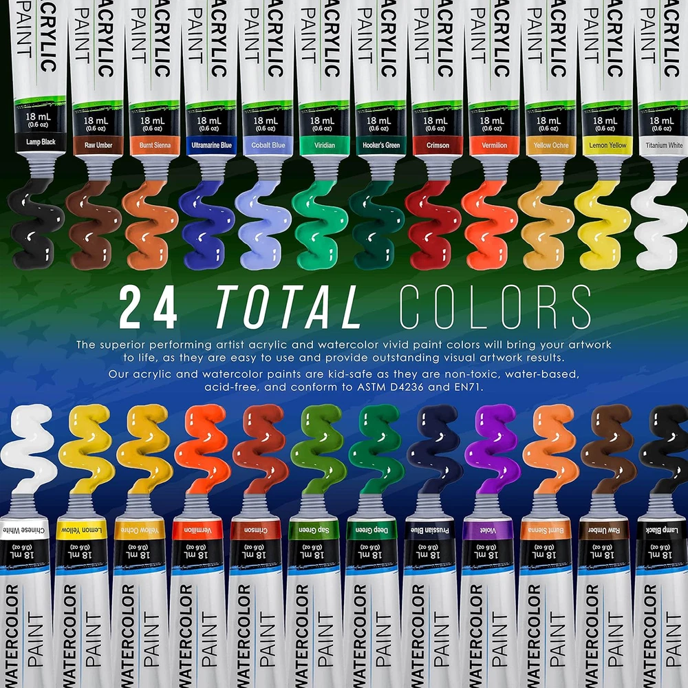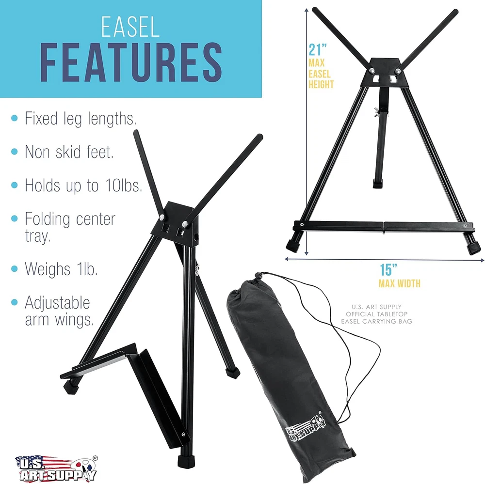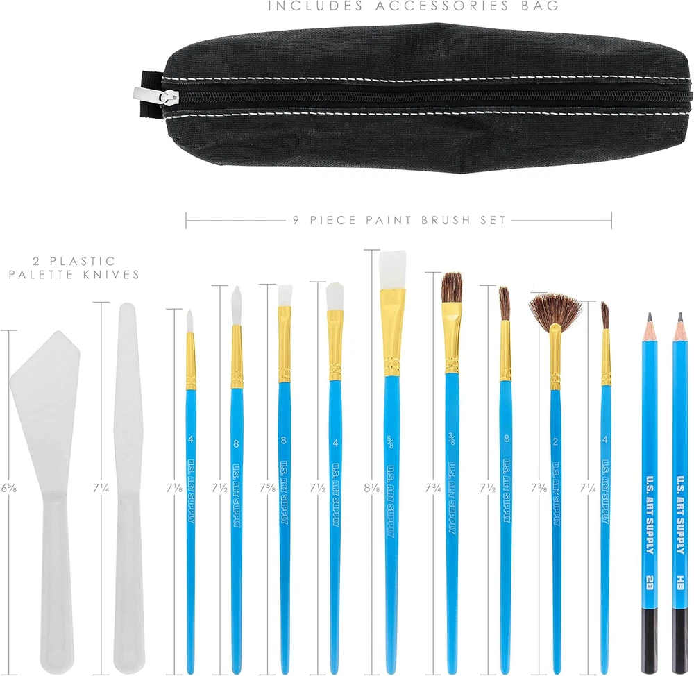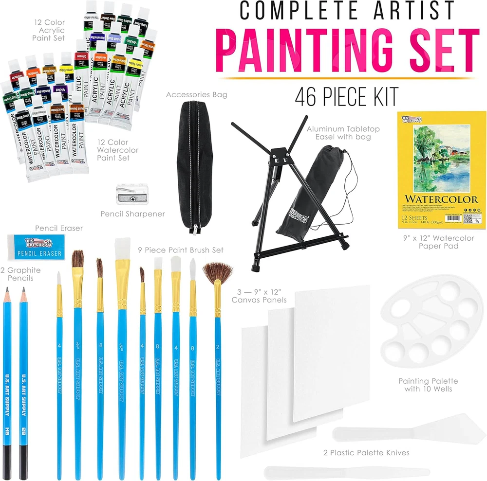 A complete premium quality 46-piece artist painting set that contains everything an artist needs to create their masterpieces! It contains premium professional-grade vivid paint colors, an essential assortment of brushes, canvas painting panels, a watercolor pad, an easel, and all the tools and accessories needed to create amazing artwork! Aspiring artists, art students, and professional artists love using this fun, safe, and easy-to-use painting set! This set includes all the essential components that every level of artist needs to be creative and practice all the standard painting techniques. The superior performing artist acrylic and watercolor vivid paint colors will bring your artwork to life, as they are easy to use and provide outstanding visual artwork results. Our acrylic and watercolor paints are kid-safe as they are non-toxic, water-based, acid-free, and conform to ASTM D4236 and EN71. The durable adjustable 15" to 21" high black aluminum tabletop easel securely holds the canvas panels, so you can easily draw with the included pencils and paint with the brushes and palette knives. U.S. Art Supply is a national industry leader in Art Supplies. Buy with Confidence: Backed by a trusted brand dedicated to your satisfaction, we ensure a hassle-free experience every time.