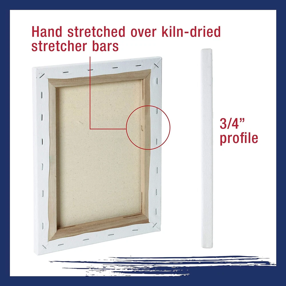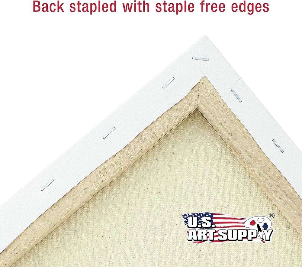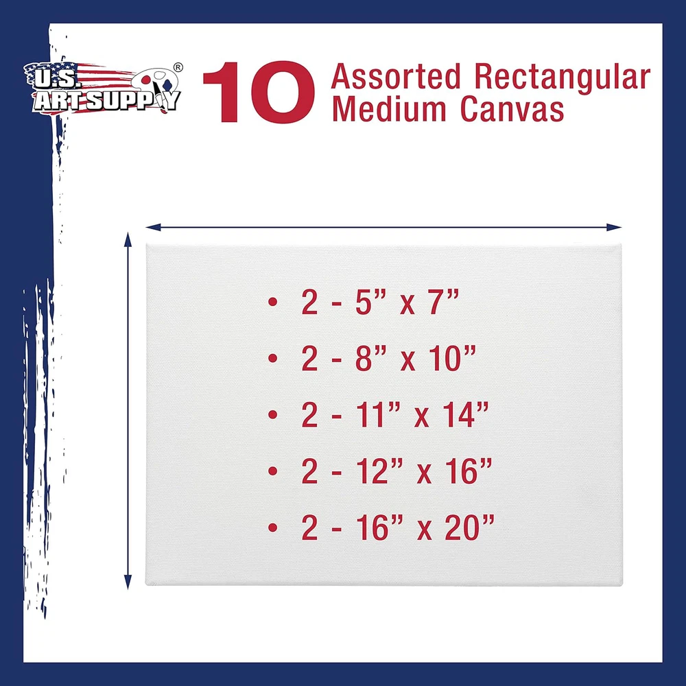 Professional Artist Quality: Multipack of 10 Assorted Medium Size Canvases, 2 Each 5x7, 8x10, 11x14, 12x16, and 16x20 Inches. 3/4" thickness profile 12-ounce triple gesso primed stretched canvases that are suitable for all types of painting media and all skill levels of artists. 100% Cotton Canvases: Pure cotton canvases with medium grain, so they hold the paint well without absorbing it and keep their natural tone and glossiness. Durable Construction: These premium canvases are hand-stretched tightly onto kiln-dried pinewood stretcher bars and back stapled to create clean edges. Firm and sturdy lightweight frames are easy to store, carry, and hang. The stretcher bars come from environmentally managed forests. Heavy-Weight: 12-ounce finished weight. Triple primed with acid-free acrylic titanium gesso, providing the perfect surface for painting masterpieces. Multi-Use: Ideal for use with acrylic, oil, watercolor, gouache, tempura, pouring paint, airbrush paint, and other wet or dry painting media. Ideal ready-to-paint canvases for art studios, art students, class projects, painting parties, or anyone that enjoys creating pieces of art. Used and loved by aspiring artists, art students, and professional artists!