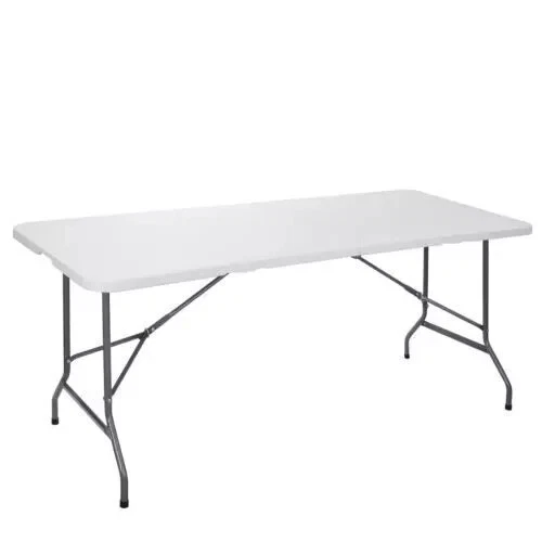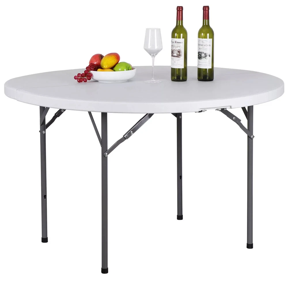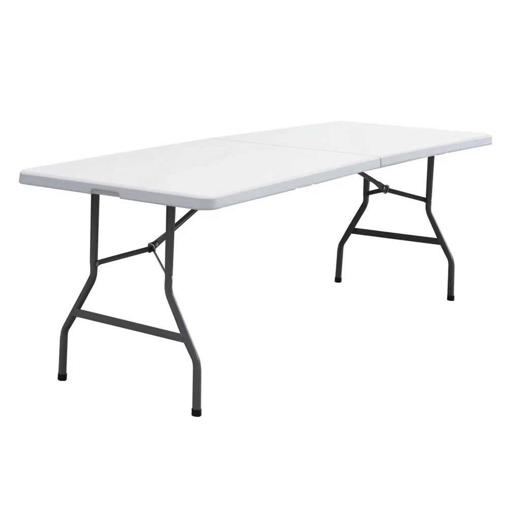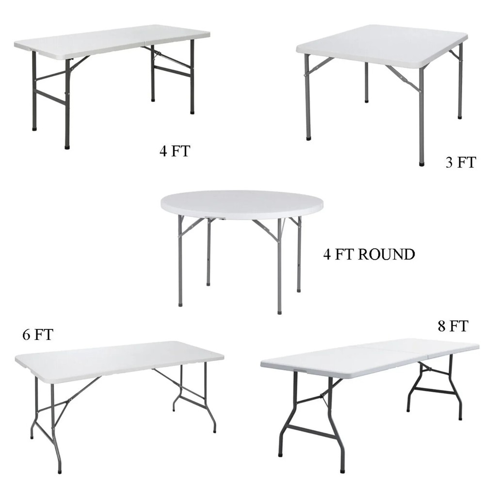 3 ft folding table Specifications: Color:White Item Weight:19.73lbs Product Size:33.66"*33.66"*28.94" Product material: Panel Material is HDPE The Metal Part Is Q195 Stainless Steel Sprayed Features: Heavy-duty blow-mold light grey resin top for durability and easy cleanup Resin surface is waterproof, scratch, and impact resistant, making this multipurpose utility table ideal for indoor or outdoor use Light grey powder-coated steel tube framing provides strong long-lasting use and lightweight portability Versatile surface option for parties, family reunions, trade shows, business meetings, reception areas, training rooms and banquet venues 4 ft folding table Features: High-quality Materials: 1.57" thick, the top of table is made of blow-molded high-density polyethylene,the surface is waterproof,Scratch & Stain Resistant,the steel legs are powder-coated for durability. Non-marring Rubber Feet: Includes non-marring foot caps to protect any floor surface from scratches or damage. Lightweight and Portable: Easy to carry indoors or outdoors,and can be folded,you can stored it in a closet or garage when not in use.with a carrying handle on the side for easy transportation. Easy to Clean and No Assemble: Just wipe it with a rag,you don't need assemble it, it can be used by just unfolding the legs. Wide Usage: It can be used daily family dining, outdoor exhibitions, assembly training, company meetings, children's learning ect. Specifications: Color:White Frame Material: Plastic Item Weight:19.4 LB Overall Size:48.4*24.2*28.9 in Folded Size:24.2*24*3 in Desktop thickness: 1.5 in Weight Capacity:300LB 6 ft folding table Specifications: Color:White Material: HDPE Item Weight:25.6lbs Load Capacity:220 lbs Product Size:70.9"*27.4"*28.6" Features: With folding legs that seats up to four adults. Perfect for both small and large spaces, use for everything from holding your everyday items to hosting your next seminar. DHPE white table top - waterproof, impact and stain resistant top - gray powder coated locking legs - protective floor caps Versatile surface option for parties, trade shows, solariums, reception areas, training rooms Ideal for family reunions, picnics, camping trips, buffets or barbecues. 8 ft folding table Features: Sturdy and Durable: With a durable yet lightweight powder coated steel base,also equipped with gravity locks and bolts for added stability and securing when not in use. Foldable Design: The collapsible legs secure into, allowing the table to fold in half for compact storage. The built-in carry handle provides effortless transport and portability. Multipurpose & Versatile: Folding tables cater to any event including birthday parties, holiday gatherings or outdoor barbecues in the summer,they can be dressed up or dressed down depending on your specific needs. Easy to Clean: The slightly textured tabletop is easy to clean as well as stain and scratch resistant, yet smooth enough to write on. Specifications: Color:White Material: HDPE+Q195 Steel Product Dimensions: 8ft(L) x 2.5ft(W) x 2.4ft(H) (unfolded) 47.3in(L) x 30in(W) x 3.5in(H)(folded) Desktop thickness: 1.73" Static Load Capacity:298 lbs Item Weight: 40.7lbs 4 ft round folding table Features: High Quality Material: This table is constructed of premium HDPE top and solid steel legs,it is impact and stain-resistant as well as waterproof and the table legs with rubber caps not only protect the floor but also prevent slipping. Foldable and Storage: The collapsible table legs can be stored in the slots of the foldable tabletop and fixed by the buckles. Only half of the tabletop area after folding saves your storage space. Lightweight and Portable: It folds in half with a carry handle, so you can easily take it out when you're camping or enjoying a day in the countryside. Stable and Strong: The lock is designed to further increase the stability and safety of the folding table. The thickened powder-coated steel pipe provides a strong weight capacity,it can hold up to 440lbs Wide Application: It can be used as a picnic table, dining table, barbecue side table, commercial table, or patio table or bring it with you on a camping trip, host a picnic party in your backyard, etc. Specifications: Color: White Material: HDPE, PP,Steel Item Weight:32lbs Overall Size: 48.2"x48.2"x29"(L x W x H) Folding Size: 48.2" x24.2" x 3.7"(L x W x H) Weight Capacity: 440LBs