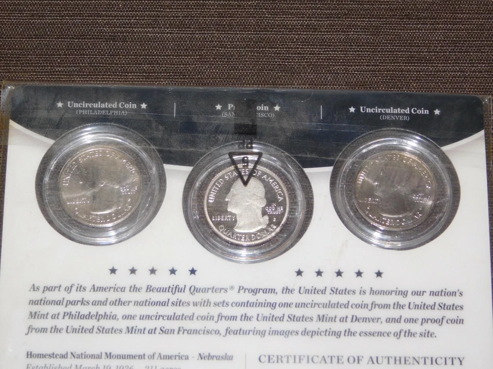 YOU ARE BIDDING ON............... .. US MINT 3 COIN SET 2015 AMERICA THE BEAUTIFUL QUARTERS HOMESTEAD NEBRASKA ....... SOME PACKAGE WEAR/LIGHT STAINS.......PLEASE VIEW PHOTOS FOR CONDITION.***PLEASE E-MAIL IF YOU HAVE A QUESTION OR WANT AN ADDITIONAL PICTURE....PLEASE VISIT MY EBAY STORE FOR ADDITIONAL VINTAGE ITEMS..THANK YOU***IV-BX3939-XXXX....