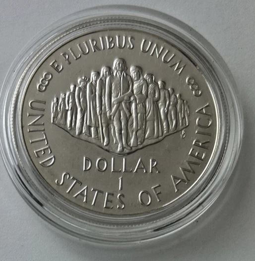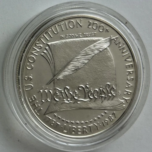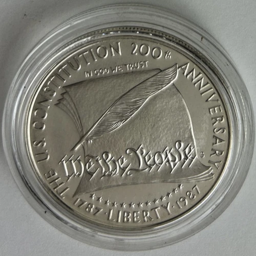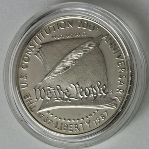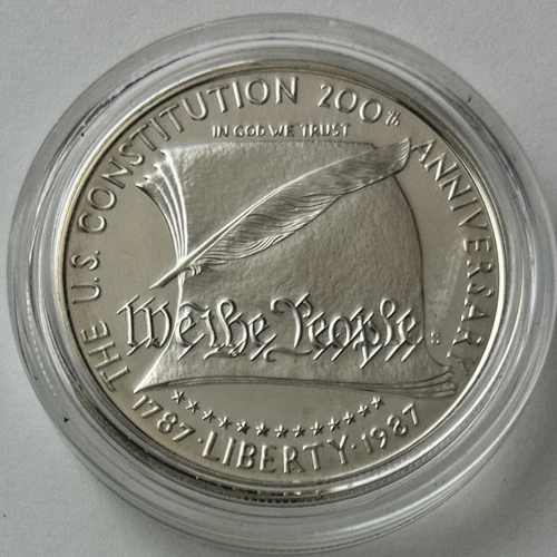 *US MINT* silver dollar "1987-S CONSTITUTION 200TH ANNIVERSARY" These photos show the actual coin you will receive as an uncirculated silver dollar from the United States Mint commemorating the 200th Anniversary of the US Constitution. Estate find listed as proof was produced from .900 silver by the San Francisco Mint in 1987 and comes encapsulated. Please study photos for your best assessment of condition. ***Good luck and bid with confidence - genuine quality merchandise from our 60 year shop collection!***