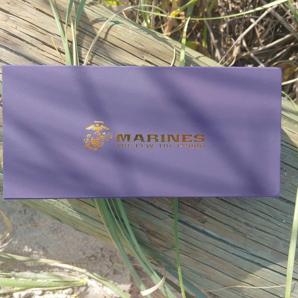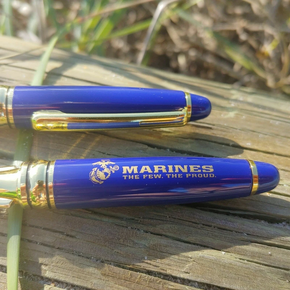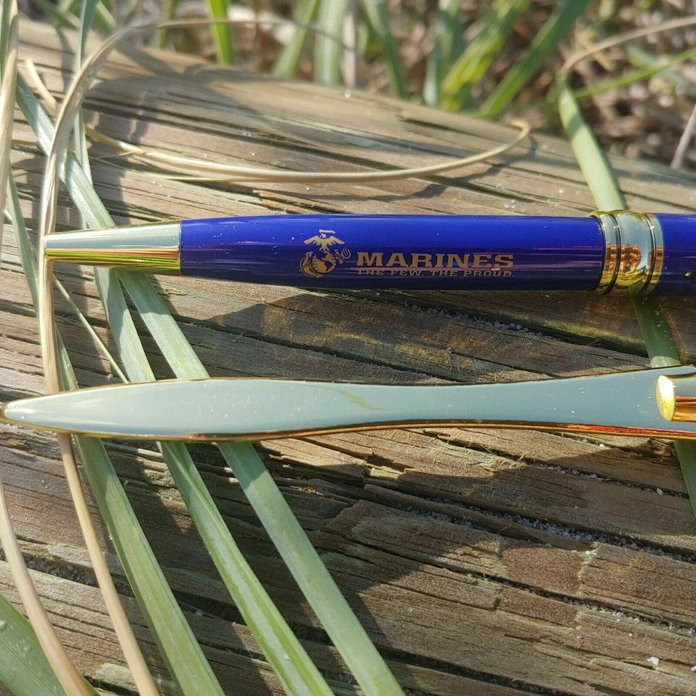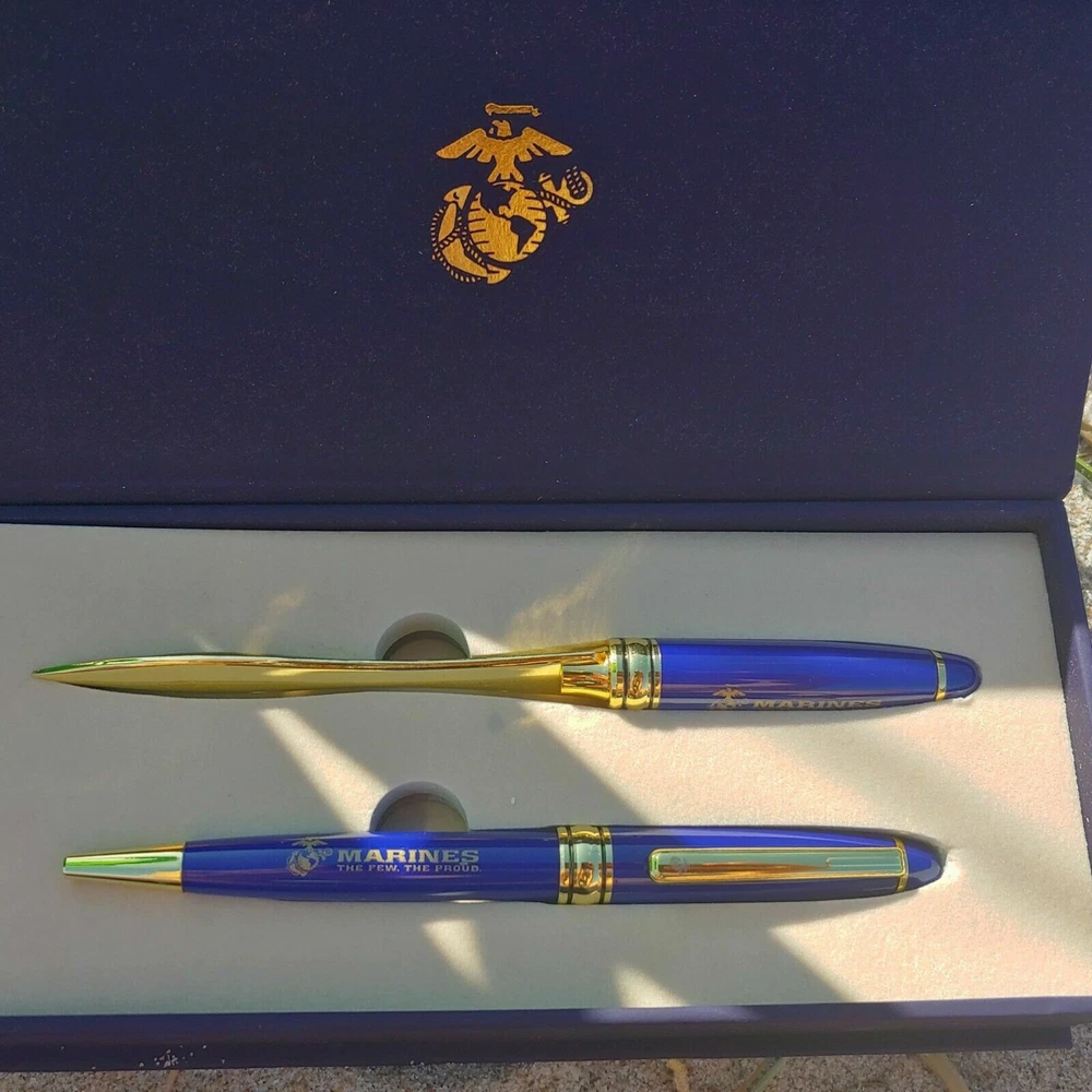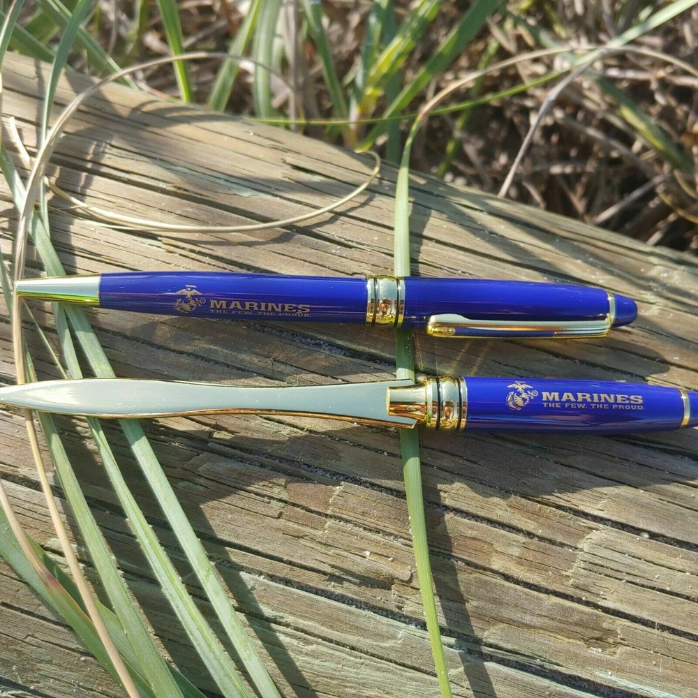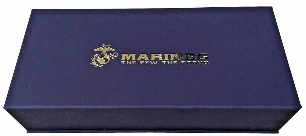 Description: US Marines Ballpoint Pen and Letter Opener Gift Set The Few, The Proud engraving on both pieces Officially licensed by USMC Beautiful Navy Blue with Gold inlay rich feeling gift set Large Size Cross Style Refill 5 1/2" overall Beautifully crafted set Marines logo on both the pen and letter opener Twist cap to reveal / hidden ballpoint tip Black Ink Refill Great Gift for a Service Member or a Veteran! Condition: Brand New BP 202